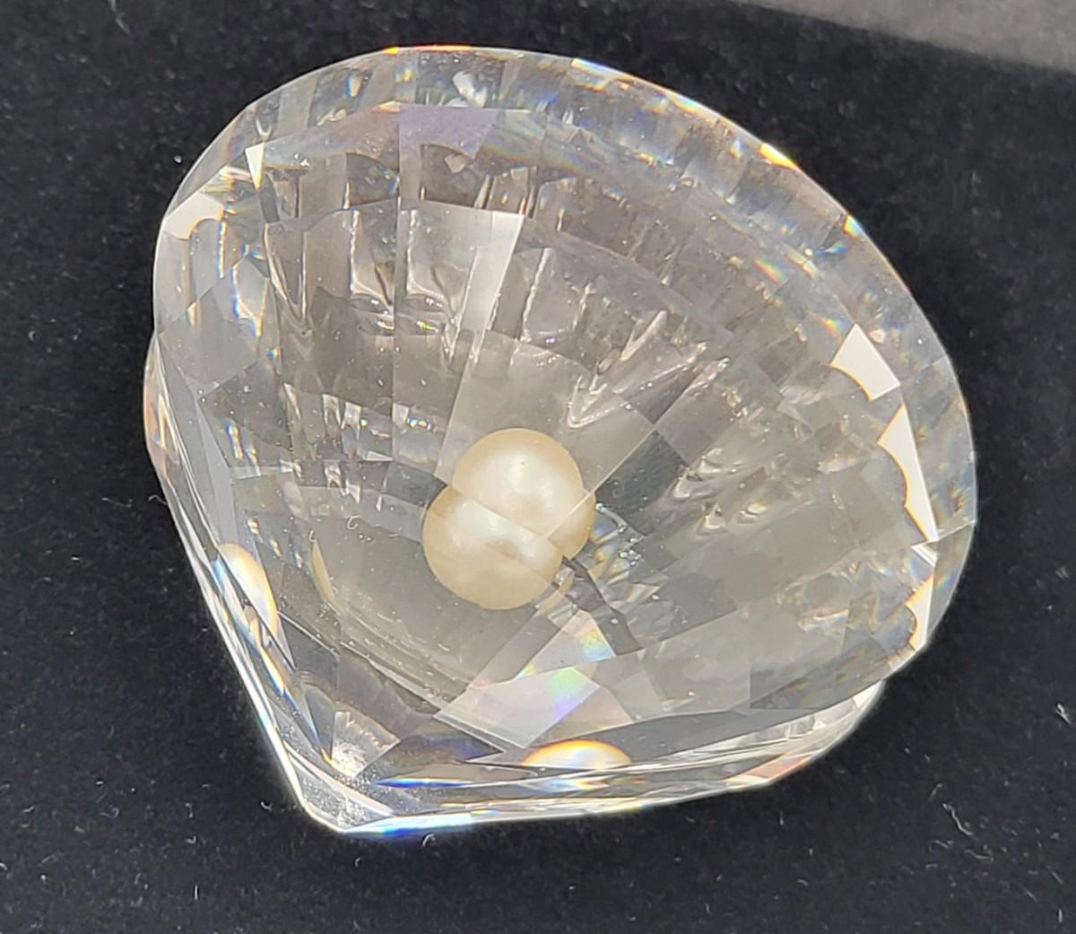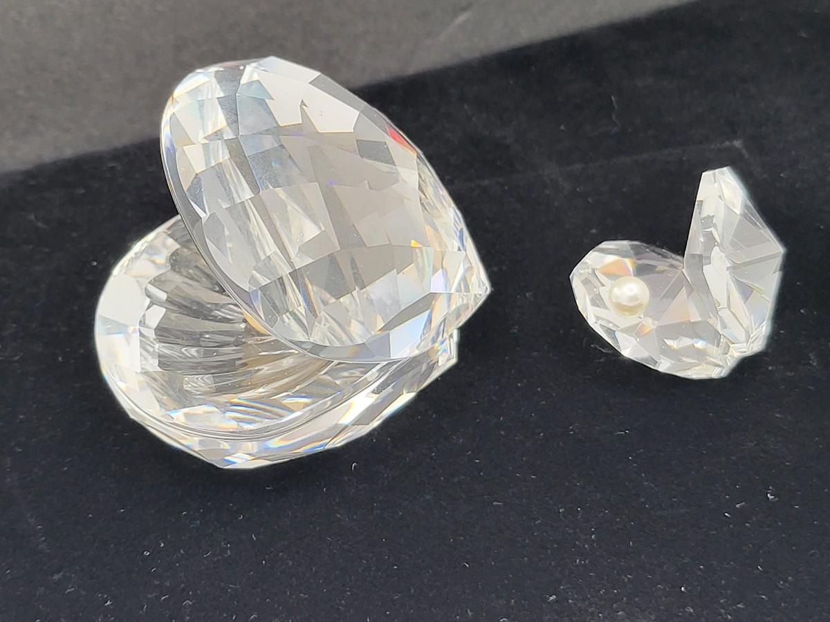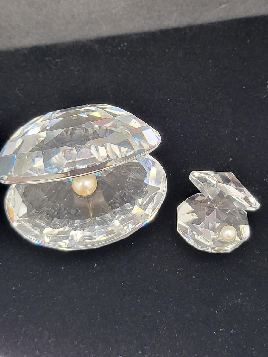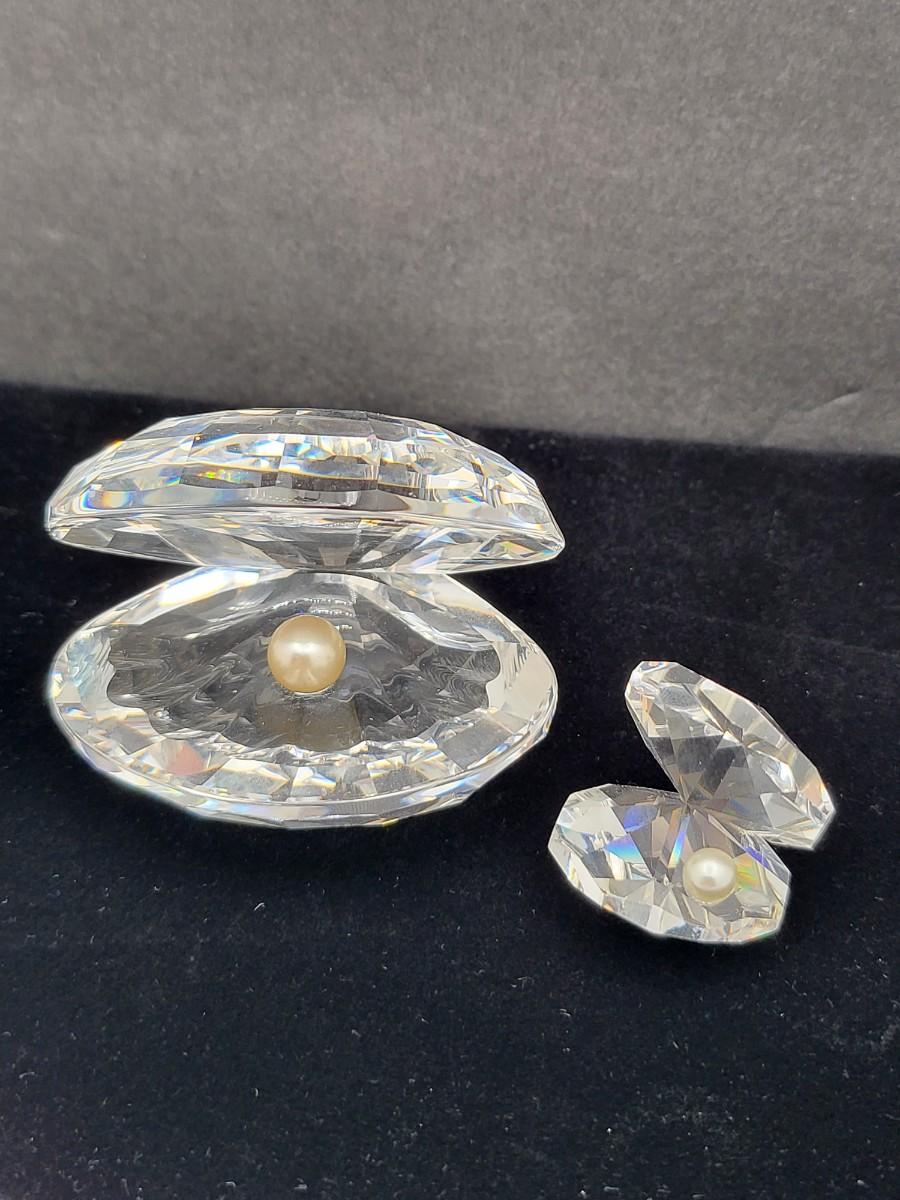 Gorgeous crystal Swarovski, large and mini clamshell figures. Both with faux pearl. Larger one measure 2.5" wide x 2.25" deep x 2" tall with swan mark. The smaller one is 1" long x 1" deep x 1.25" tall. Excellent condition. No box.
