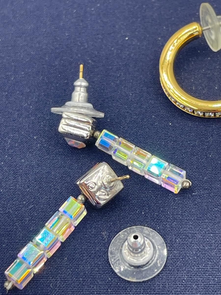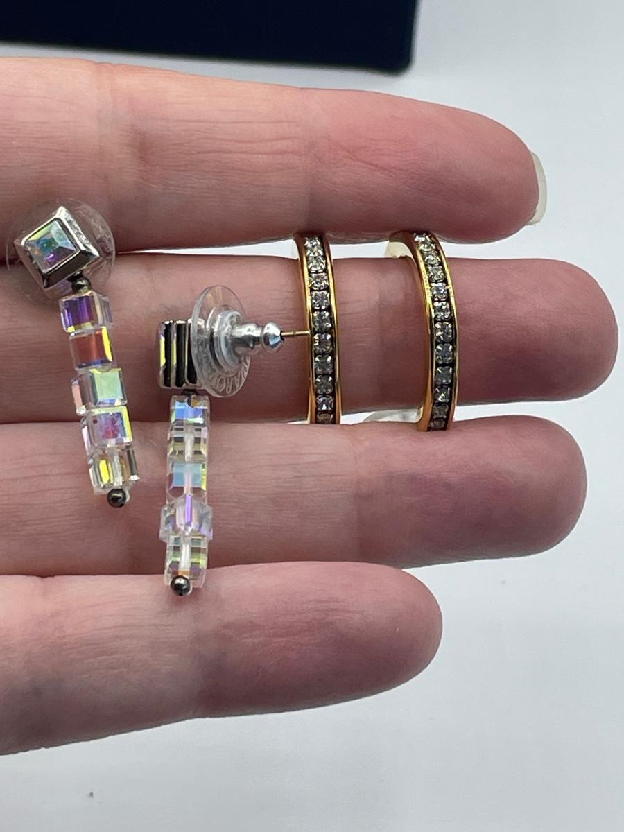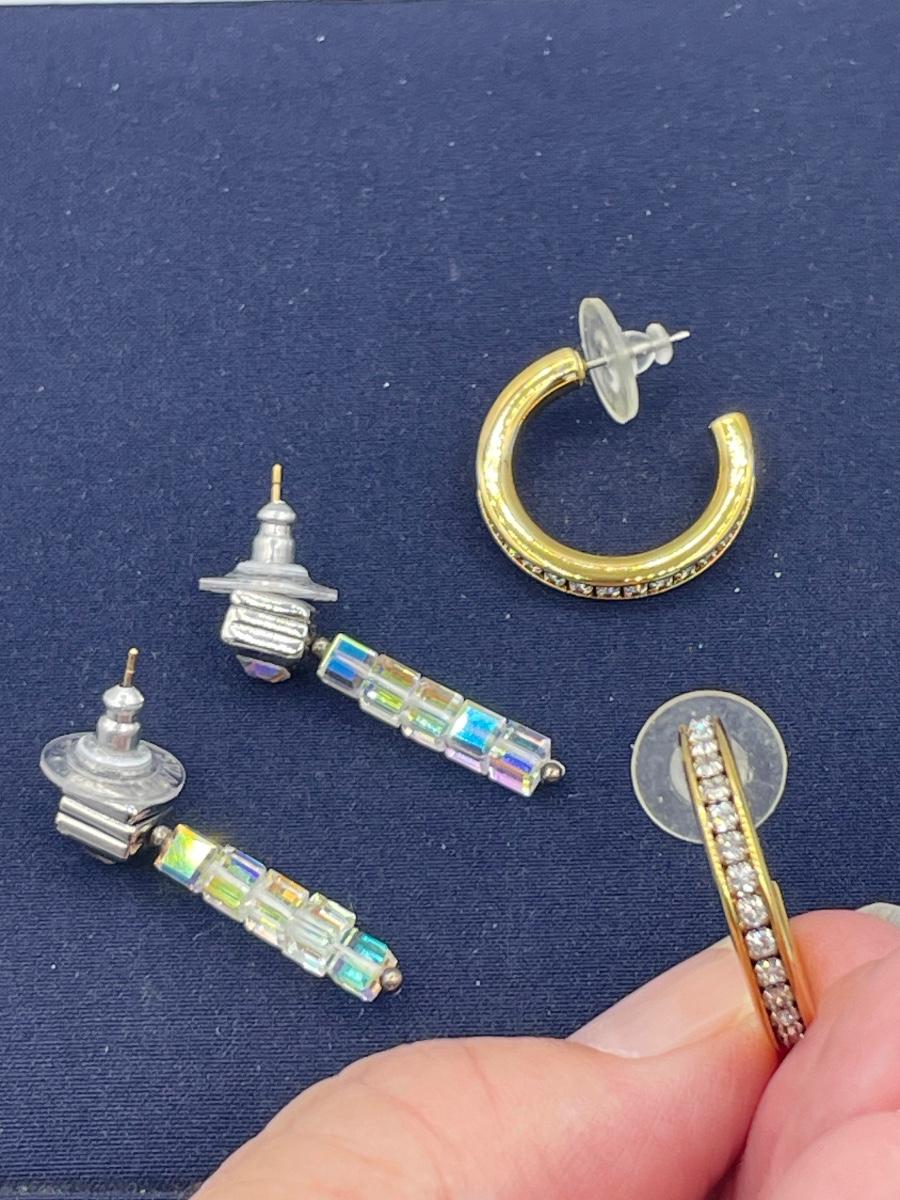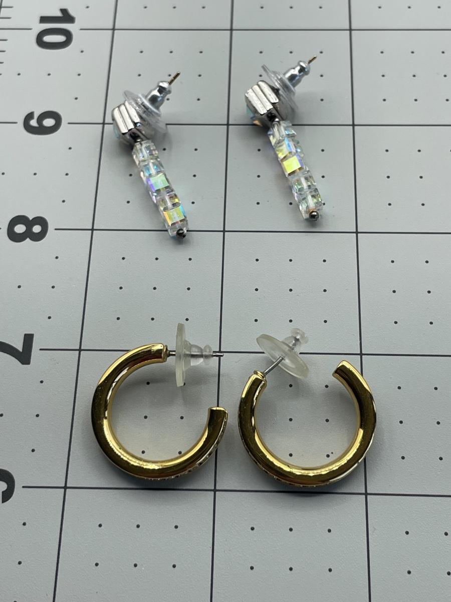 Long earrings have swan logo, hoop earrings are gold tone metal and unsigned.