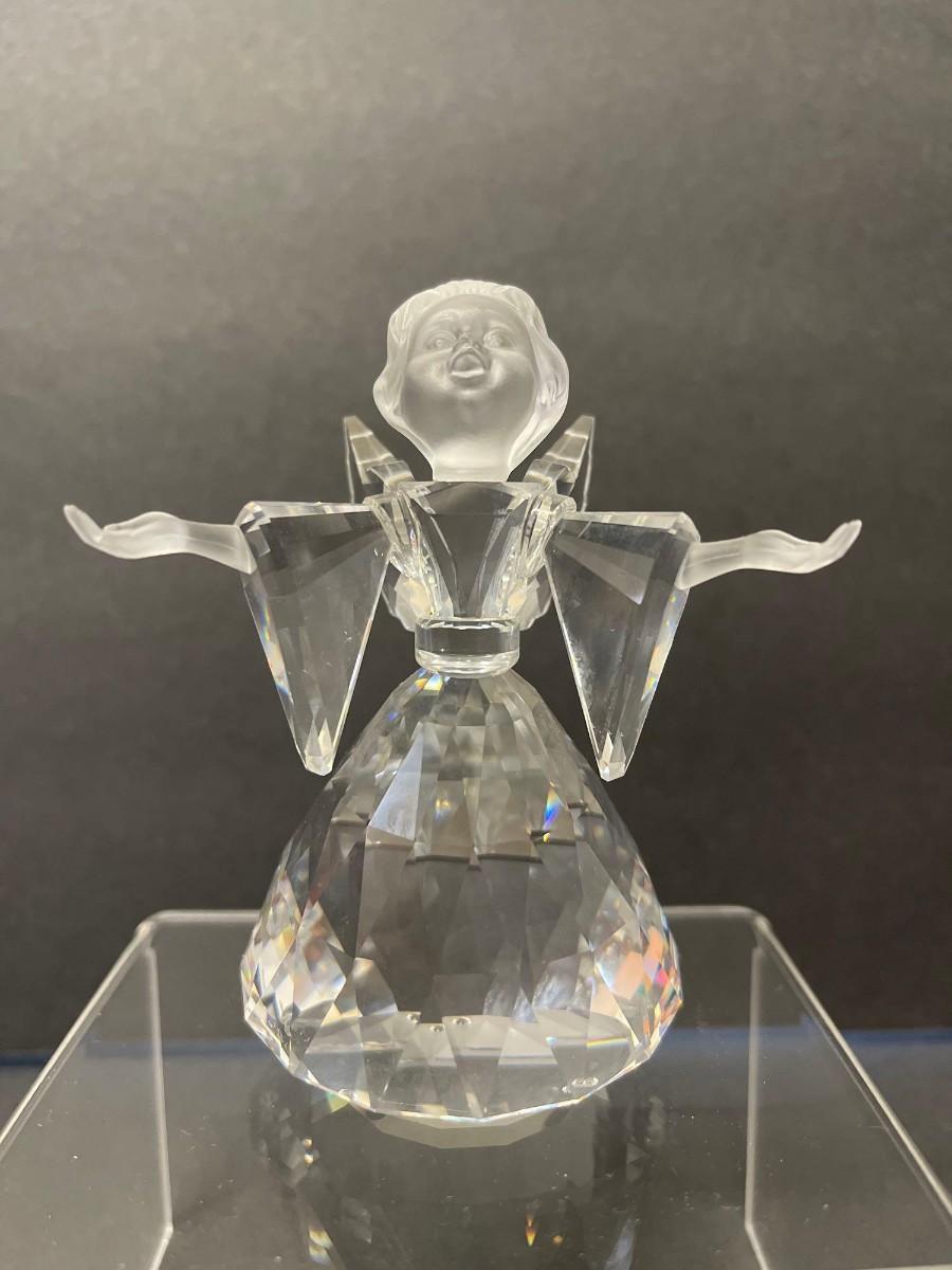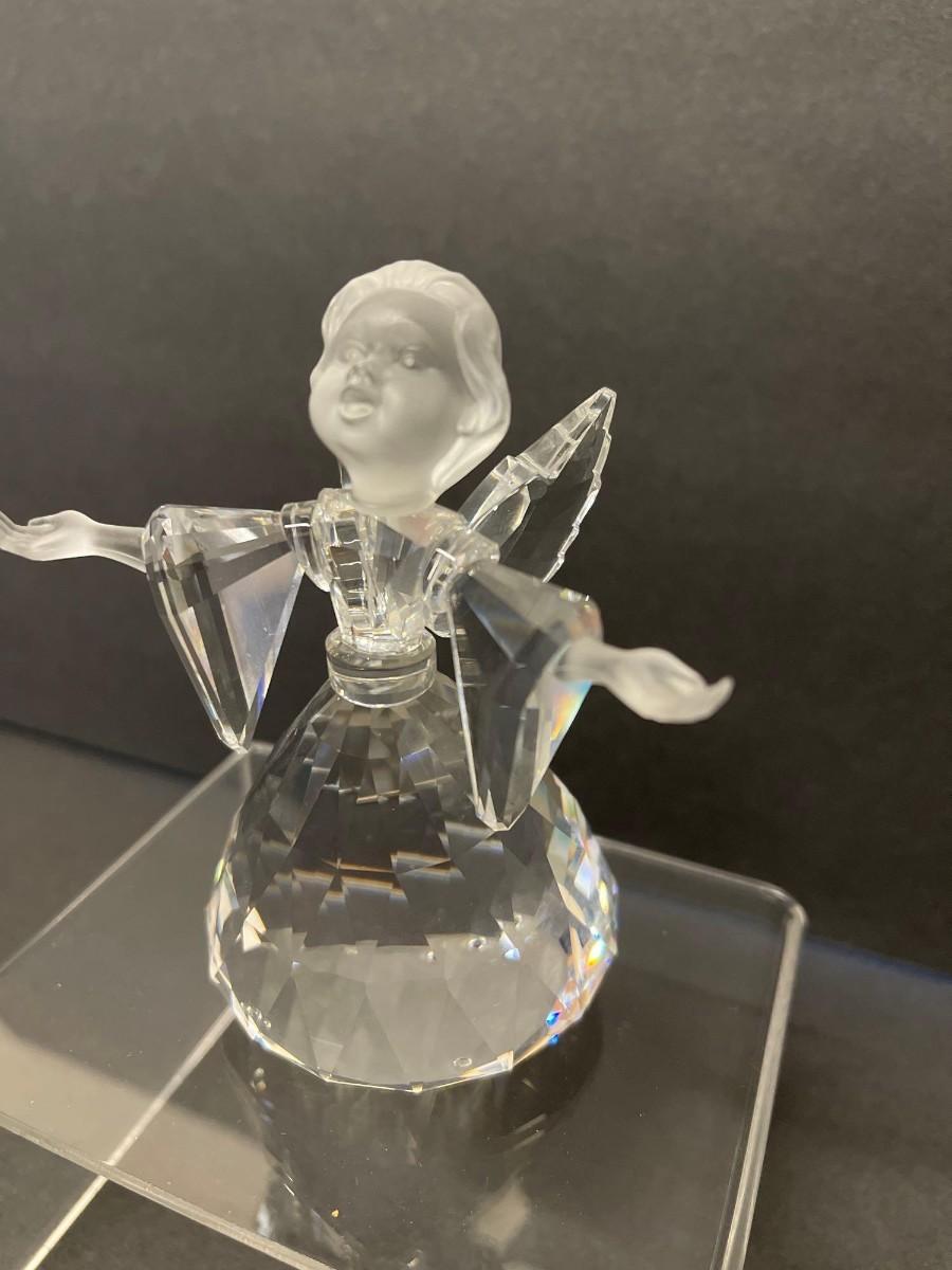 Swarovski crystal cheerful times angel figurine. Measures 3 3/4 inches high by 2 1/2 inches wide. Excellent condition does not include box.