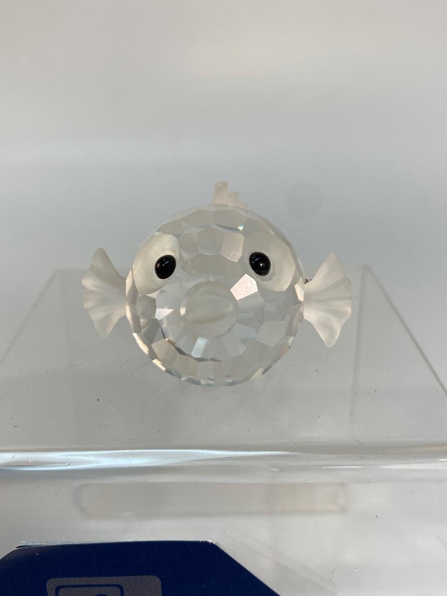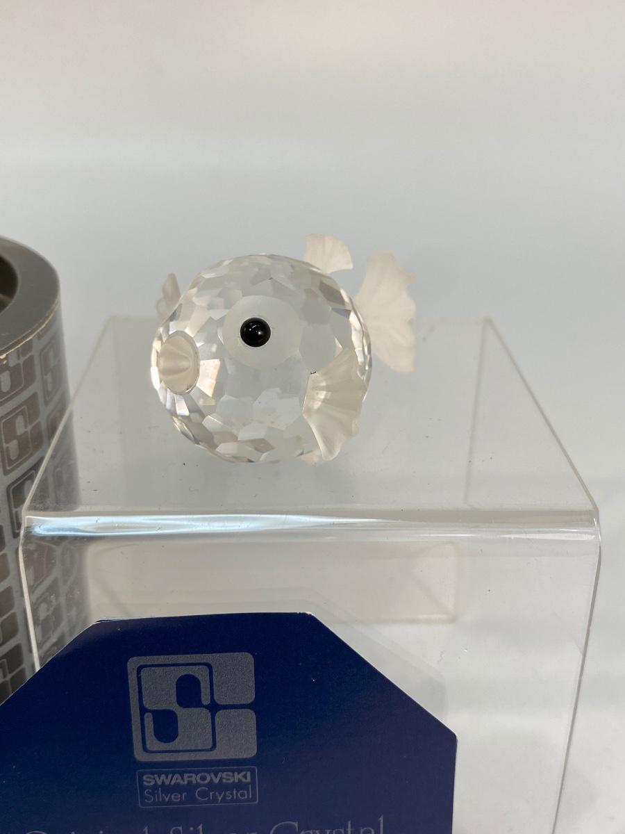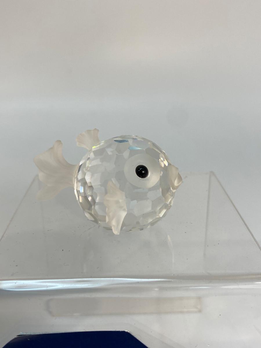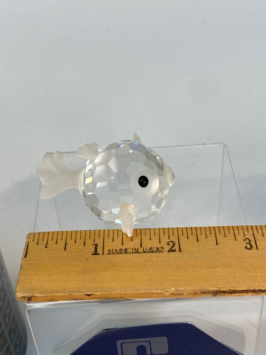 Swarovski Crystal Figurine Small South Sea Puffer Blowfish with Box. Fish is in good condition. About 2" size. Comes with cylinder box. Swarovski swan stamp on fish.