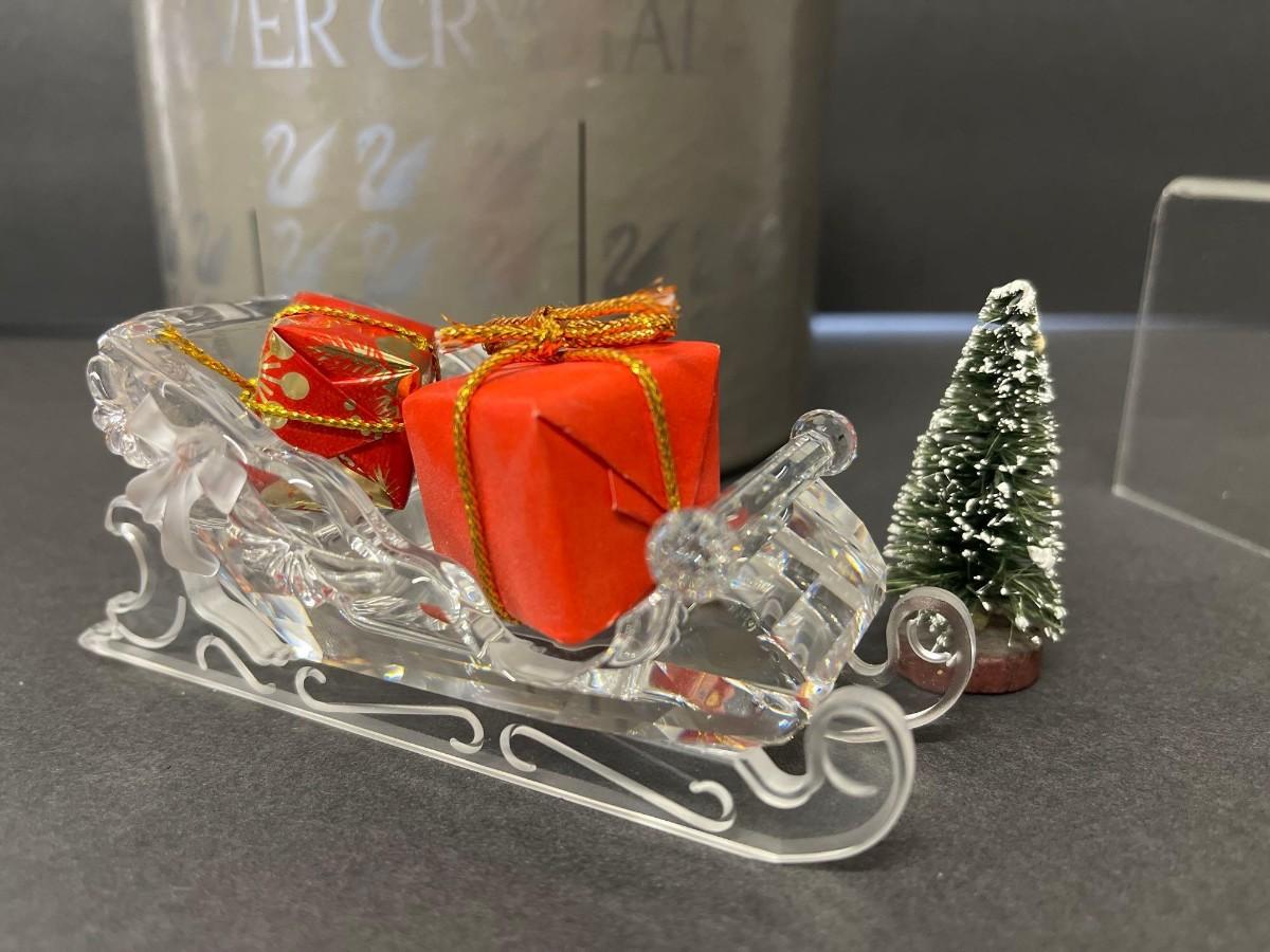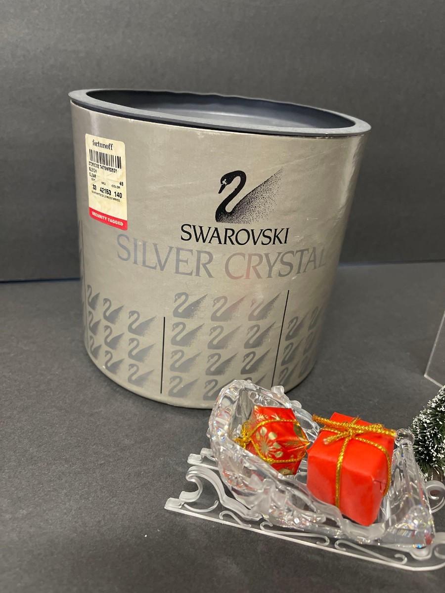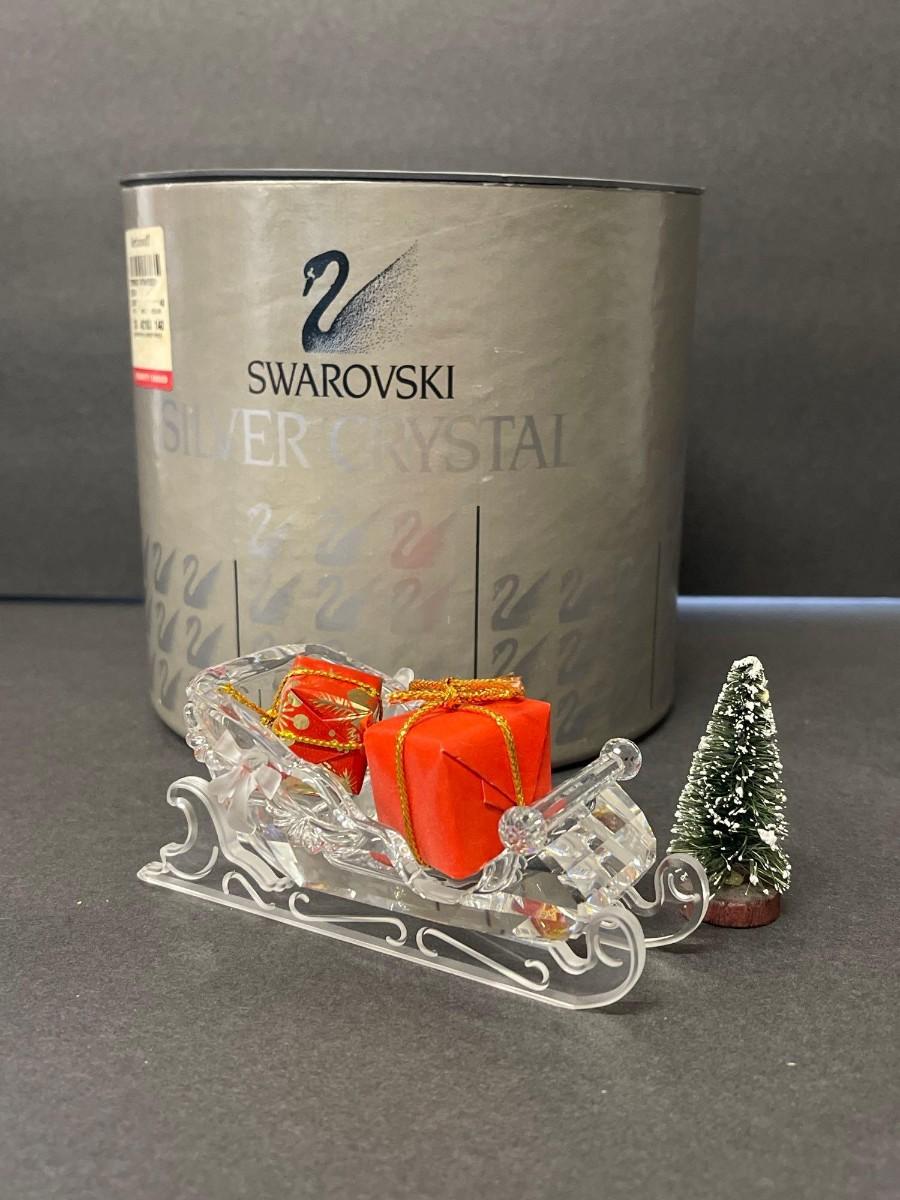 Swarovski crystal Santa Sleigh, complete with wrapped gifts and decorative tree. All in original box. 4” long. Excellent condition.