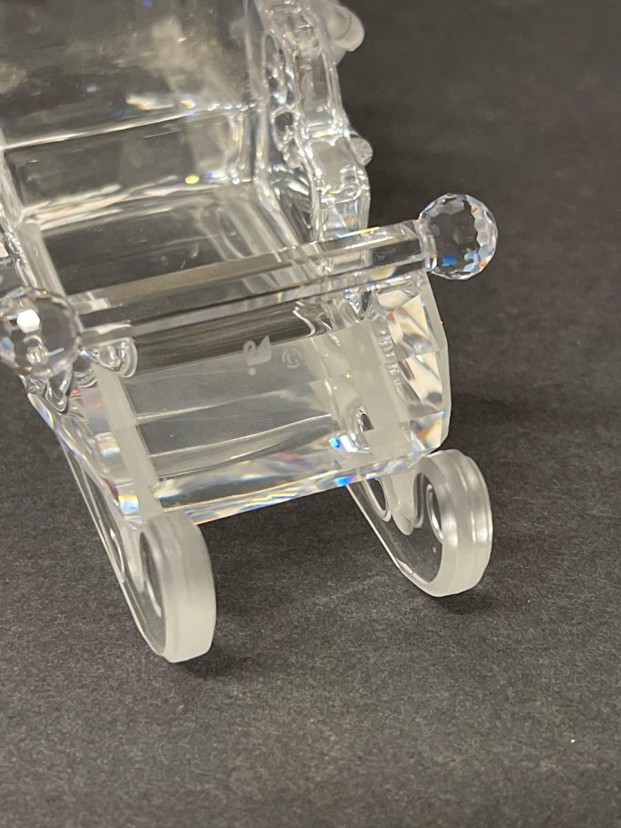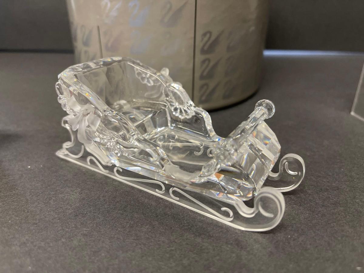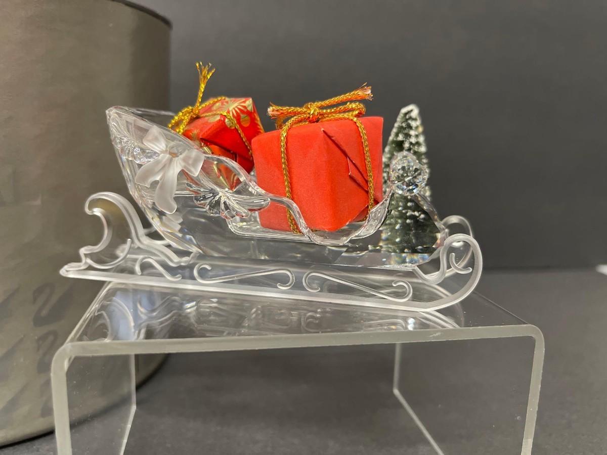 Swarovski crystal Santa Sleigh, complete with wrapped gifts and decorative tree. All in original box. 4” long. Excellent condition.