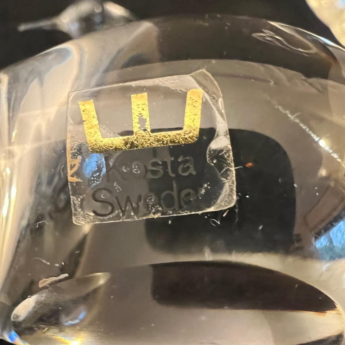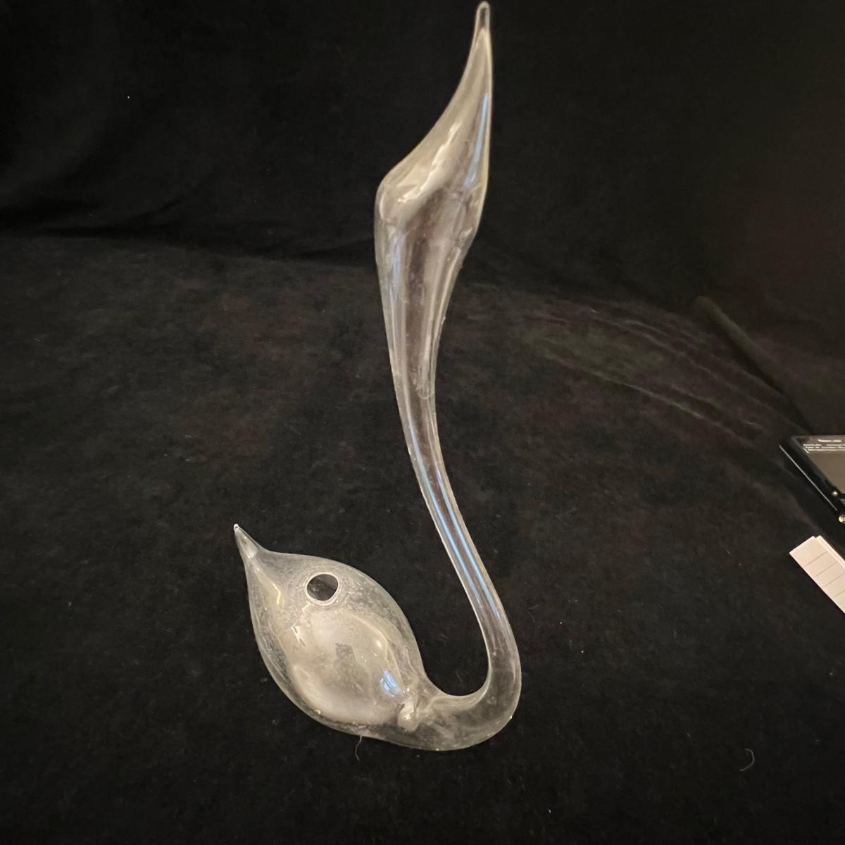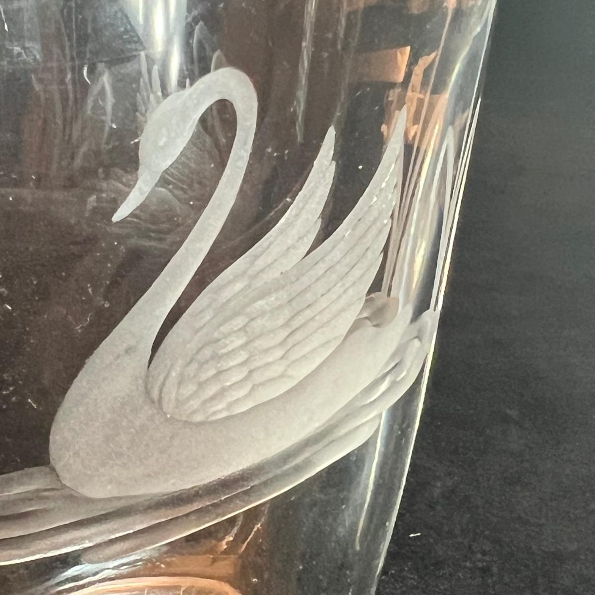 A collection of ten glass swans plus a signed glass vase with frosted glass swan. Includes a Swarovski crystal swan and a Kosta Boda swan, no other markings found on any others but the pair of pink glass swans and the swan with red are possibly Murano. The tallest swan is in fact a vase and has a hole in its back to fill, see images for the instructions to fill it, it measures 5” x 2.5” x 9”H. The smallest swan is the Swarovski at 2.5” x 1.5” x 2”H. The second smallest swan is the delicate, possibly handblown swan with white frosted wings, this figurine needs a very flat surface, but will stand by itself.