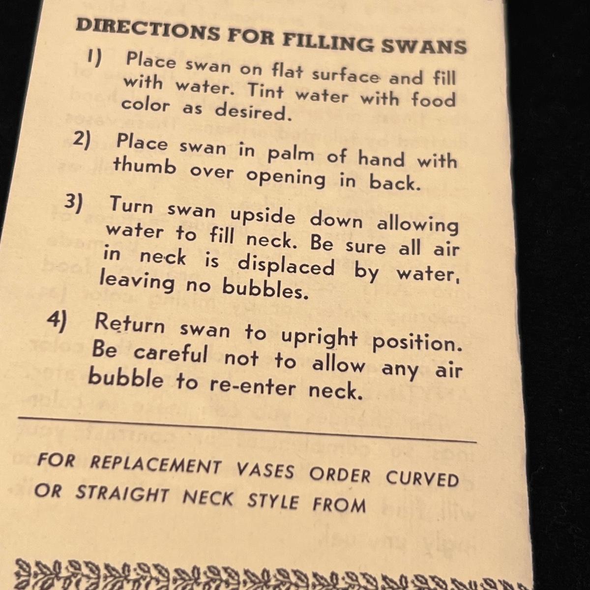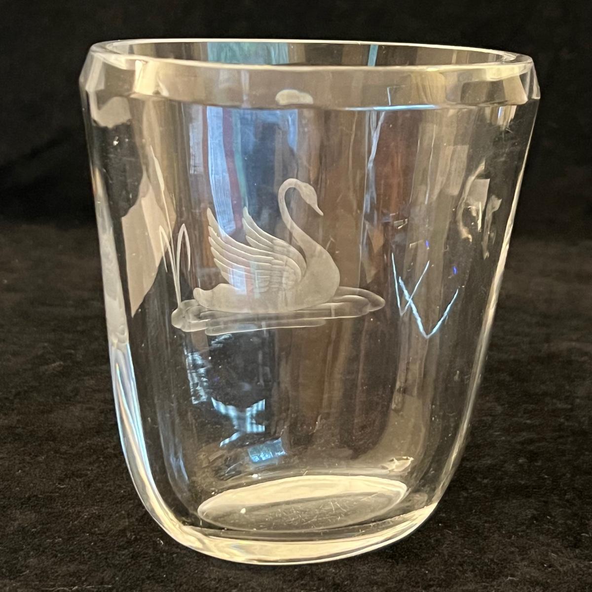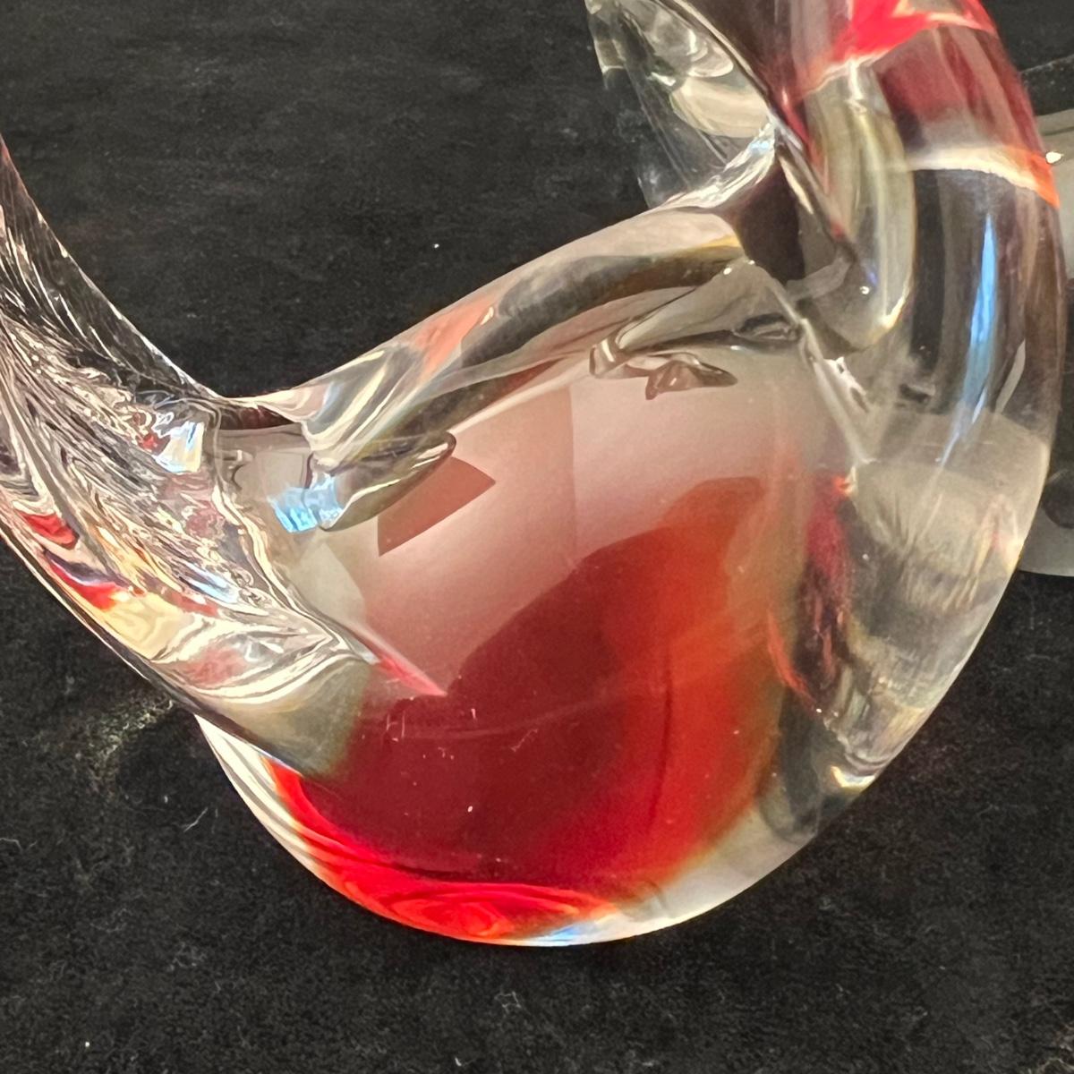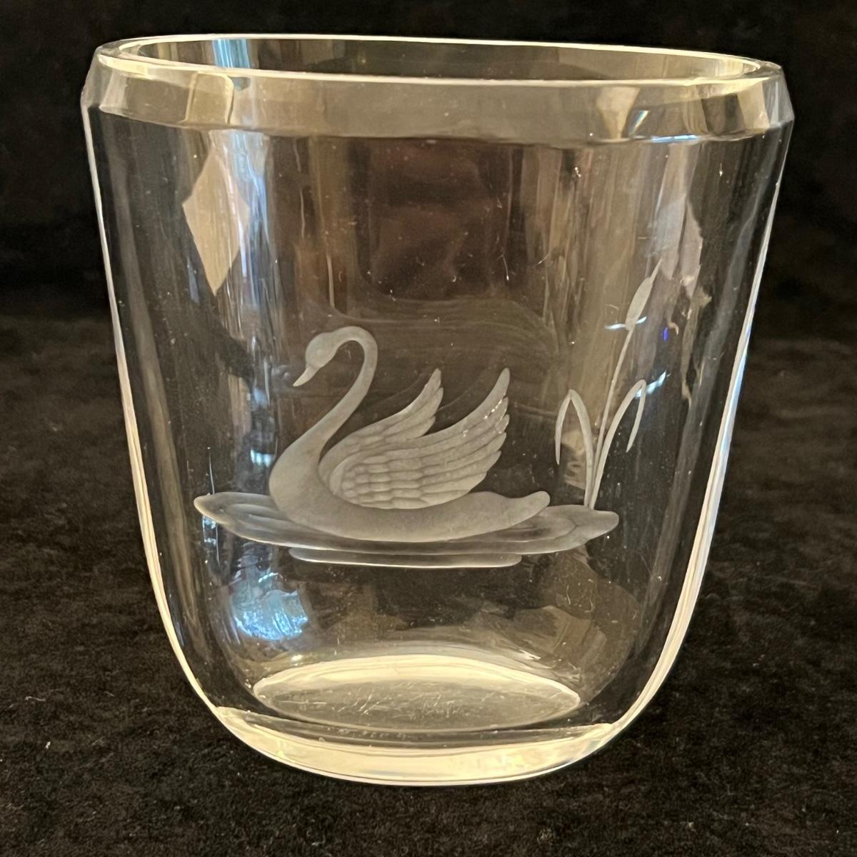 A collection of ten glass swans plus a signed glass vase with frosted glass swan. Includes a Swarovski crystal swan and a Kosta Boda swan, no other markings found on any others but the pair of pink glass swans and the swan with red are possibly Murano. The tallest swan is in fact a vase and has a hole in its back to fill, see images for the instructions to fill it, it measures 5” x 2.5” x 9”H. The smallest swan is the Swarovski at 2.5” x 1.5” x 2”H. The second smallest swan is the delicate, possibly handblown swan with white frosted wings, this figurine needs a very flat surface, but will stand by itself.