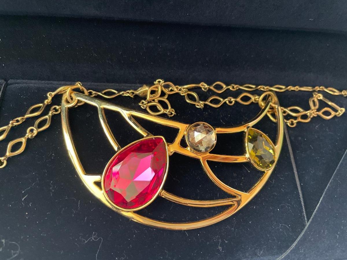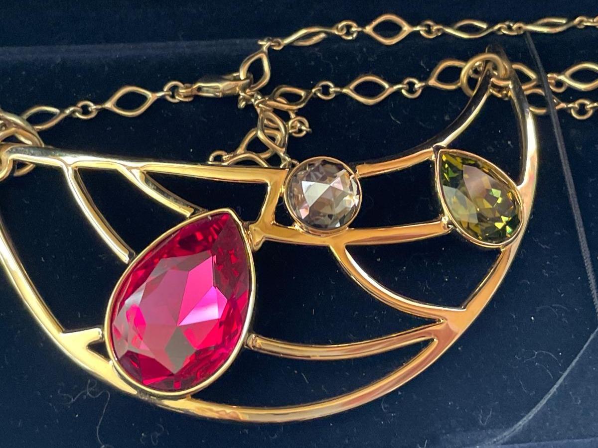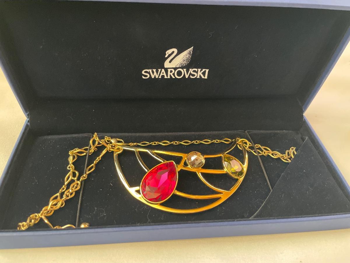 Swarovski large gold tone necklace with red and green crystals