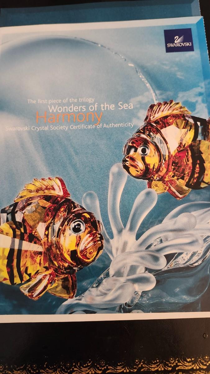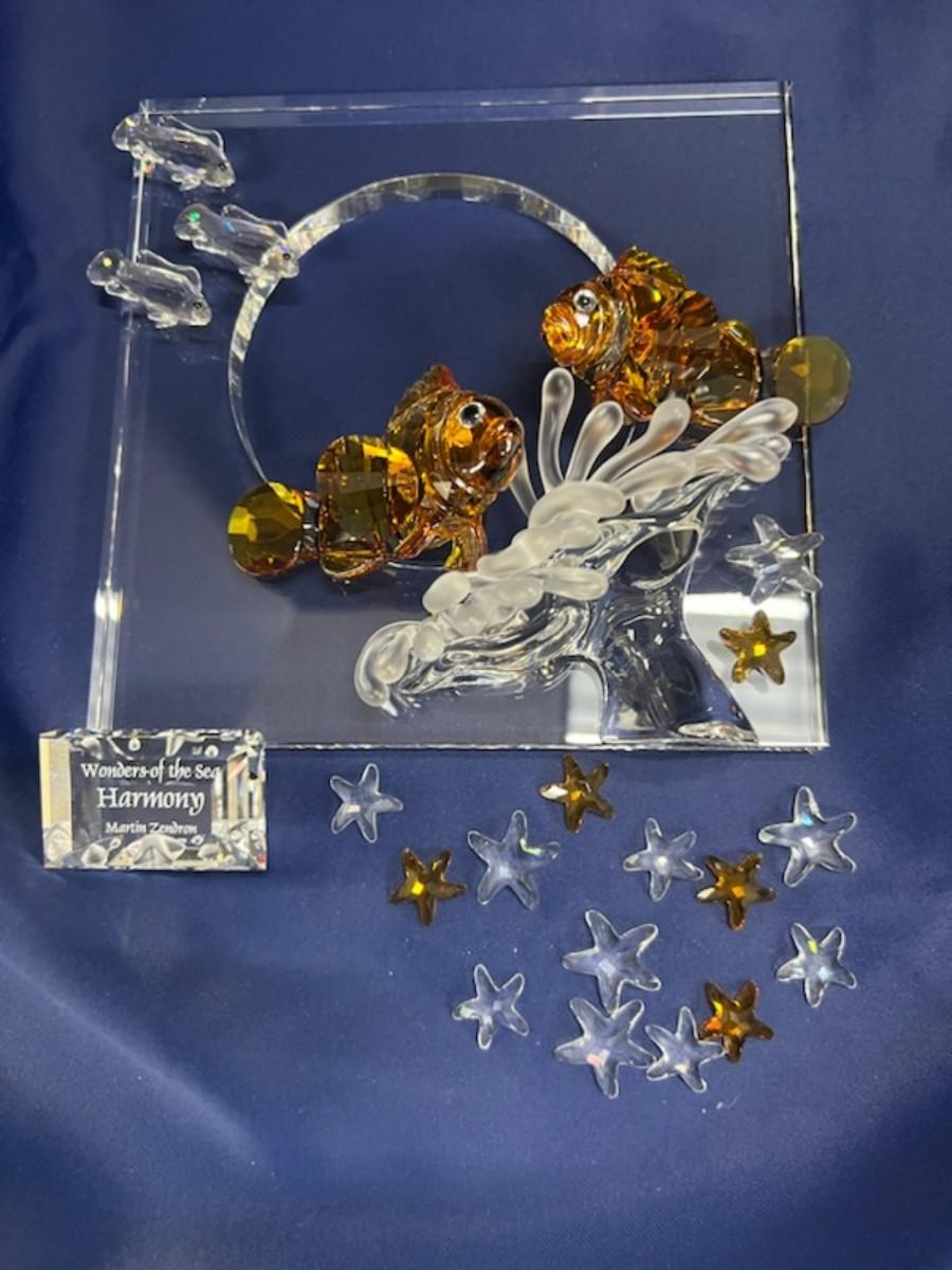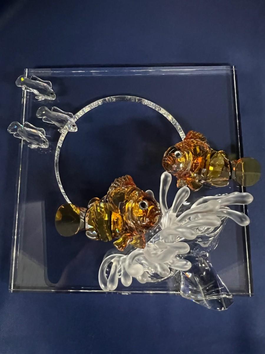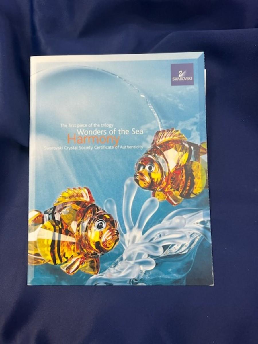 Hallmarked with Swarovski acid stamped mark, Featuring clear fish, topaz clown fish and matt crystal anemone on display stand. Rare and collectible. Includes nameplate, box of small starfish, and the base. Looks new.