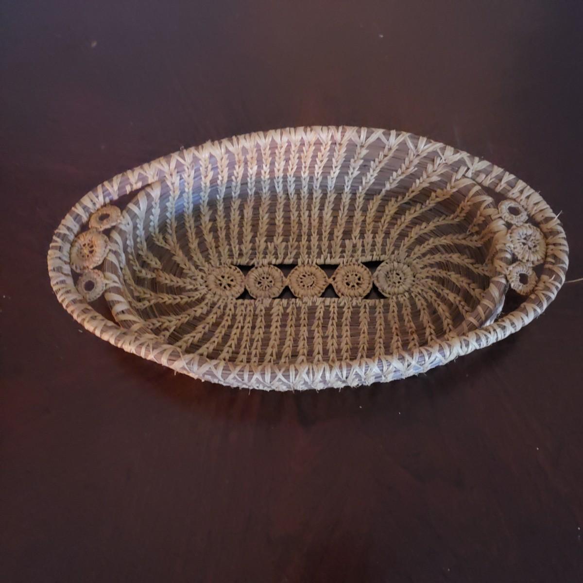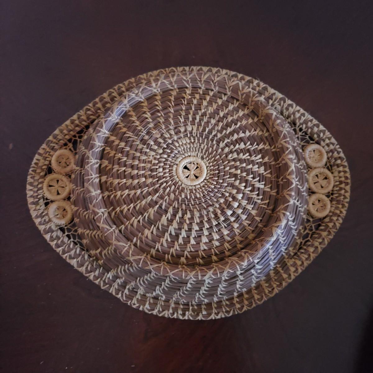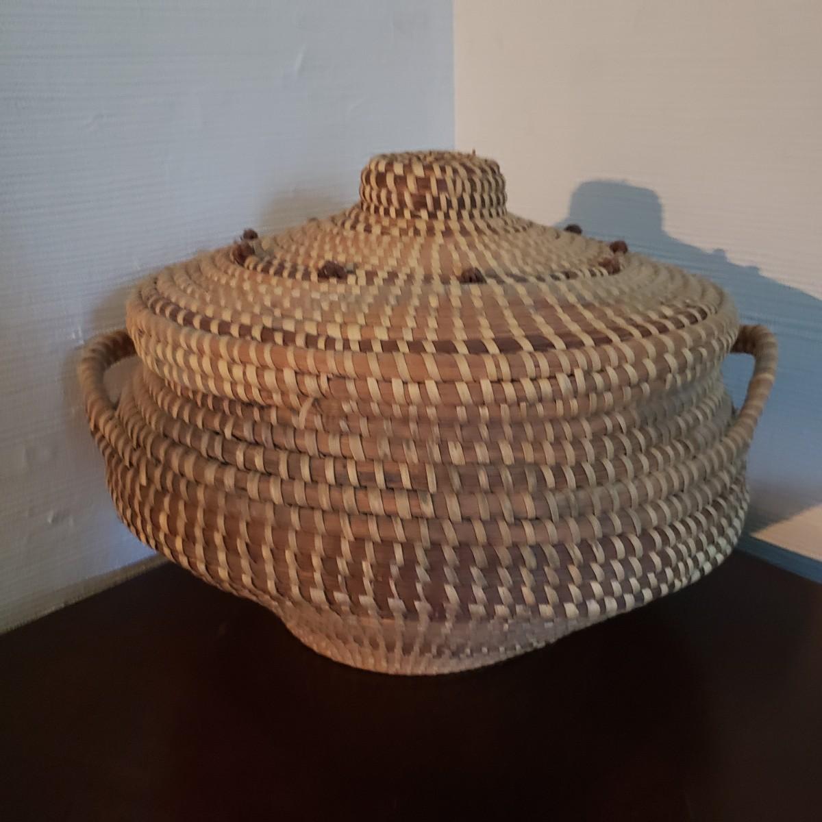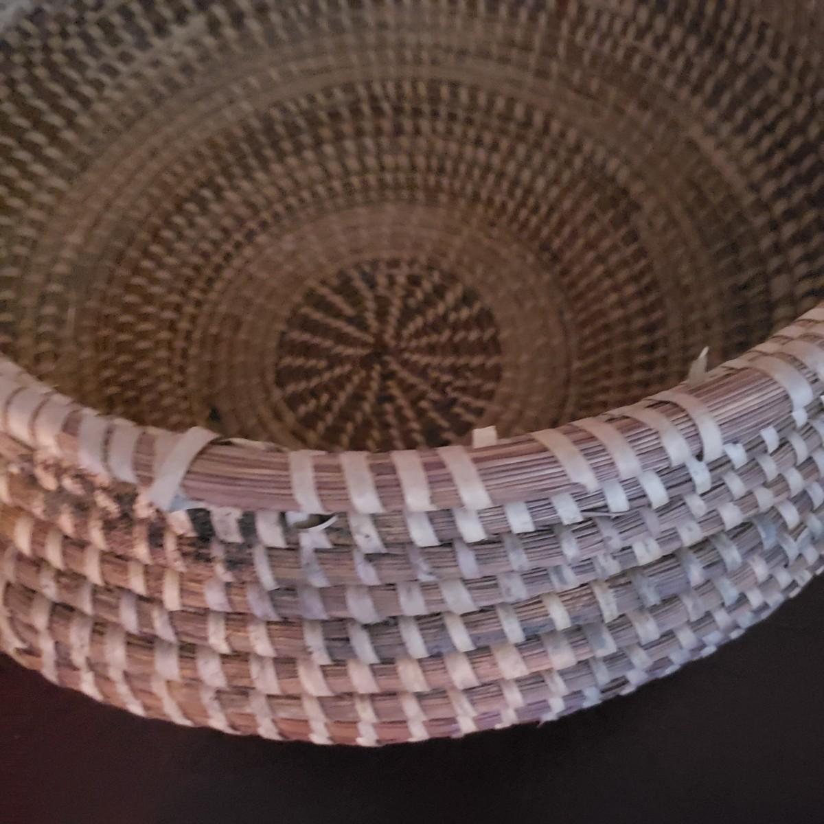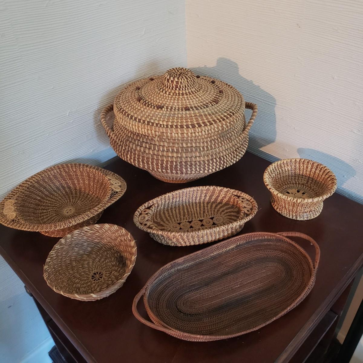 This six piece lot features five sweet grass baskets and one similar styled basket. The large basket with lid measures 16" x 11"H. The other four baskets have a sweet ornate floral type weaving to the bottoms and/or handles that we've never seen!