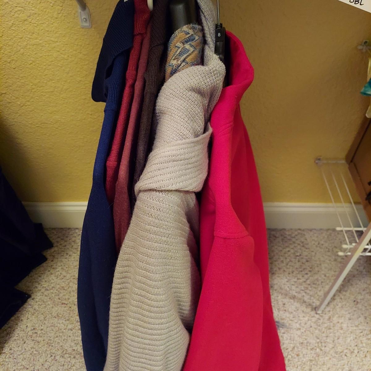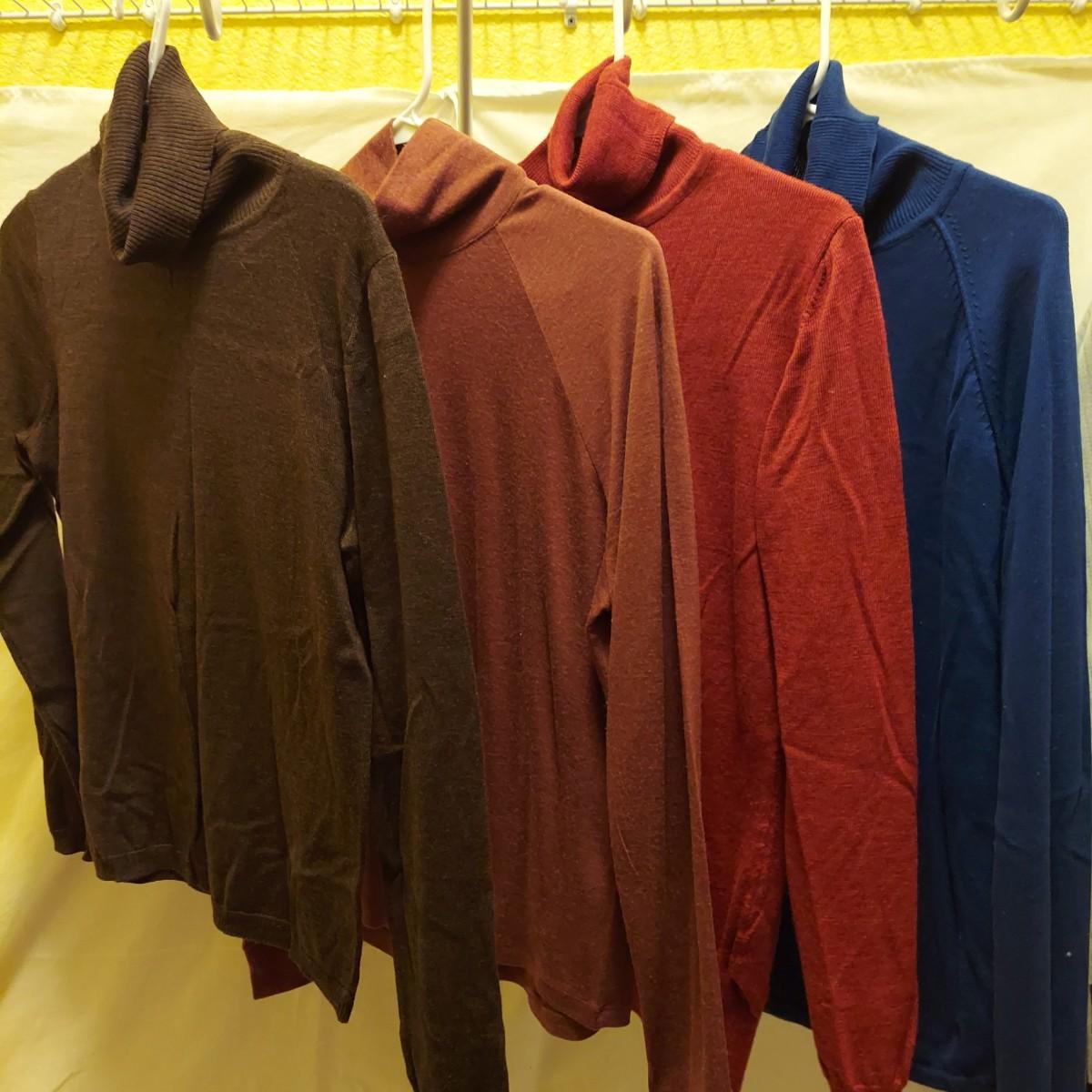 This lot includes four lightweight knit turtlenecks and four oversized shawl wraps. Plus a size 0 Chicos dress coat. The sweaters are mostly size Small. The wraps are sizeless. Some pieces are new with tags. Shipping available