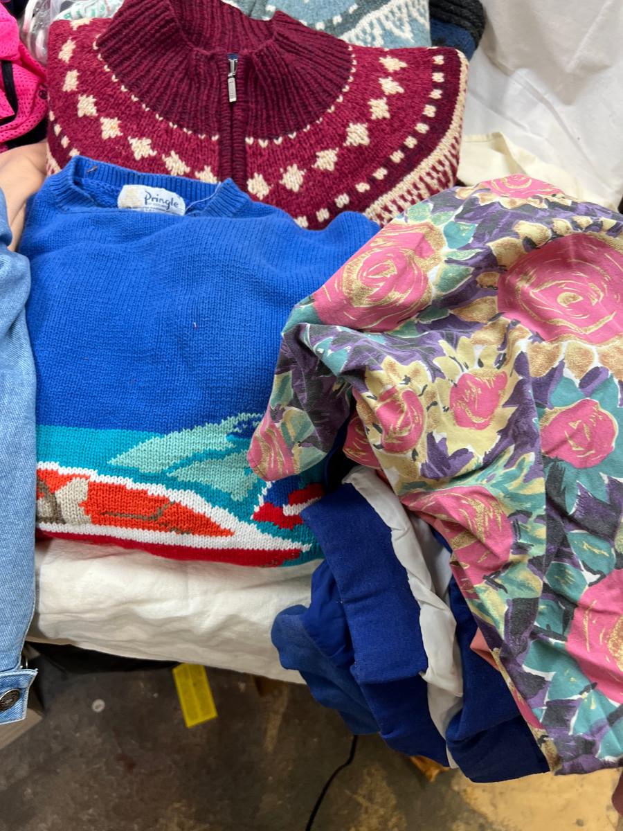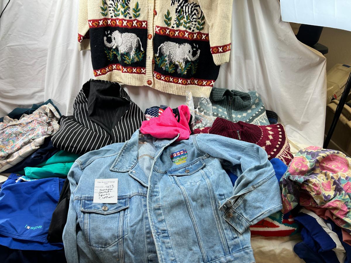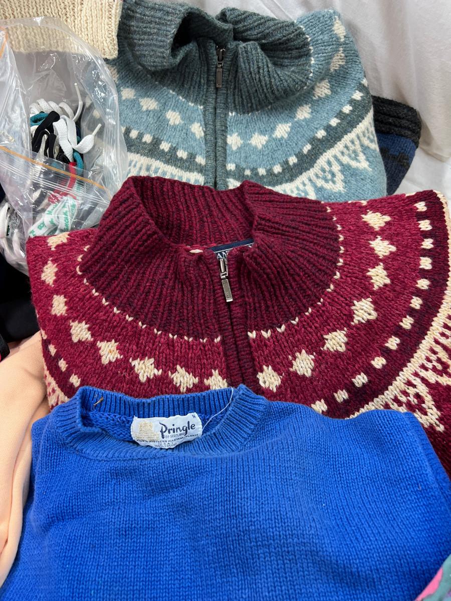 Nike athletic gear, Lands end Nordic sweaters, LS 1980s chain jacket black and white stripe.Elephant hand made sweater.