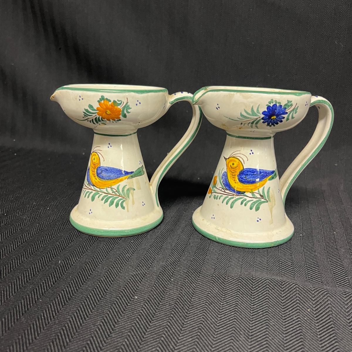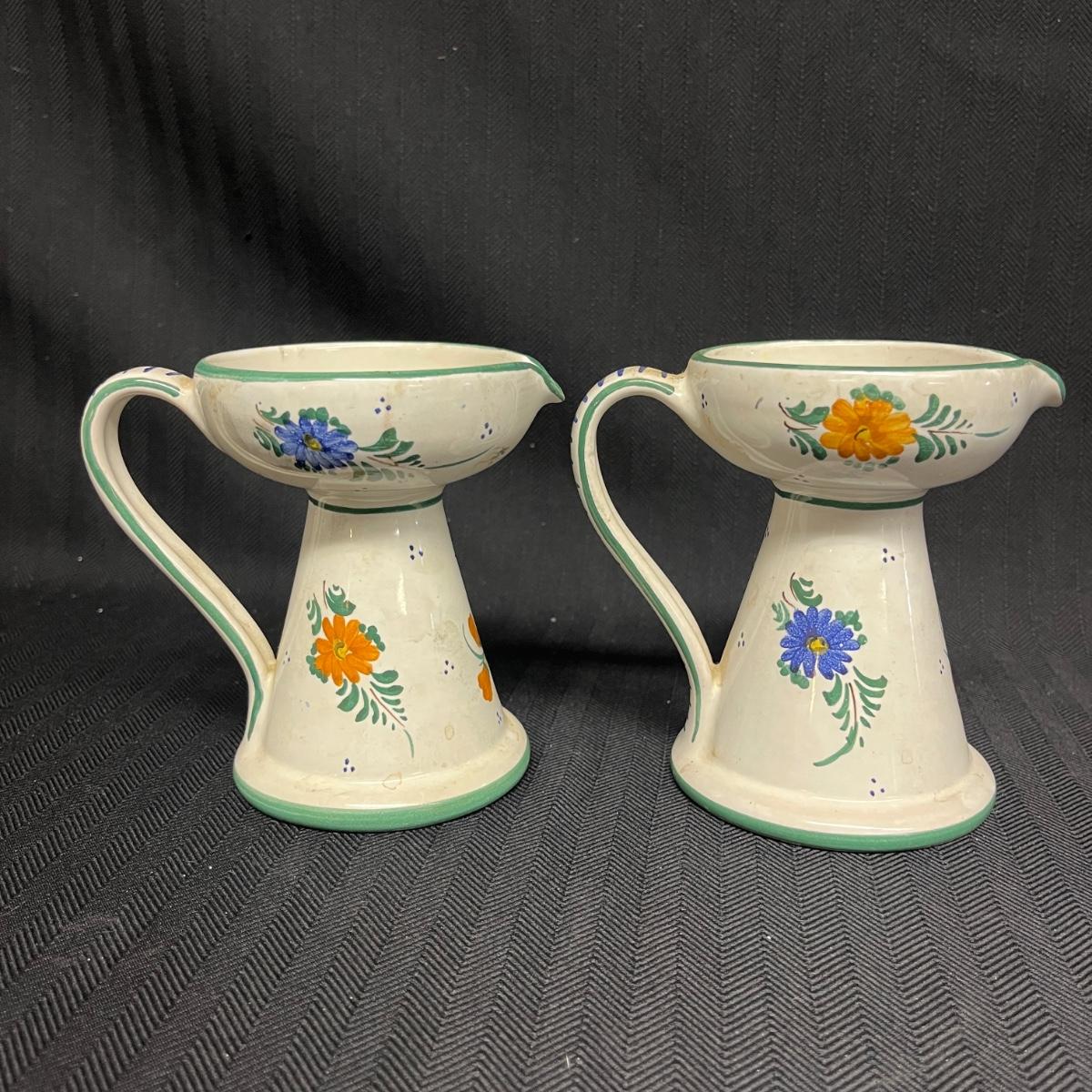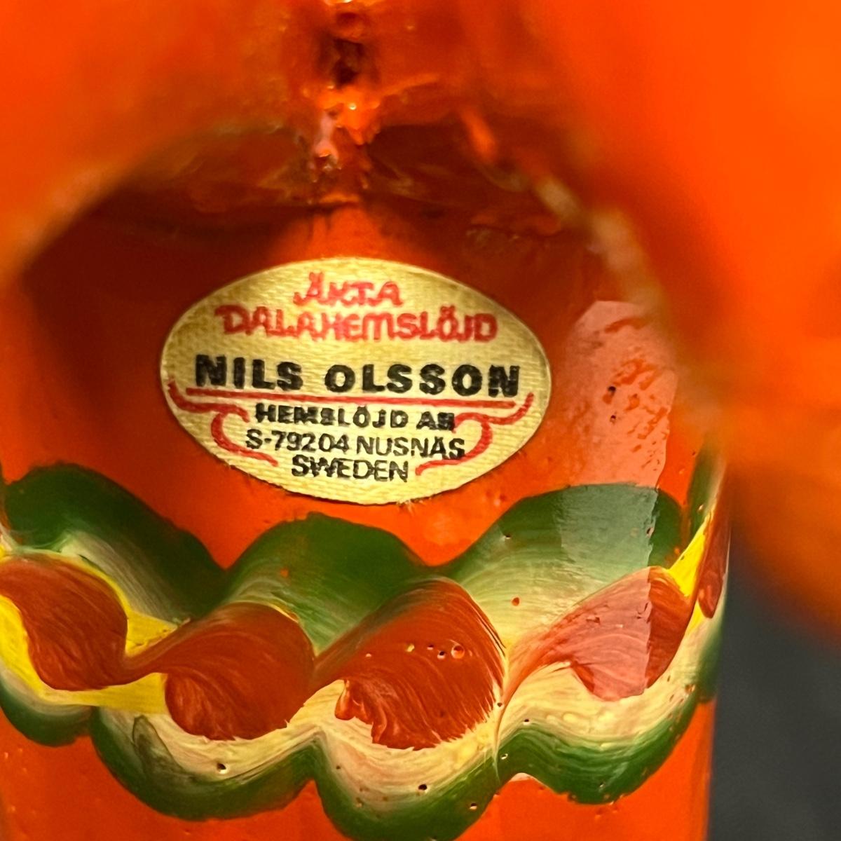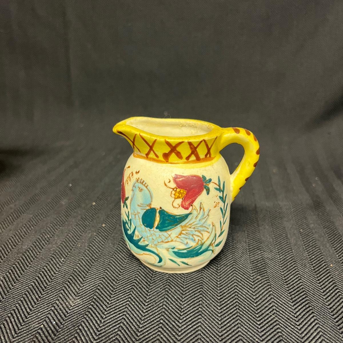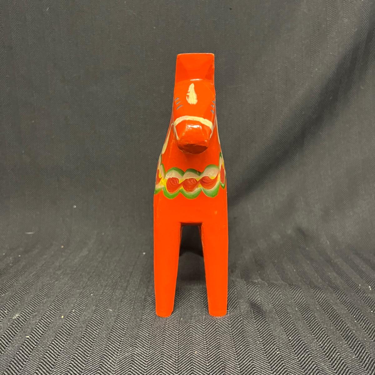 Lot includes a wooden Swedish Dala horse by Nila Olson, two ceramic candleholders, small ceramic jug and pitcher. Horse measures 6” x 2” x 7”H.