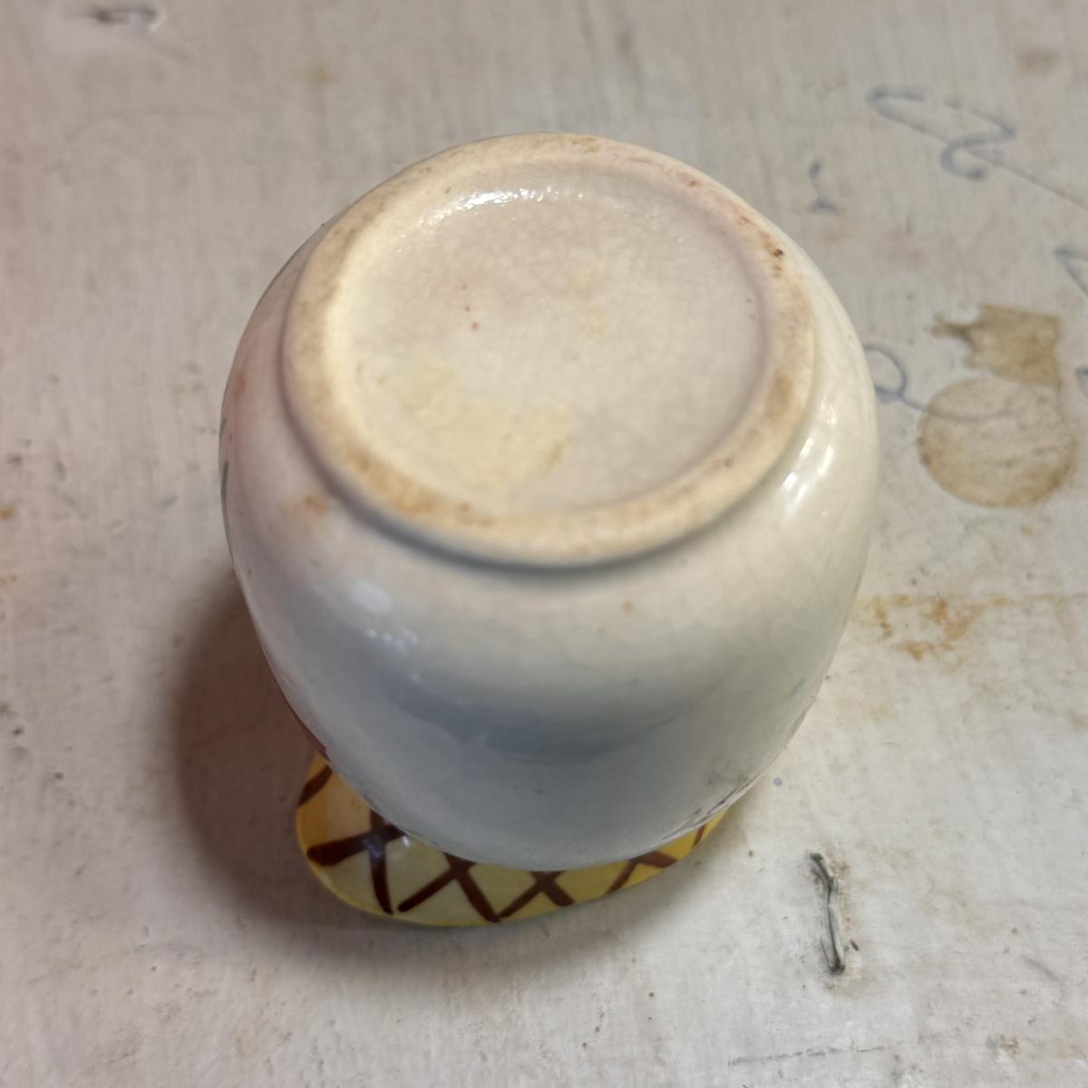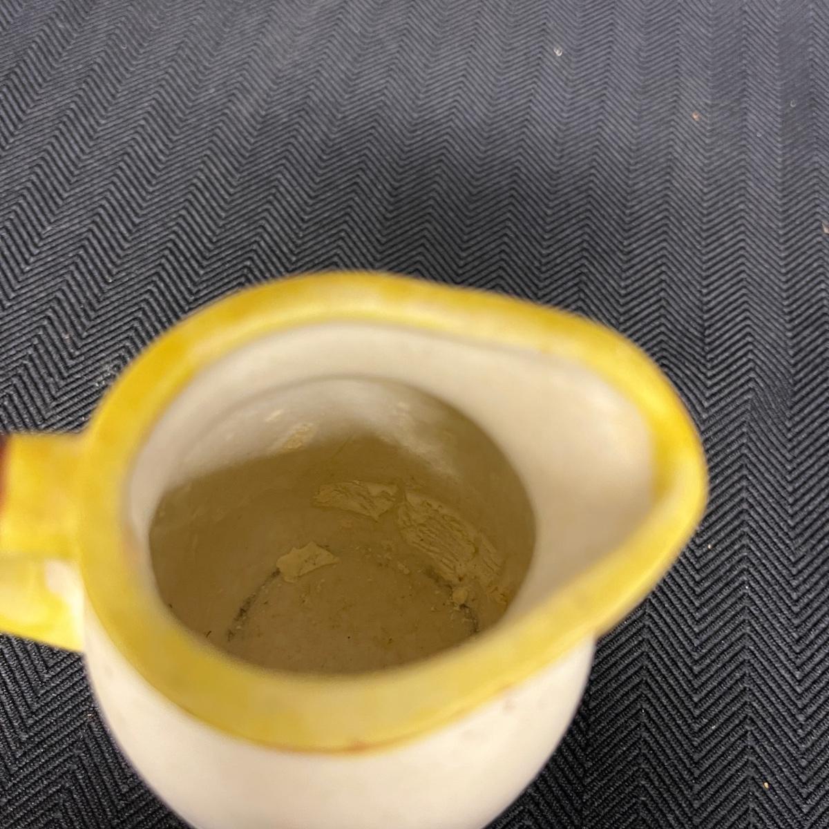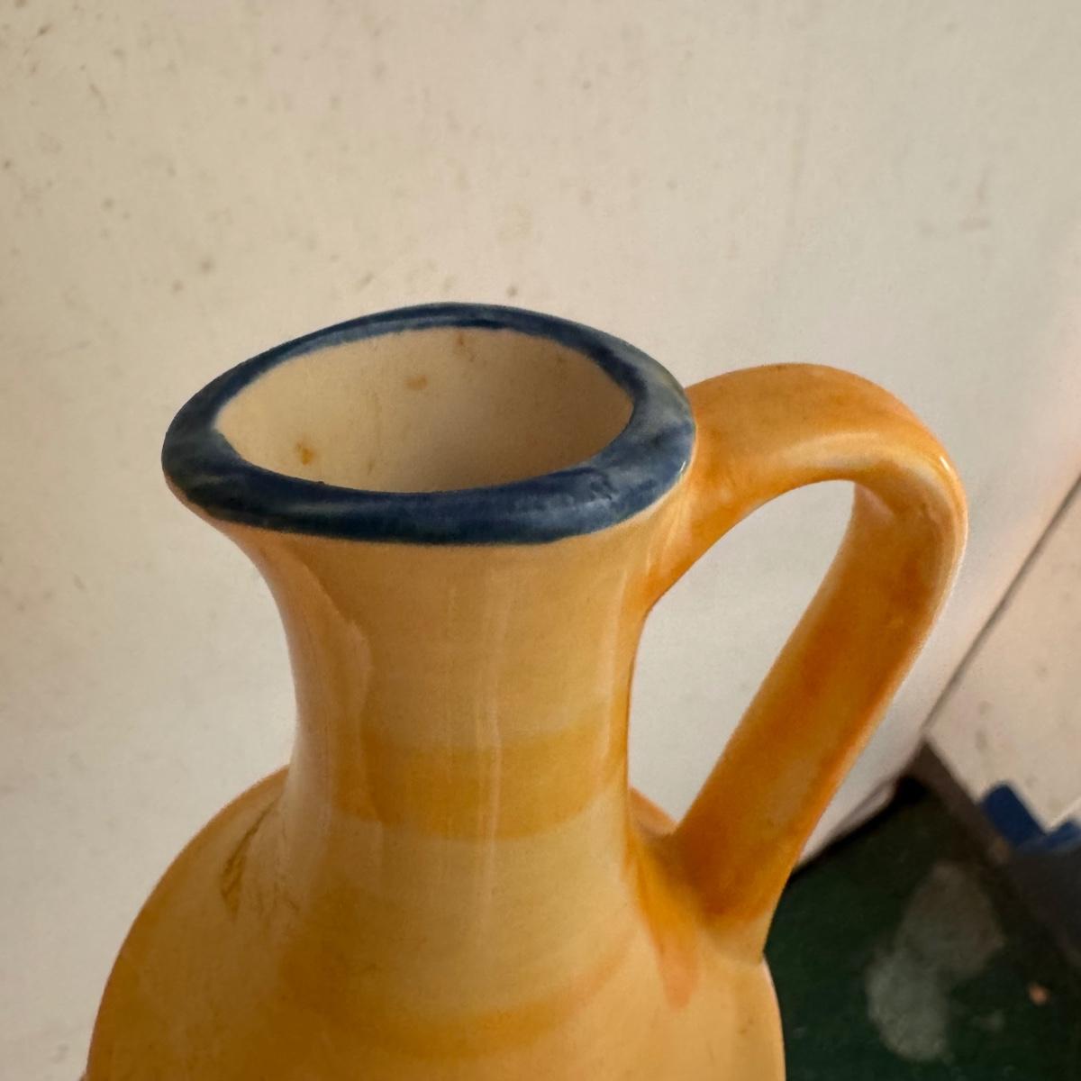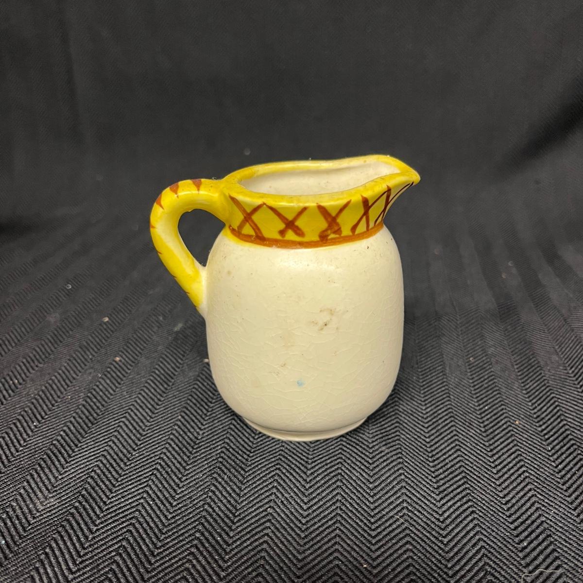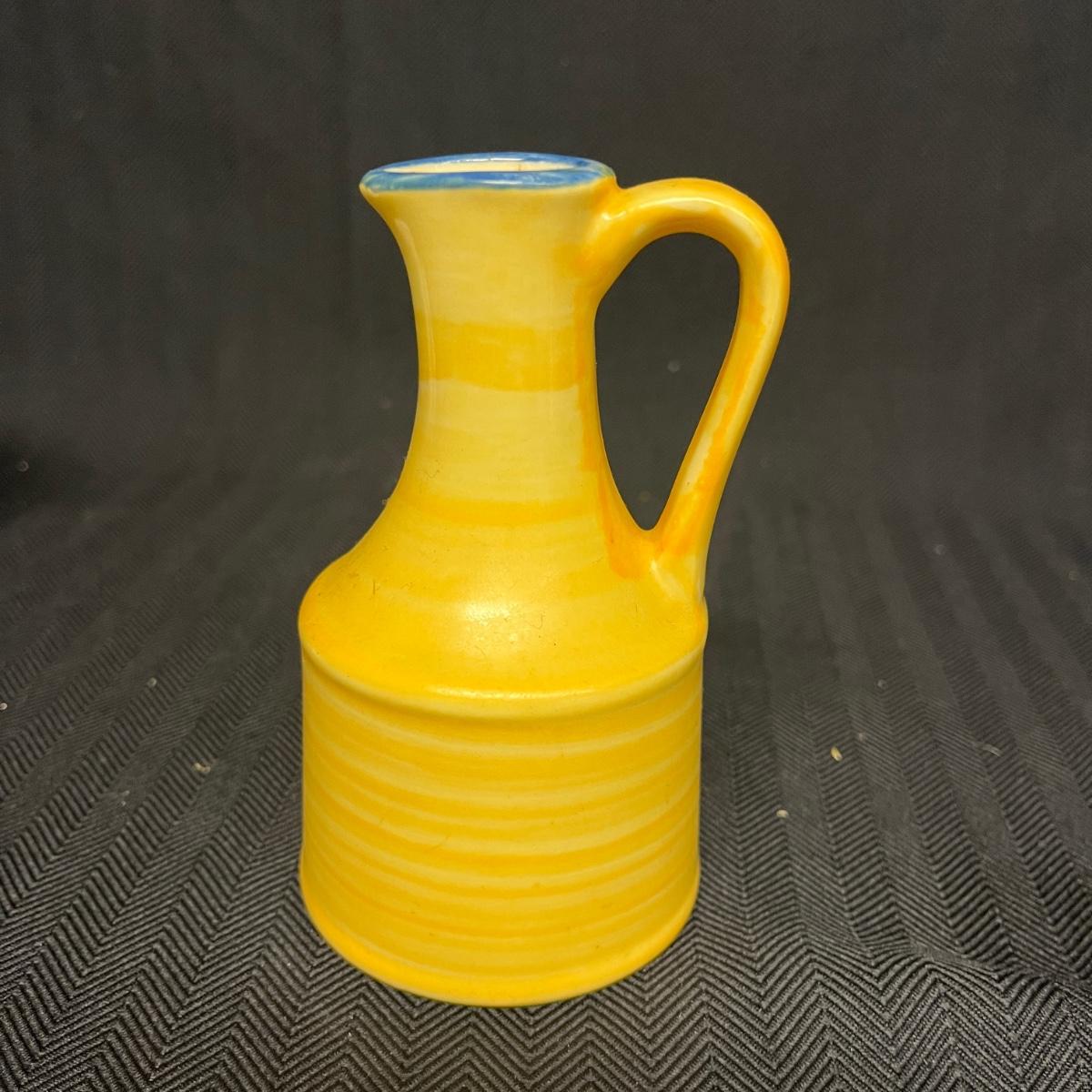 Lot includes a wooden Swedish Dala horse by Nila Olson, two ceramic candleholders, small ceramic jug and pitcher. Horse measures 6” x 2” x 7”H.