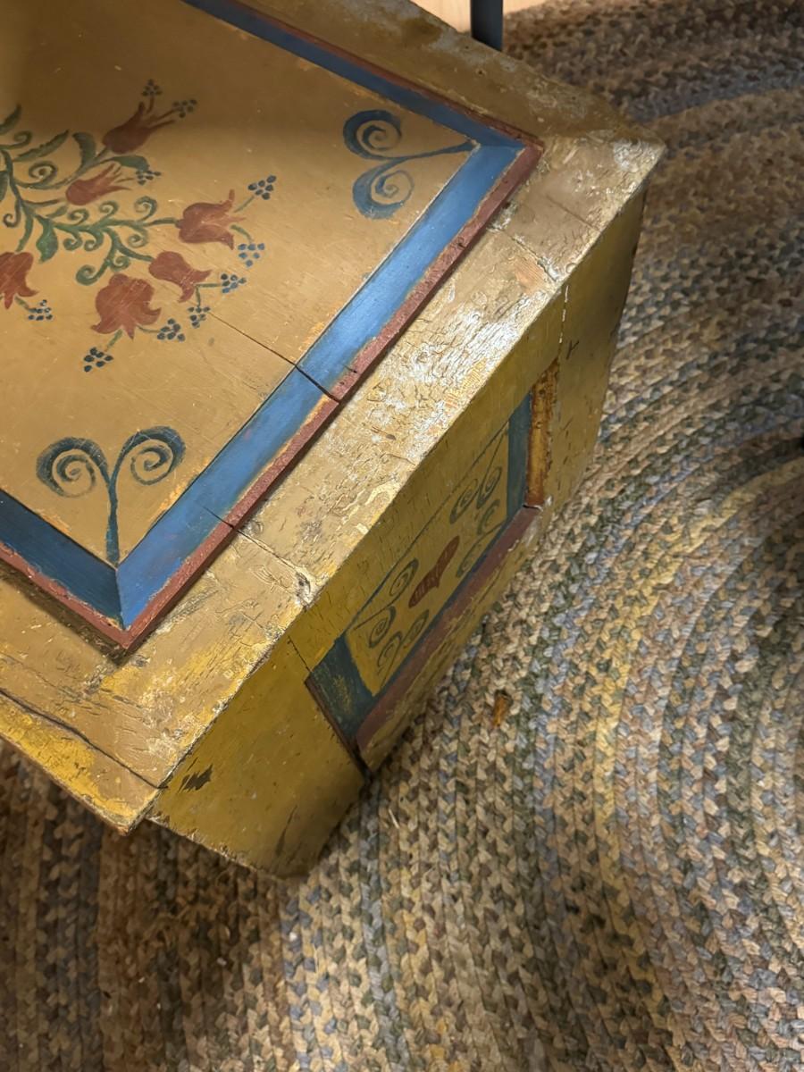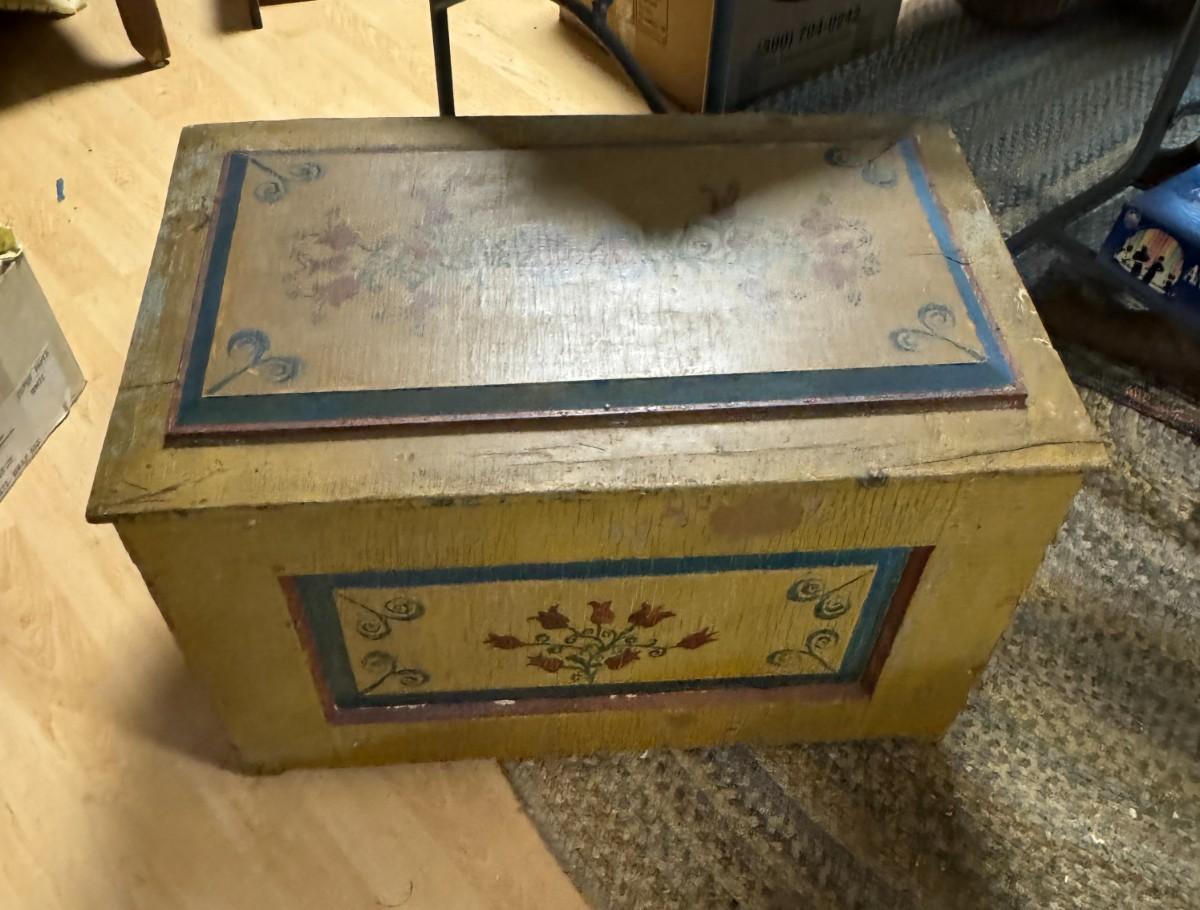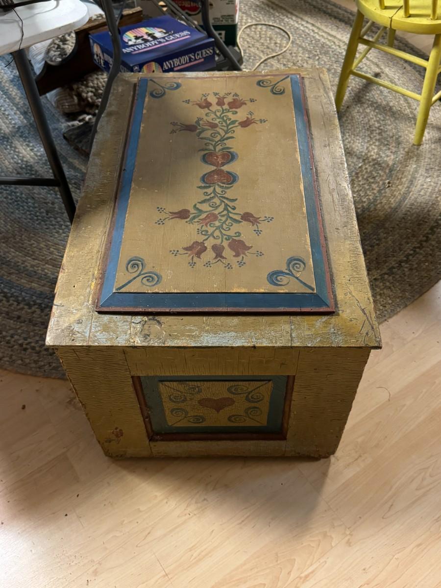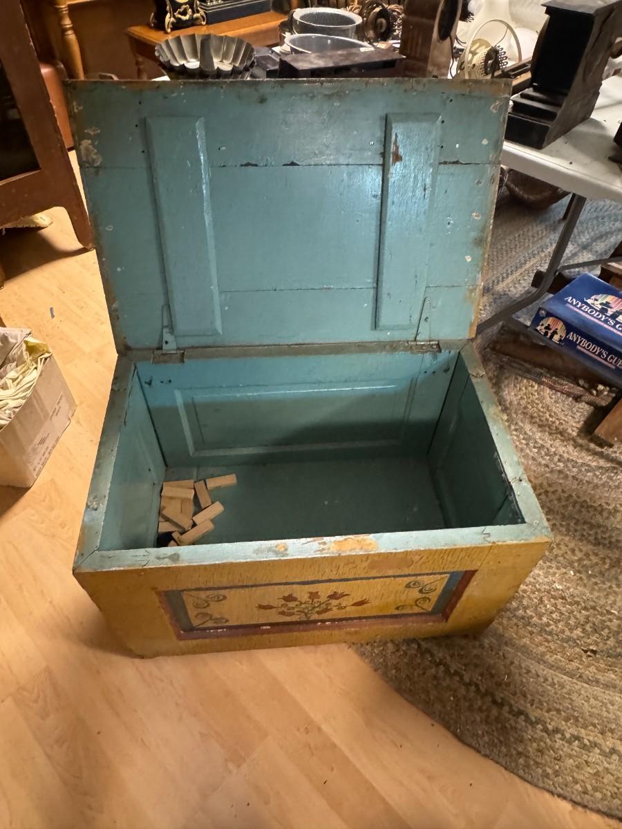 Primitive hand painted trunk. 42" x 36" with green painted interior . Very solid