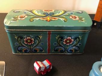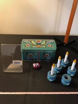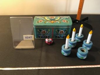 Swedish Lot: Hand-Painted Tin Box; 5 Wooden Candle Holders; 4 Wood Candles; Small Dala Horse