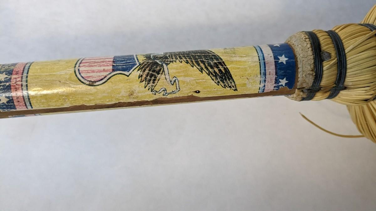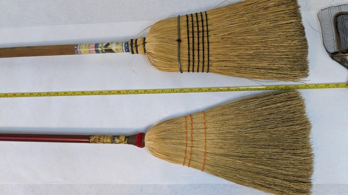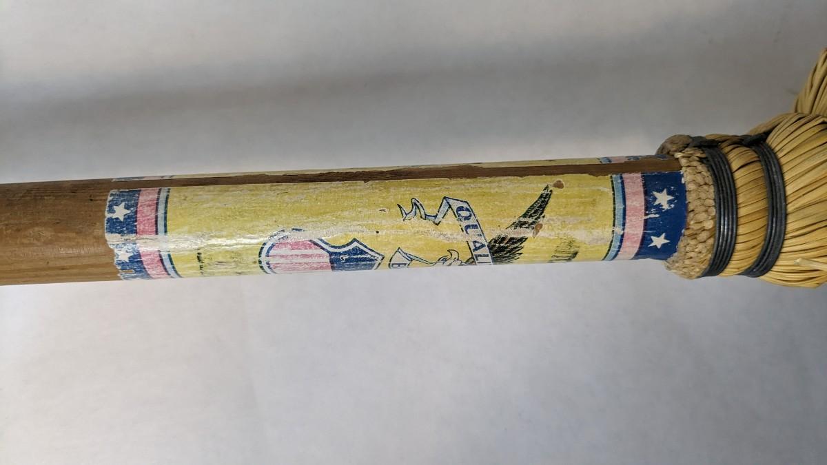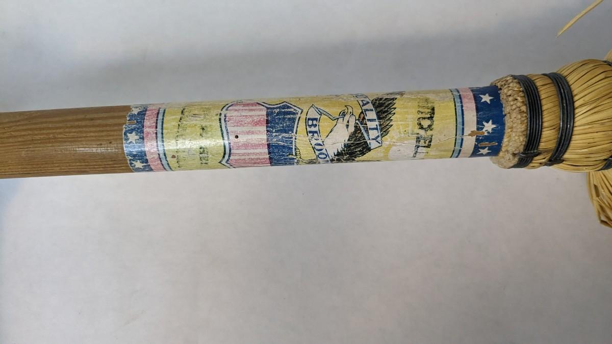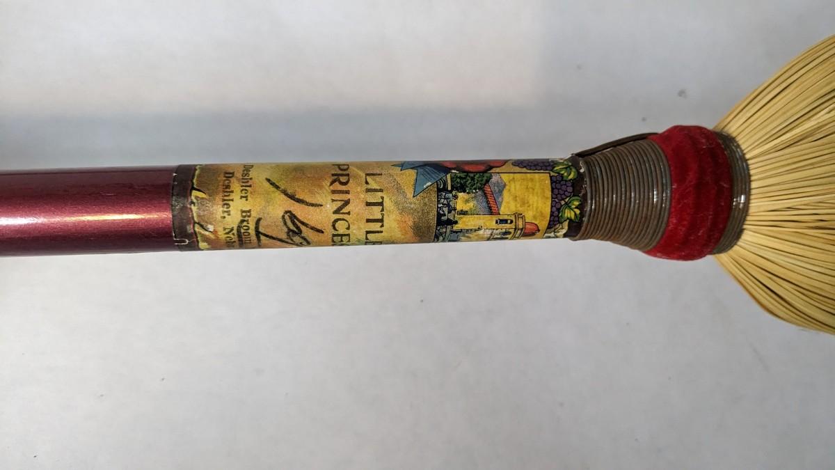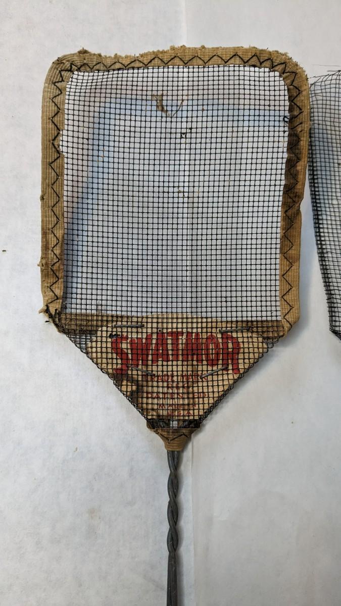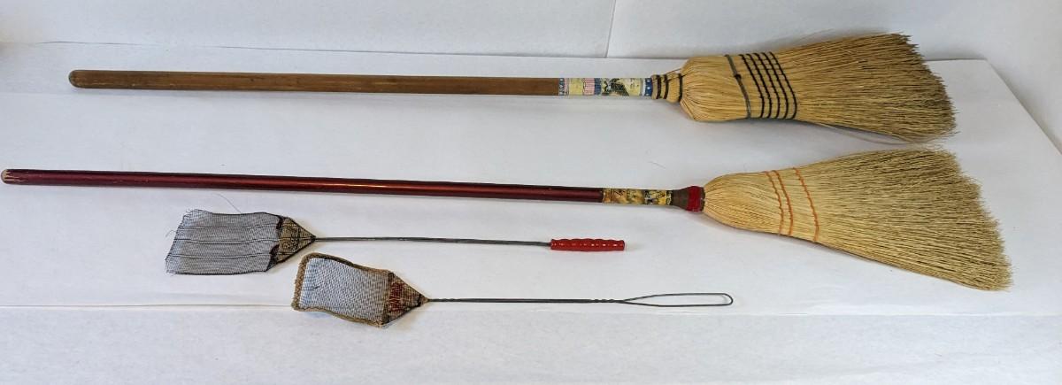 Includes two full size straw brooms with original paper marketing still attached indicating we have the Little Princess with a lovely velour band where head meets handle from the Deschler Broom Factory in Deschler Nebraska and a federal eagle emblem Quality Broom from Mitchell, Nebr. Also includes two very early fly swatters from Regal and Swatmore. These pieces are in fantastic condition for their age