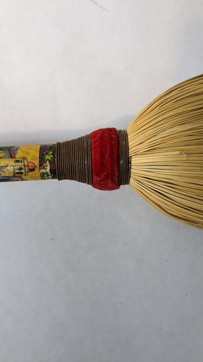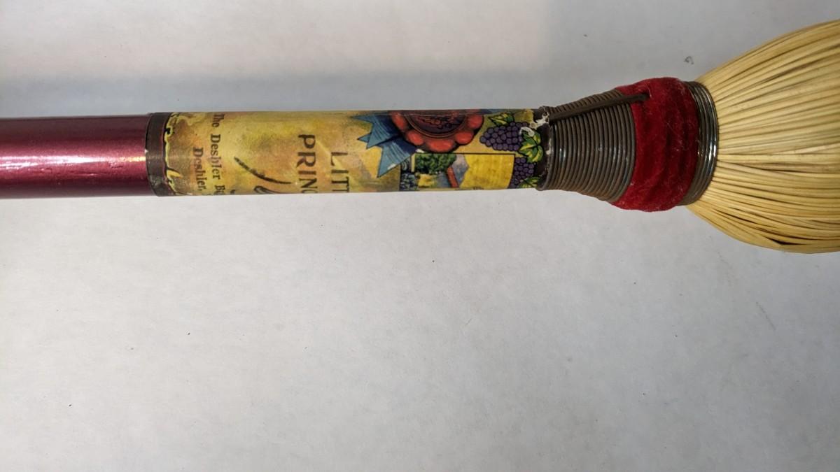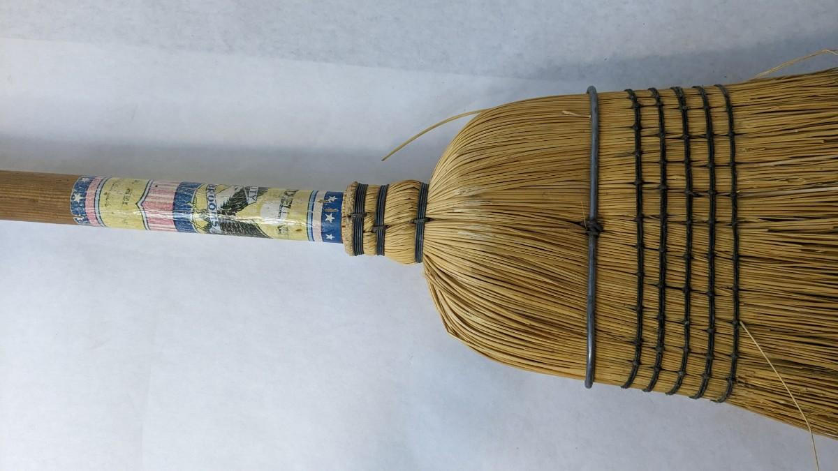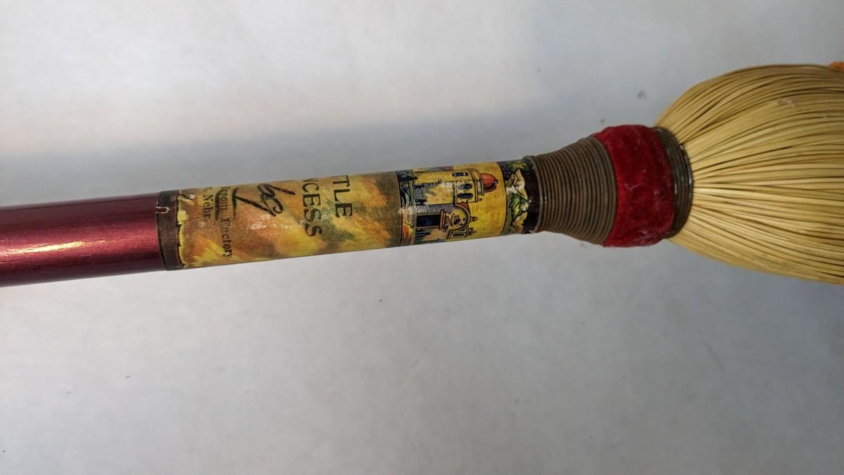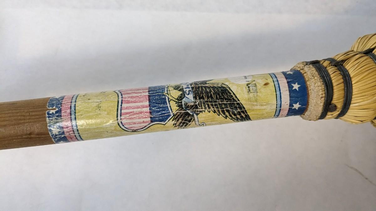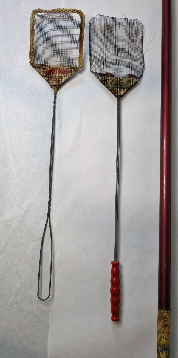 Includes two full size straw brooms with original paper marketing still attached indicating we have the Little Princess with a lovely velour band where head meets handle from the Deschler Broom Factory in Deschler Nebraska and a federal eagle emblem Quality Broom from Mitchell, Nebr. Also includes two very early fly swatters from Regal and Swatmore. These pieces are in fantastic condition for their age