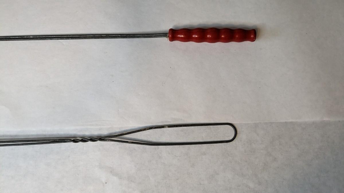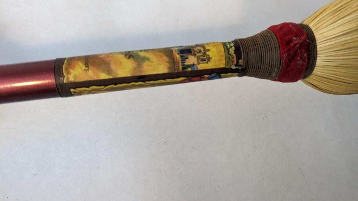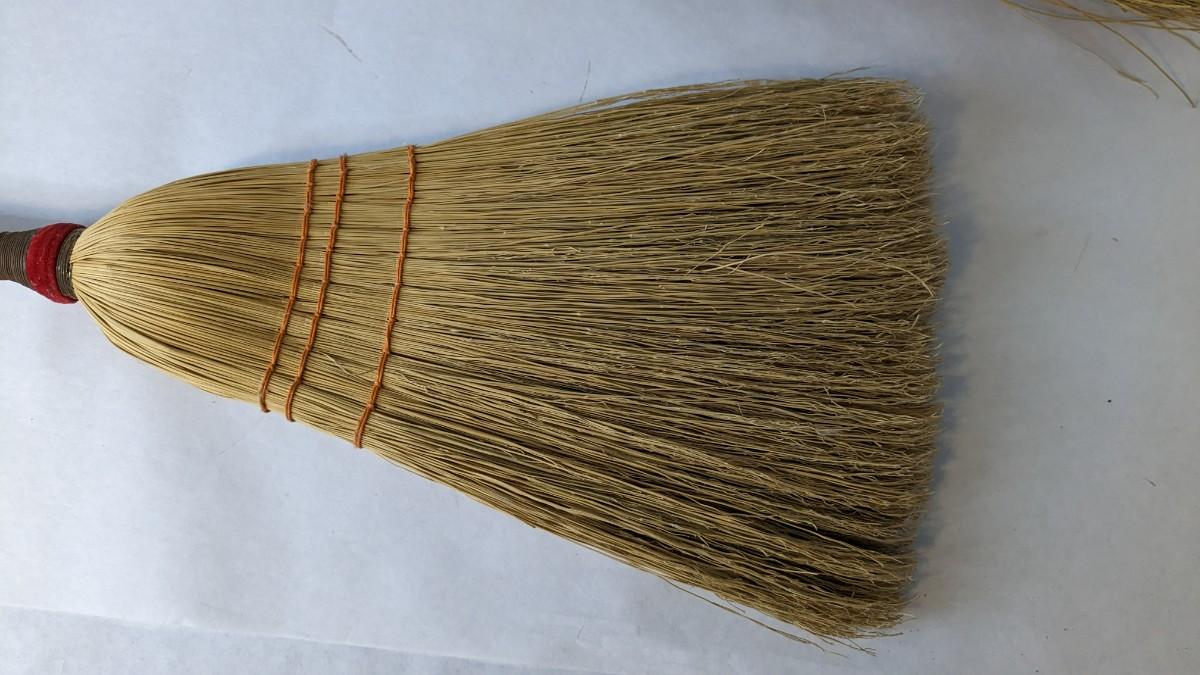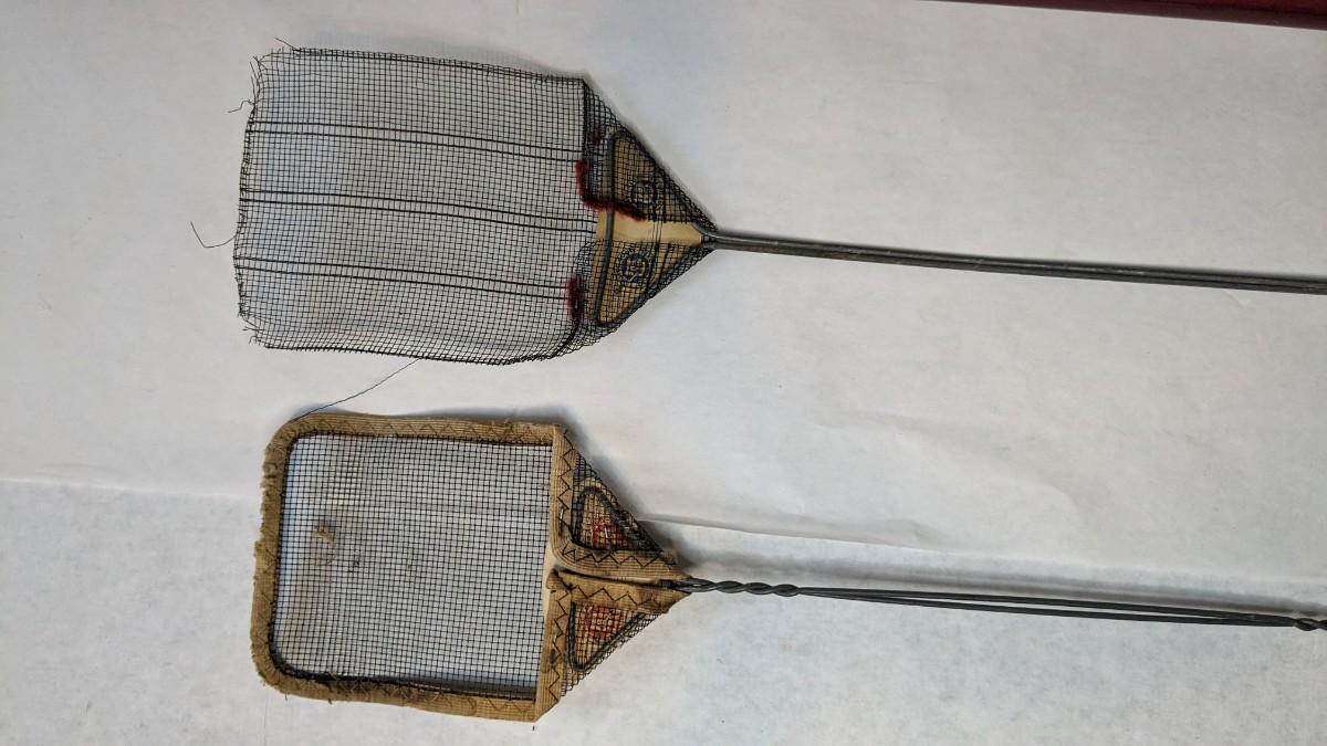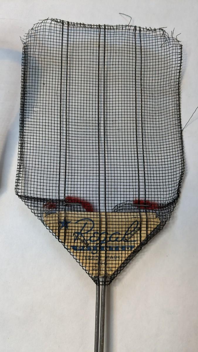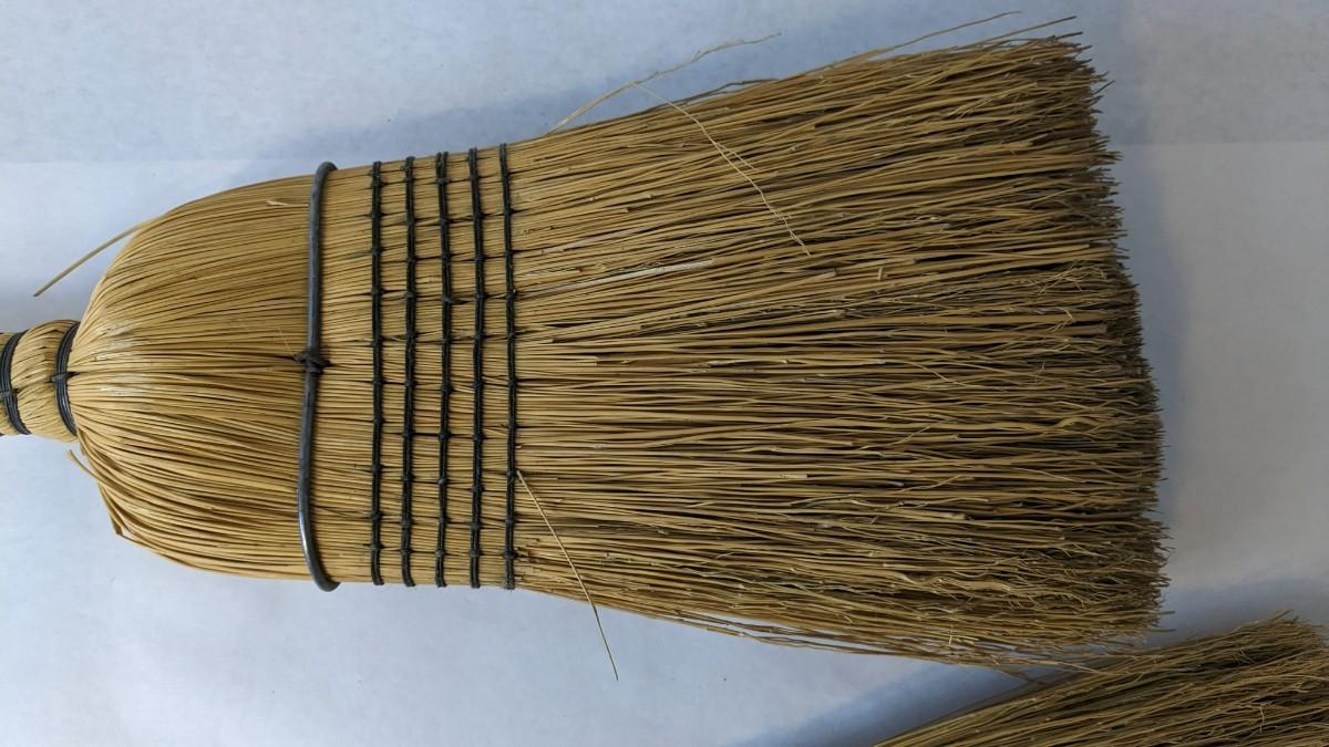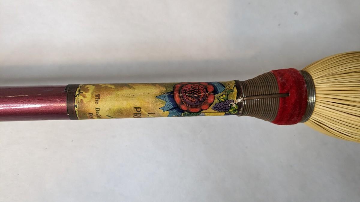 Includes two full size straw brooms with original paper marketing still attached indicating we have the Little Princess with a lovely velour band where head meets handle from the Deschler Broom Factory in Deschler Nebraska and a federal eagle emblem Quality Broom from Mitchell, Nebr. Also includes two very early fly swatters from Regal and Swatmore. These pieces are in fantastic condition for their age