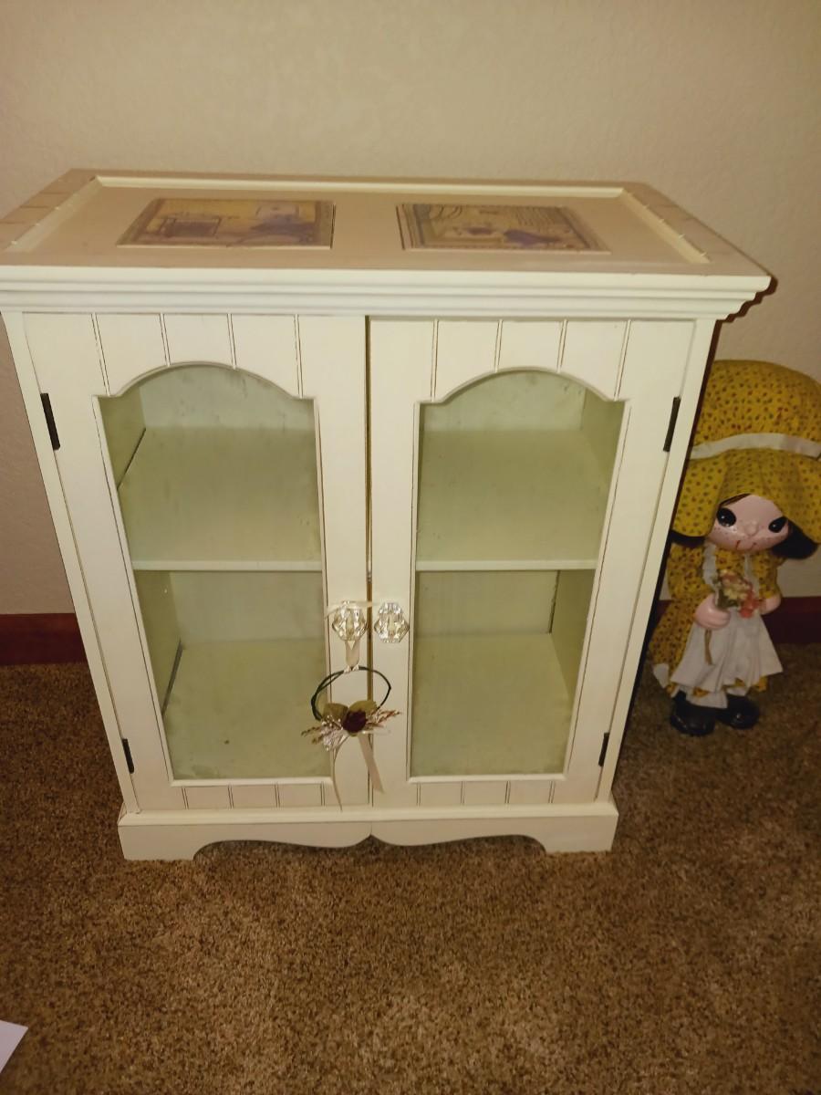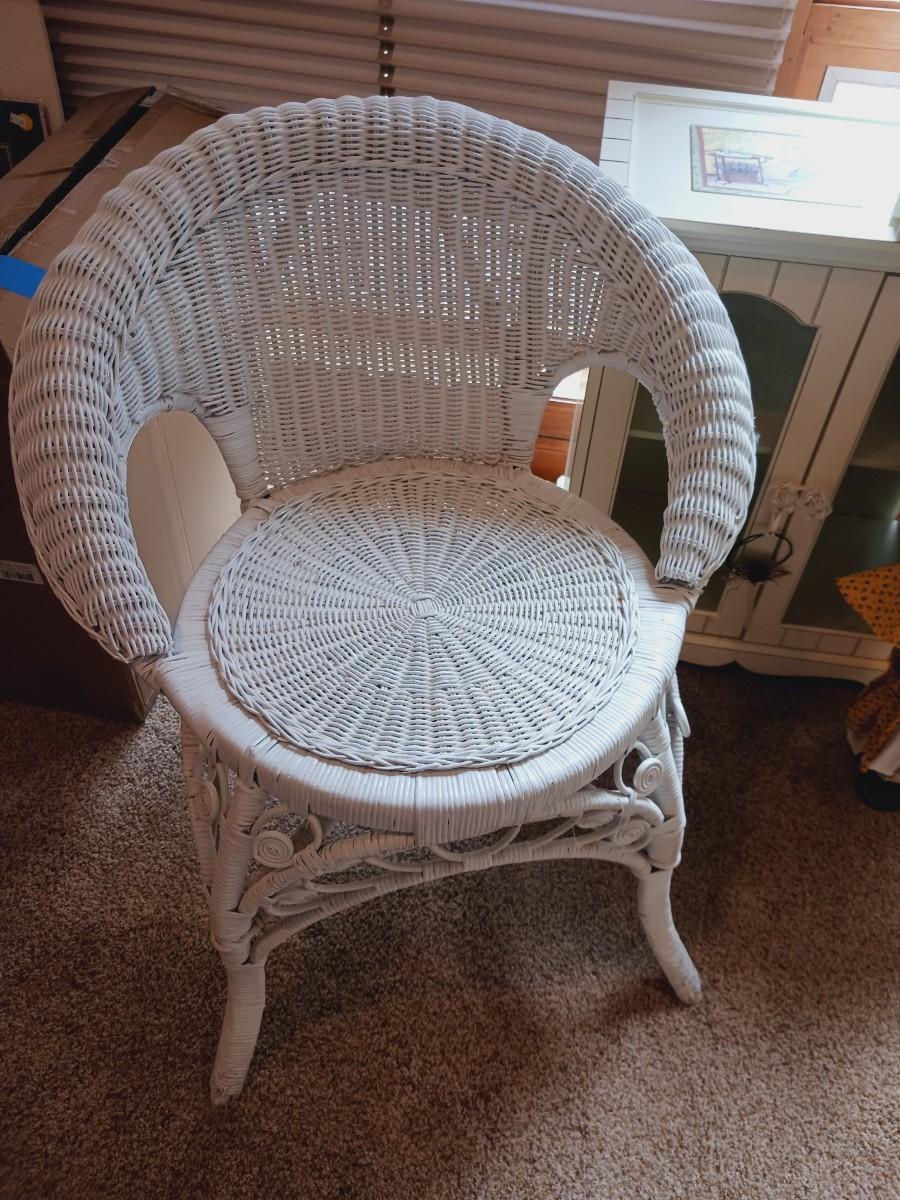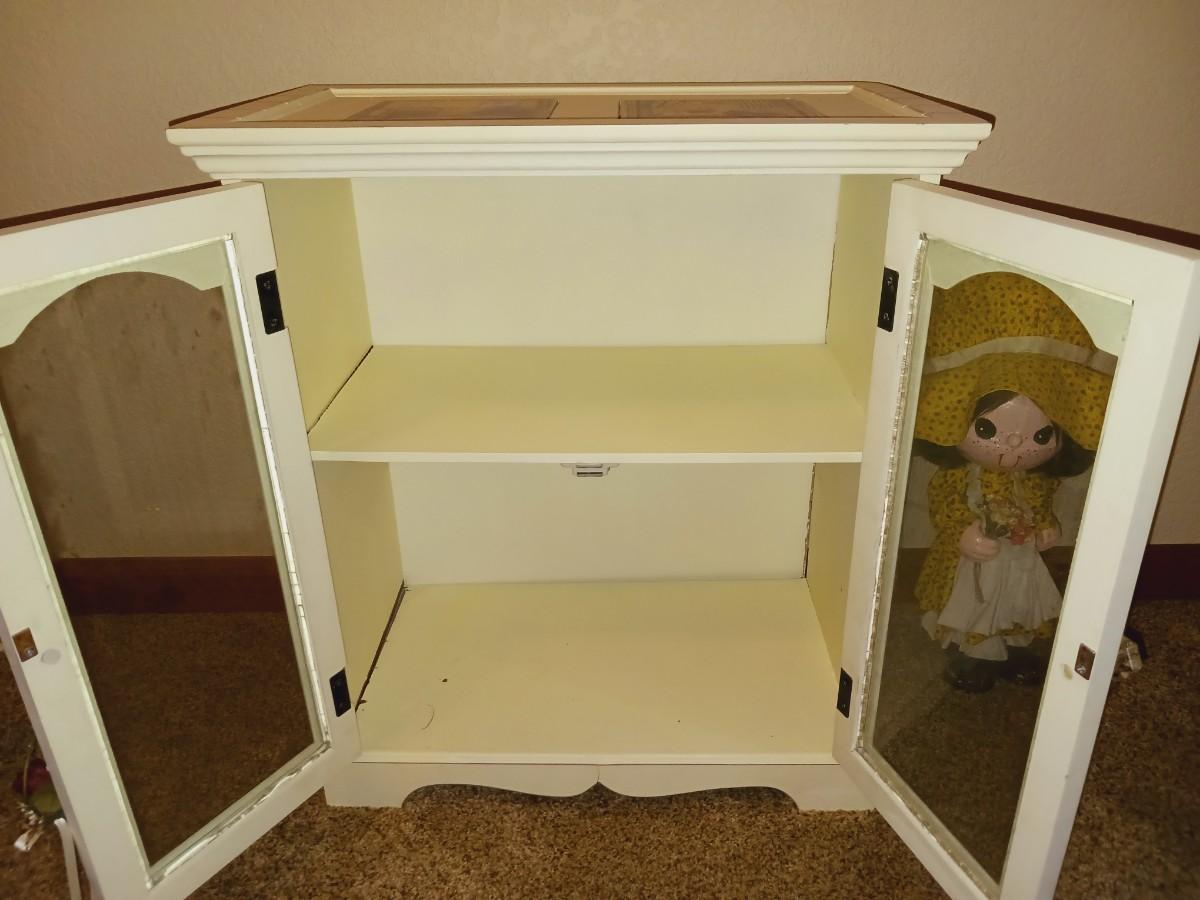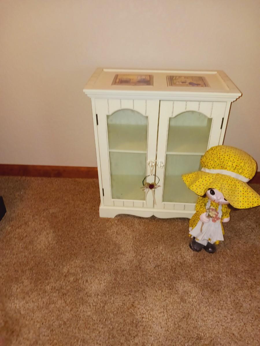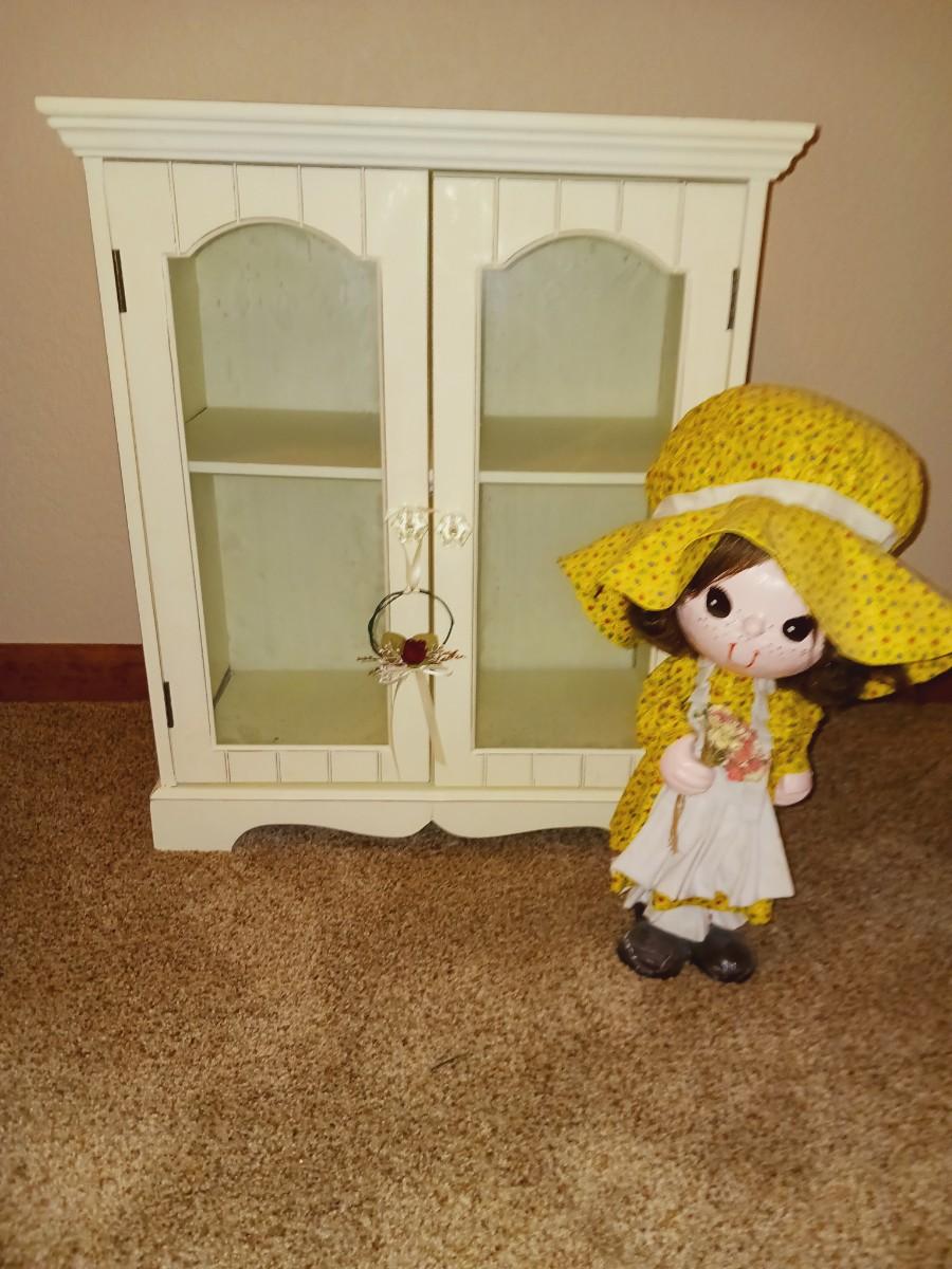 SWEET LITTLE DISPLAY CABINET, A WICKER CHAIR AND A PAPER MACHE DOLL