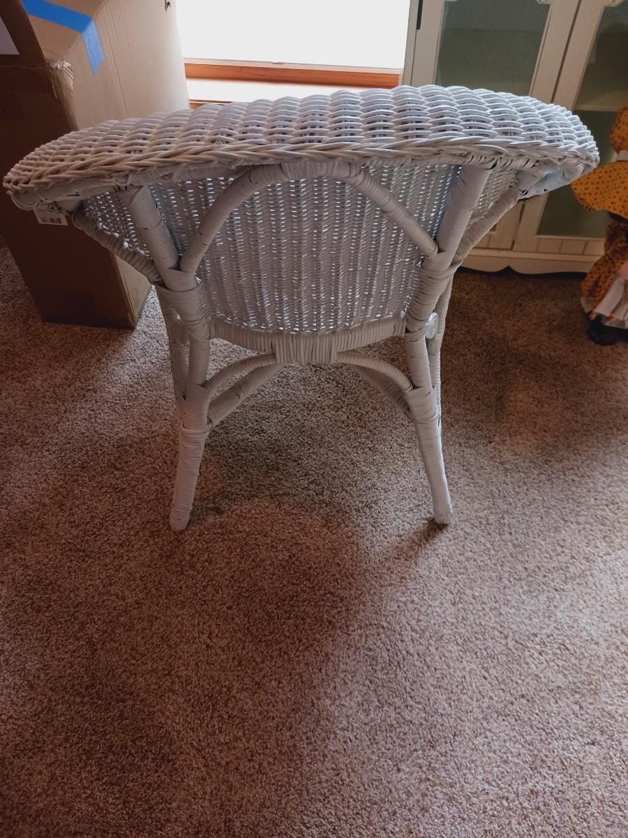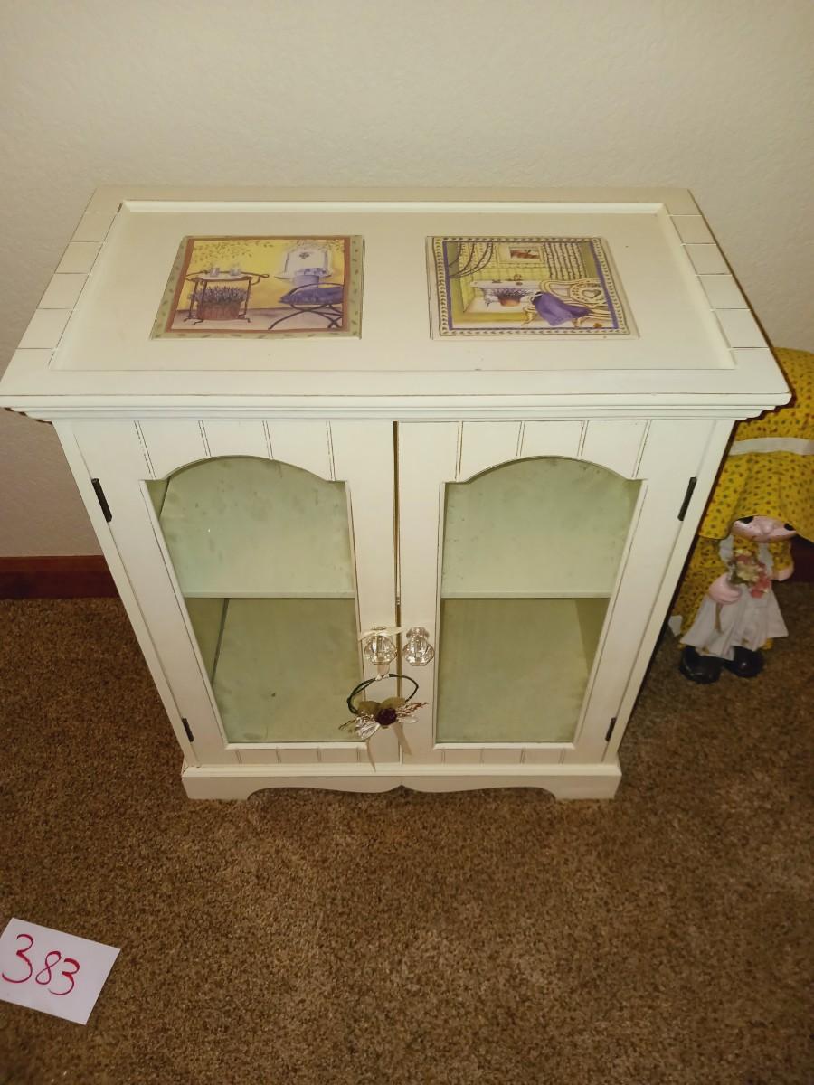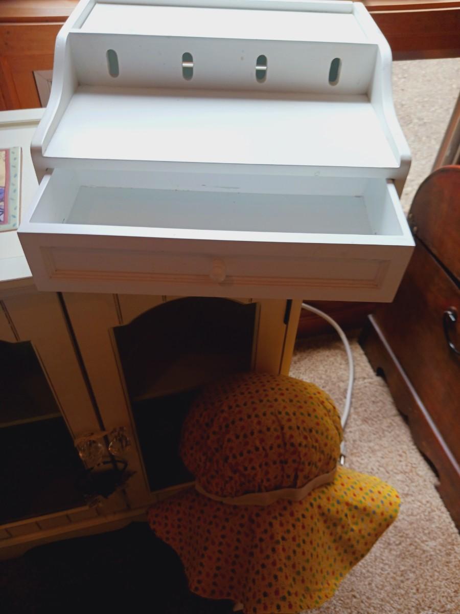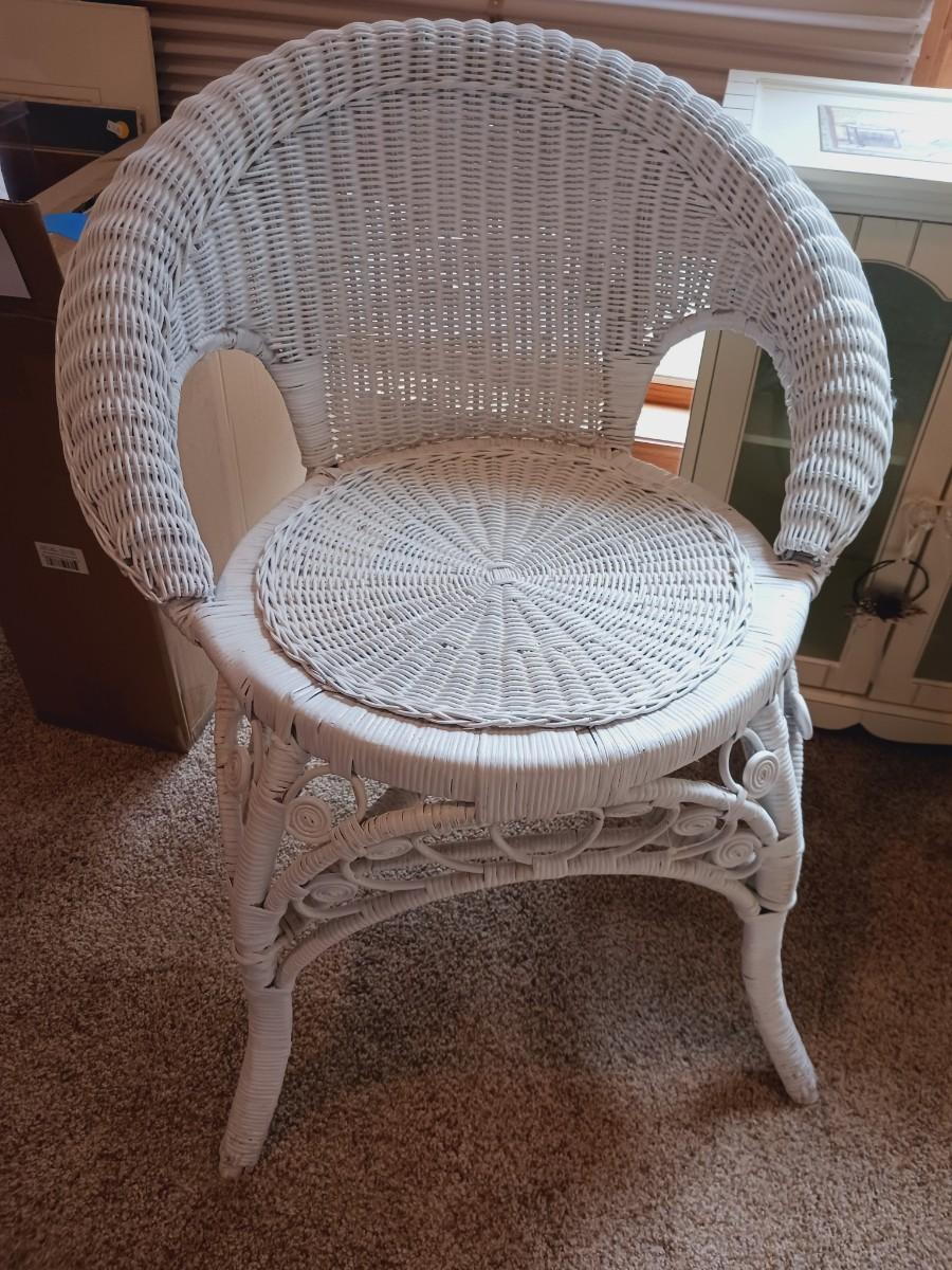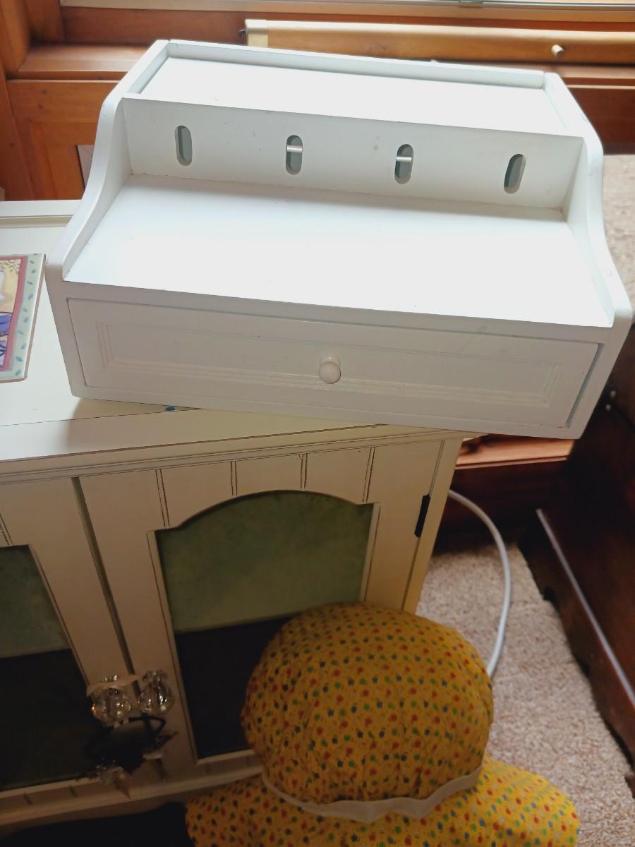 SWEET LITTLE DISPLAY CABINET, A WICKER CHAIR AND A PAPER MACHE DOLL