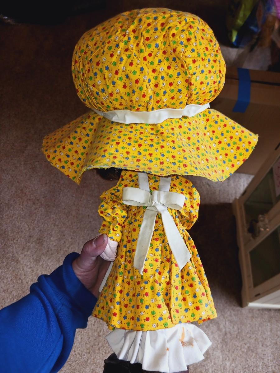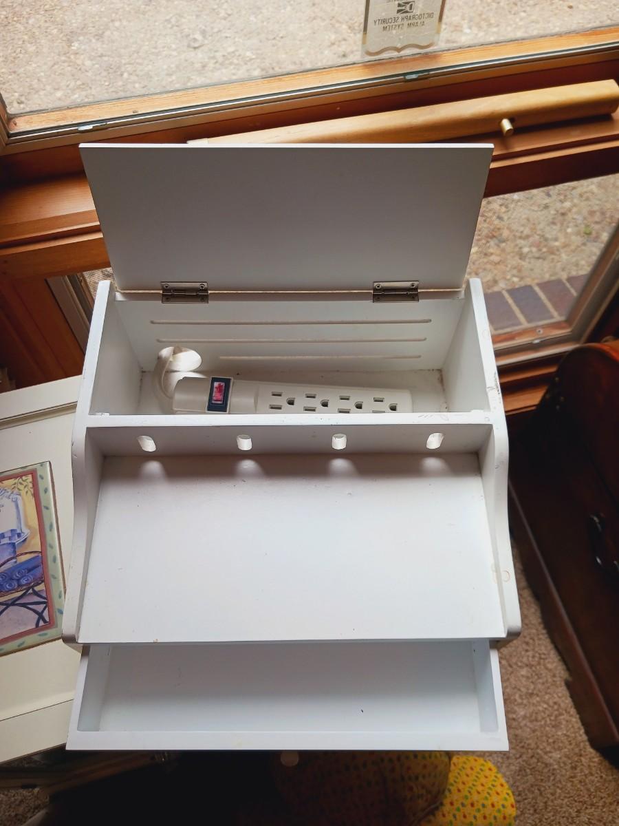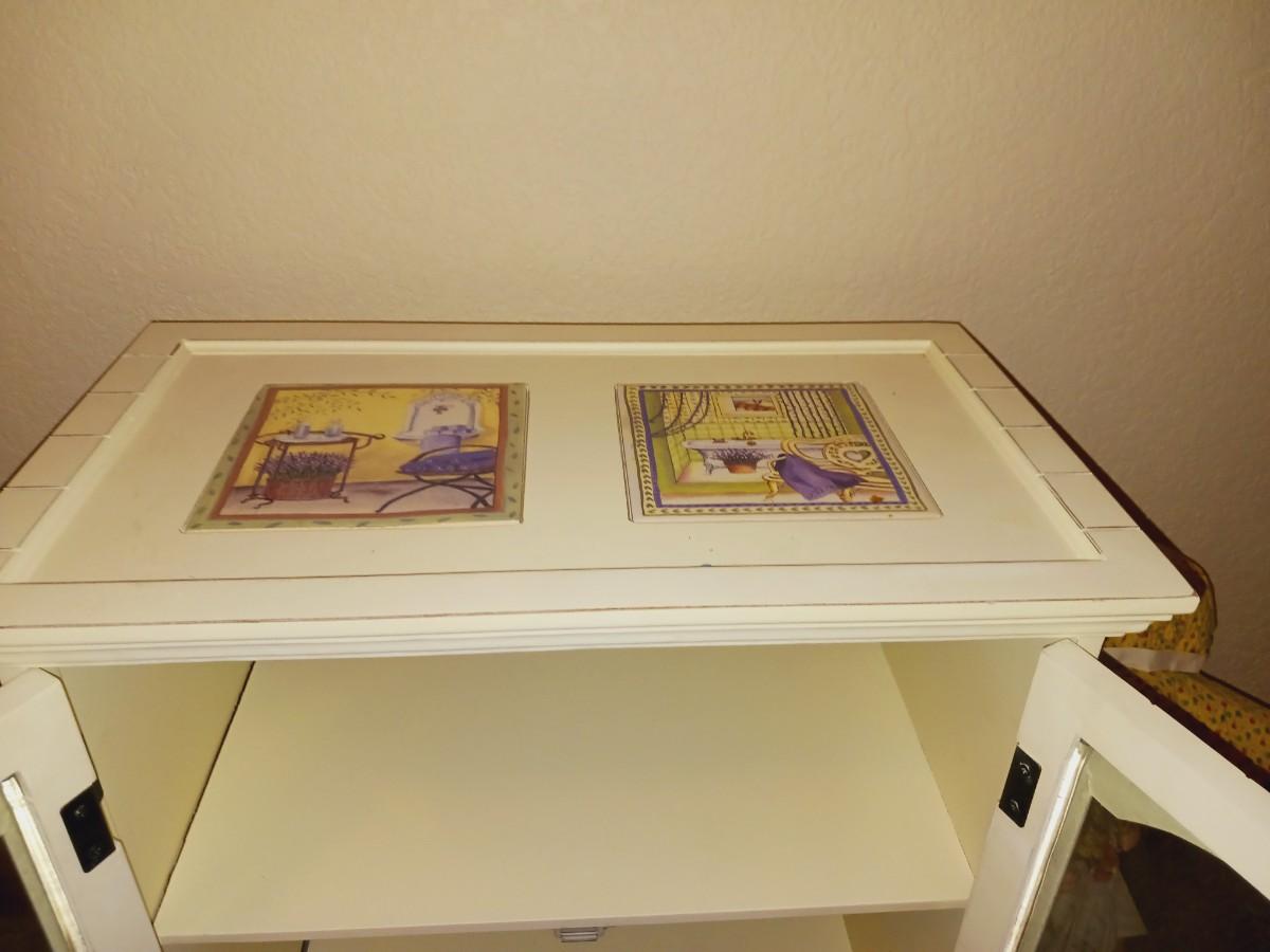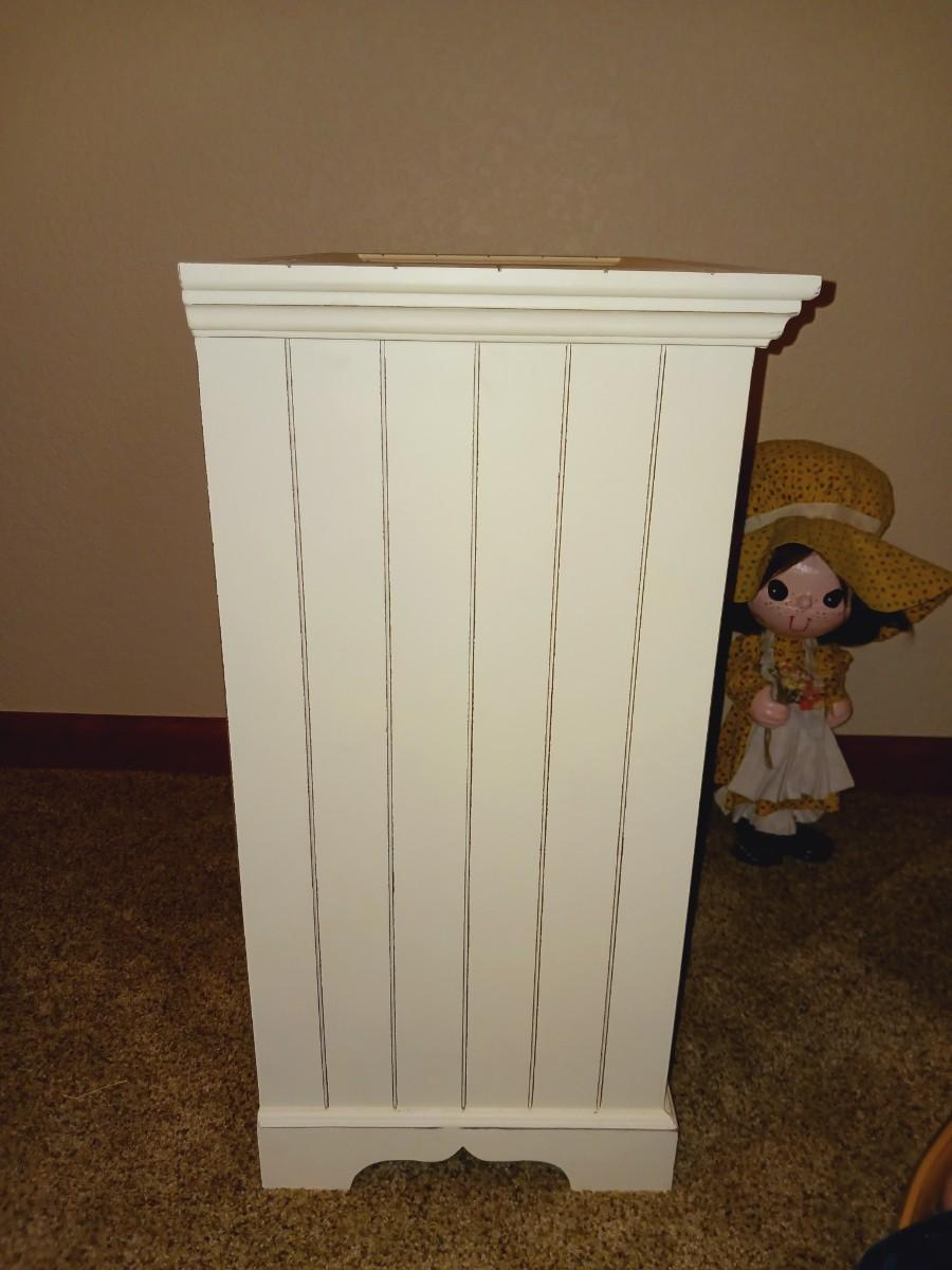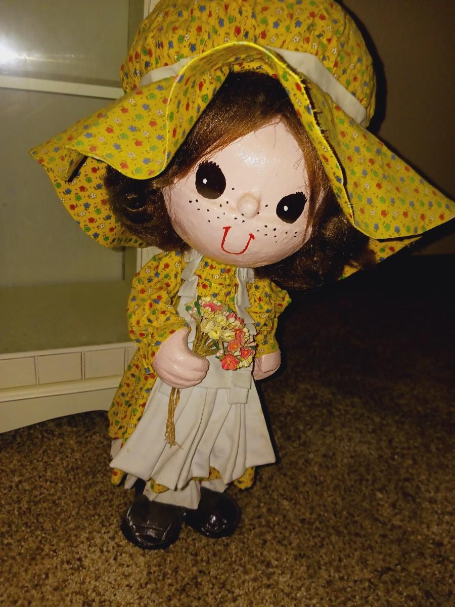 SWEET LITTLE DISPLAY CABINET, A WICKER CHAIR AND A PAPER MACHE DOLL