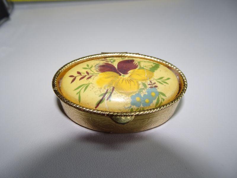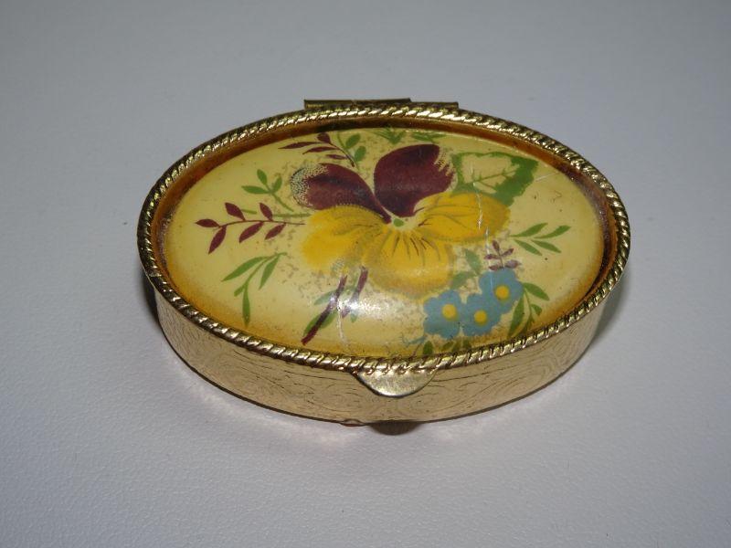 Sweet Yellow Gold Tone Pill Box, Pansy Flower