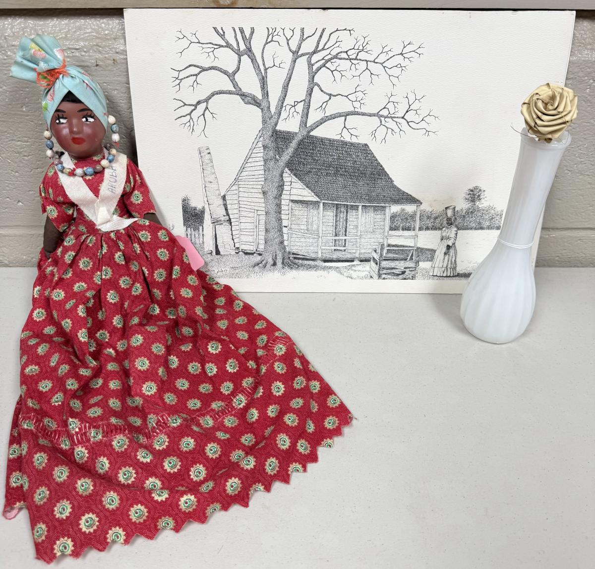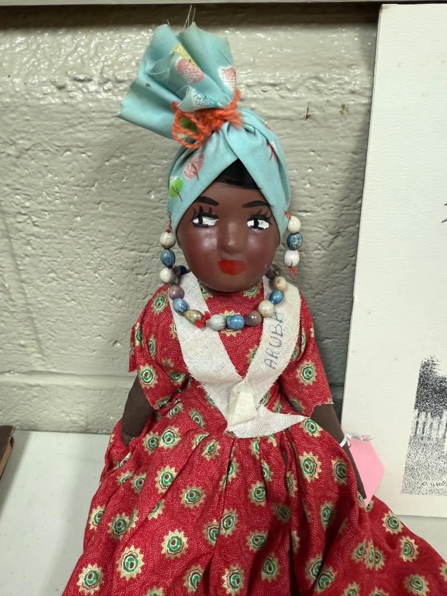 Handmade sweetgrass flower, Pencil of Geechi woman (discoloration), Handmade rag doll Aruba