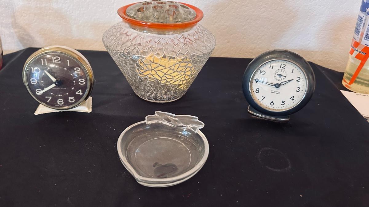 SWEET PEA FLOWER VASE, WESTCLOX BABY BEN AND WESTCLOX ALARM CLOCKS