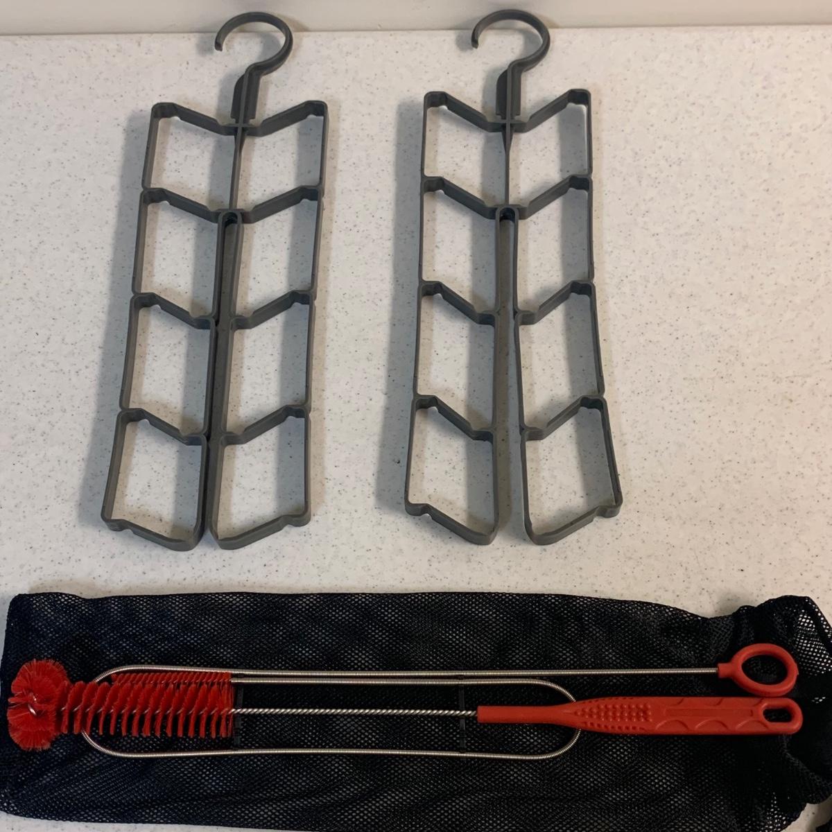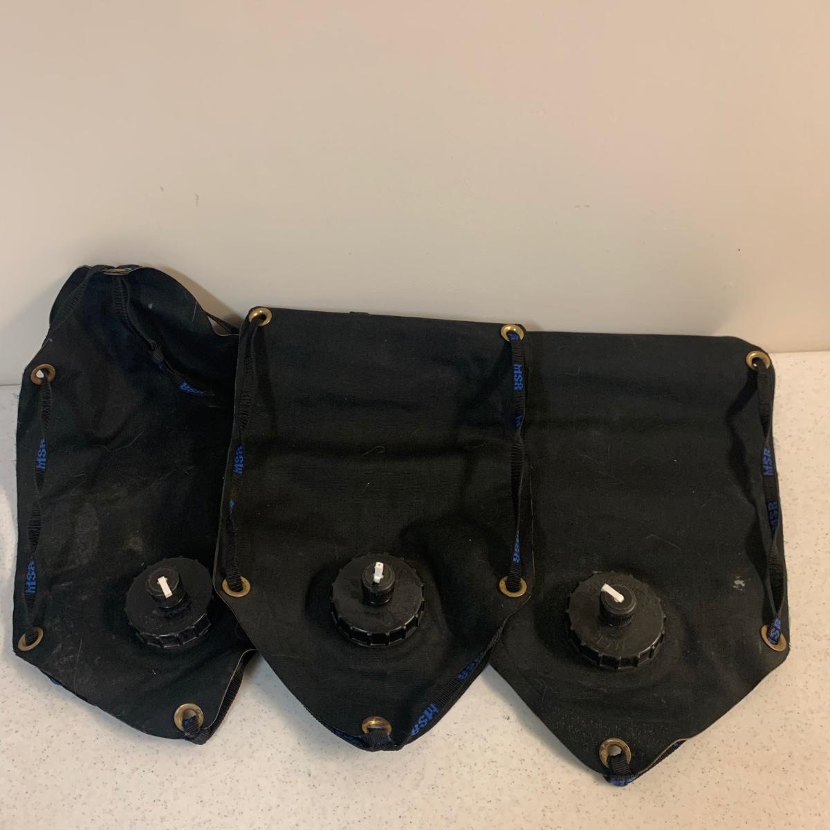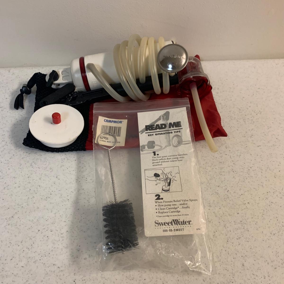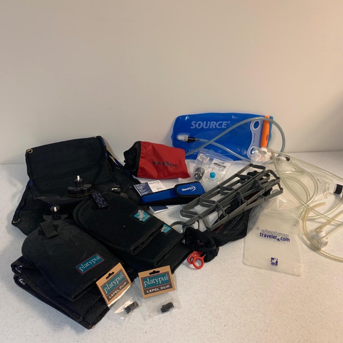 Water filtration/purification systems and hydration bladders for camping and other outdoor adventures. Items in this lot include: a SweetWater purification system and a SteriPEN with cases and accessories, three MSR dromedaries for carrying water, a 2L Source Widepac, a Platypus bladder plus two others with long tube straws. Additionally, there are six Platypus carrying cases, two Platypus lapel clips, and items for cleaning hydration bladders. The SteriPEN requires four AA batteries (not included) and turned on when tested. Items have been in basement storage and will need to be cleaned.
