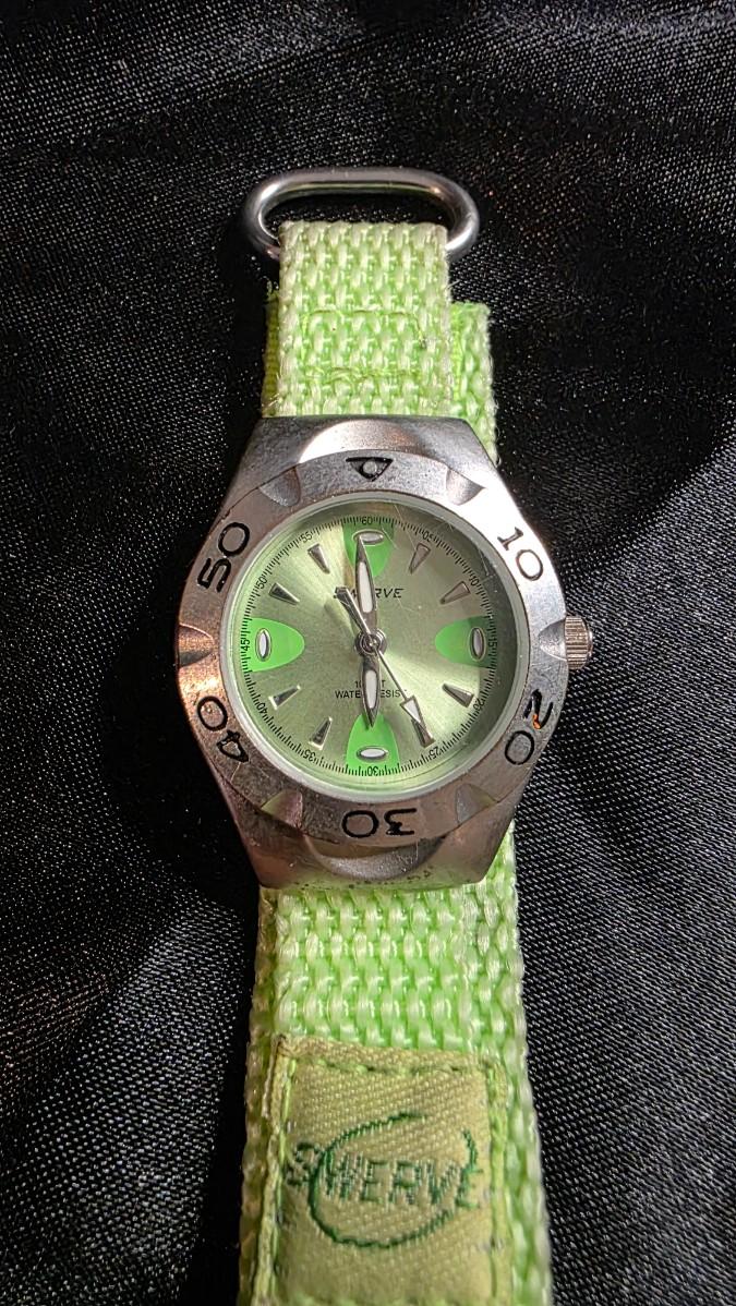 Energetic and adventurous, this lime green Swerve sport watch feels like a burst of fresh air — the kind of timepiece made for movement, sunlight, and play. Its bold green dial mirrors the color of its rugged nylon strap, creating a unified look that feels outdoorsy, youthful, and alive with momentum. The brushed metal case and diver-style numbered bezel give it a tougher edge, softening the glow of its bright color with a sense of durability and readiness.