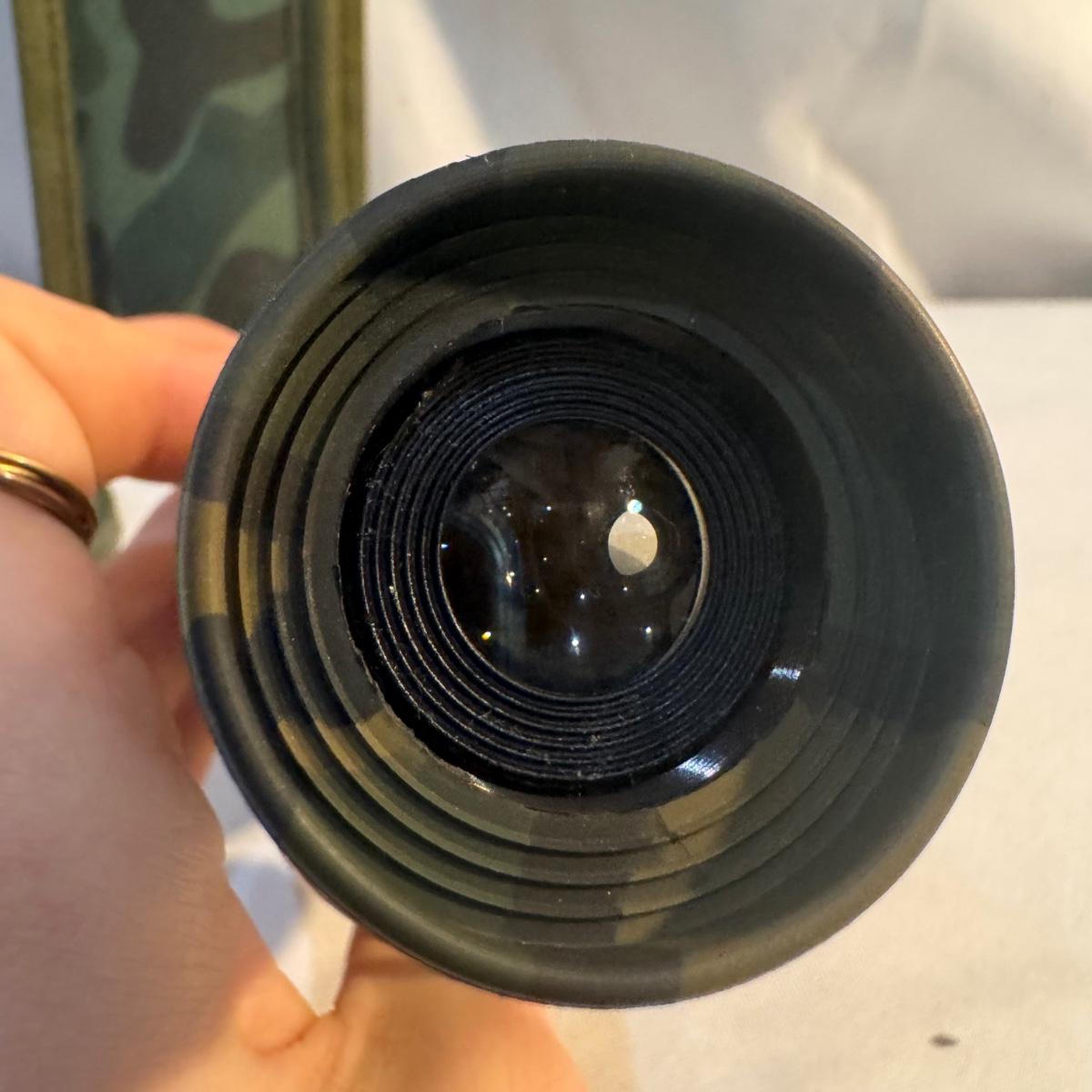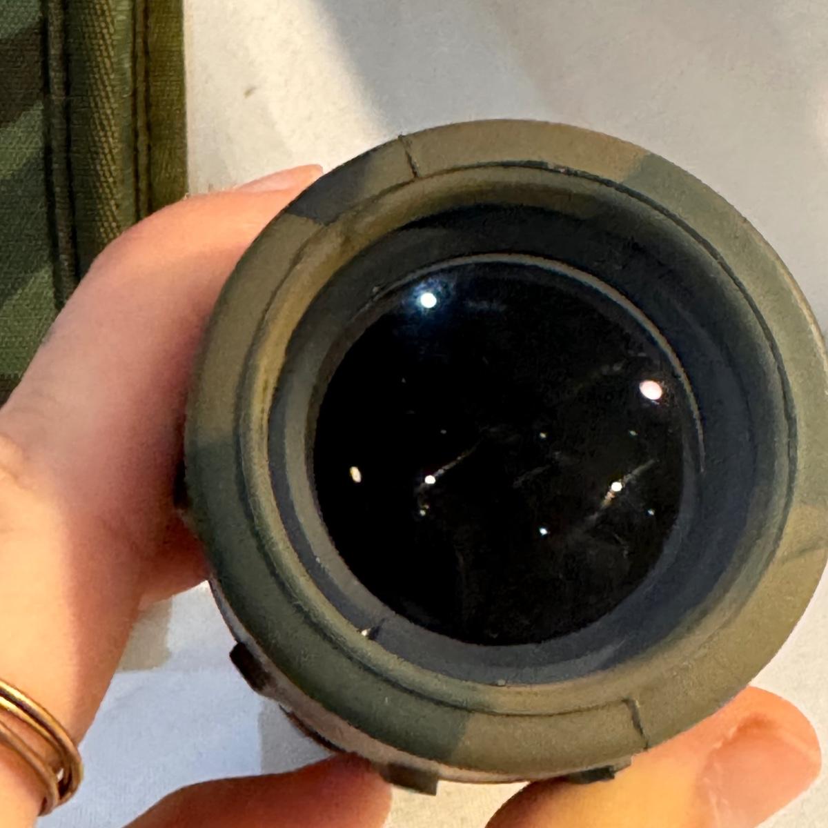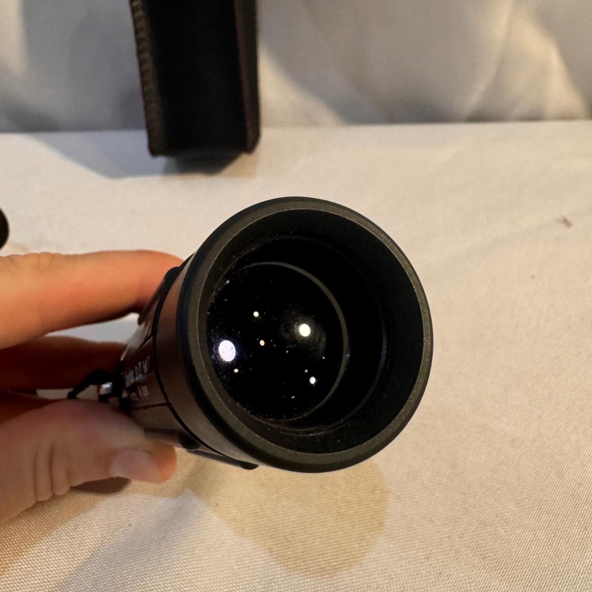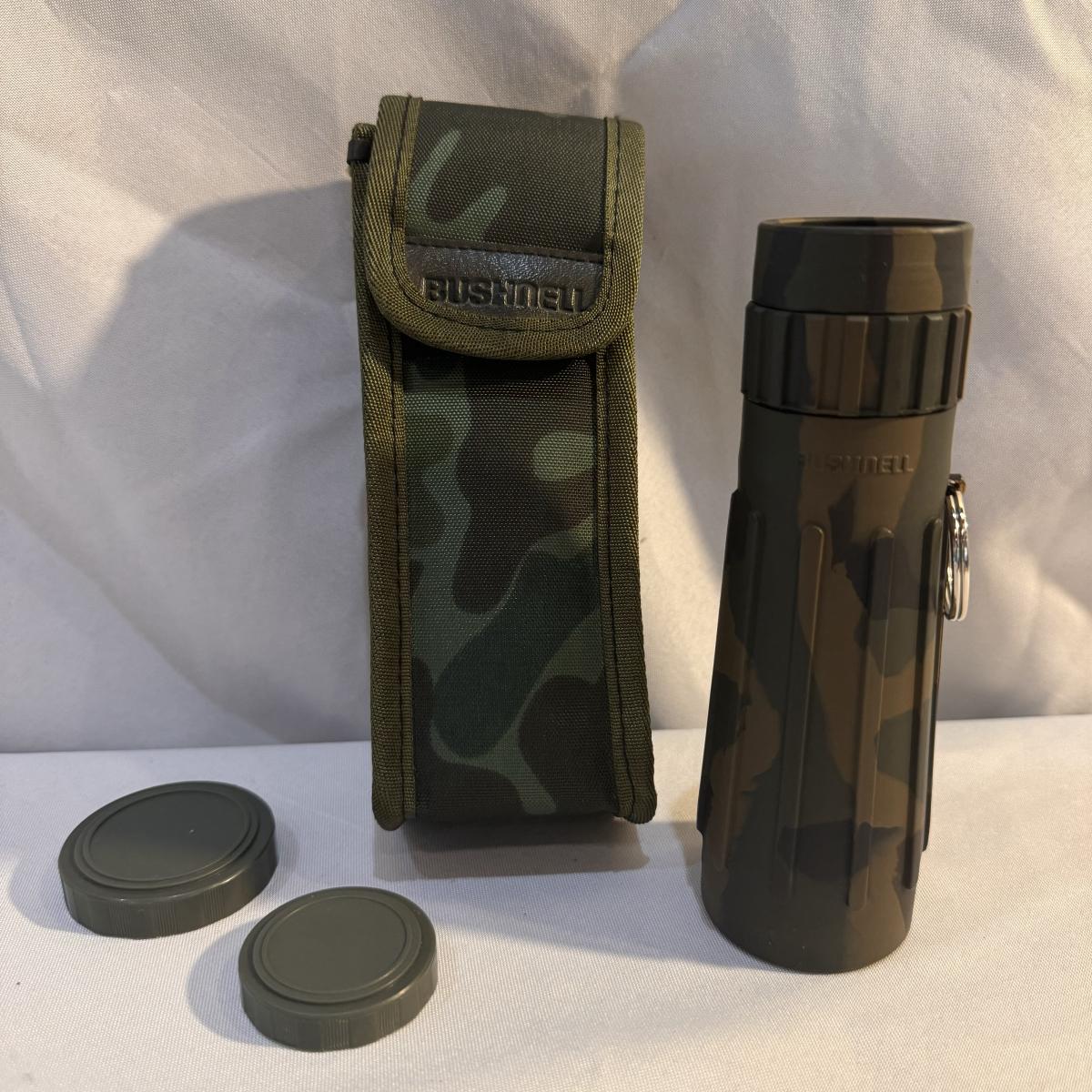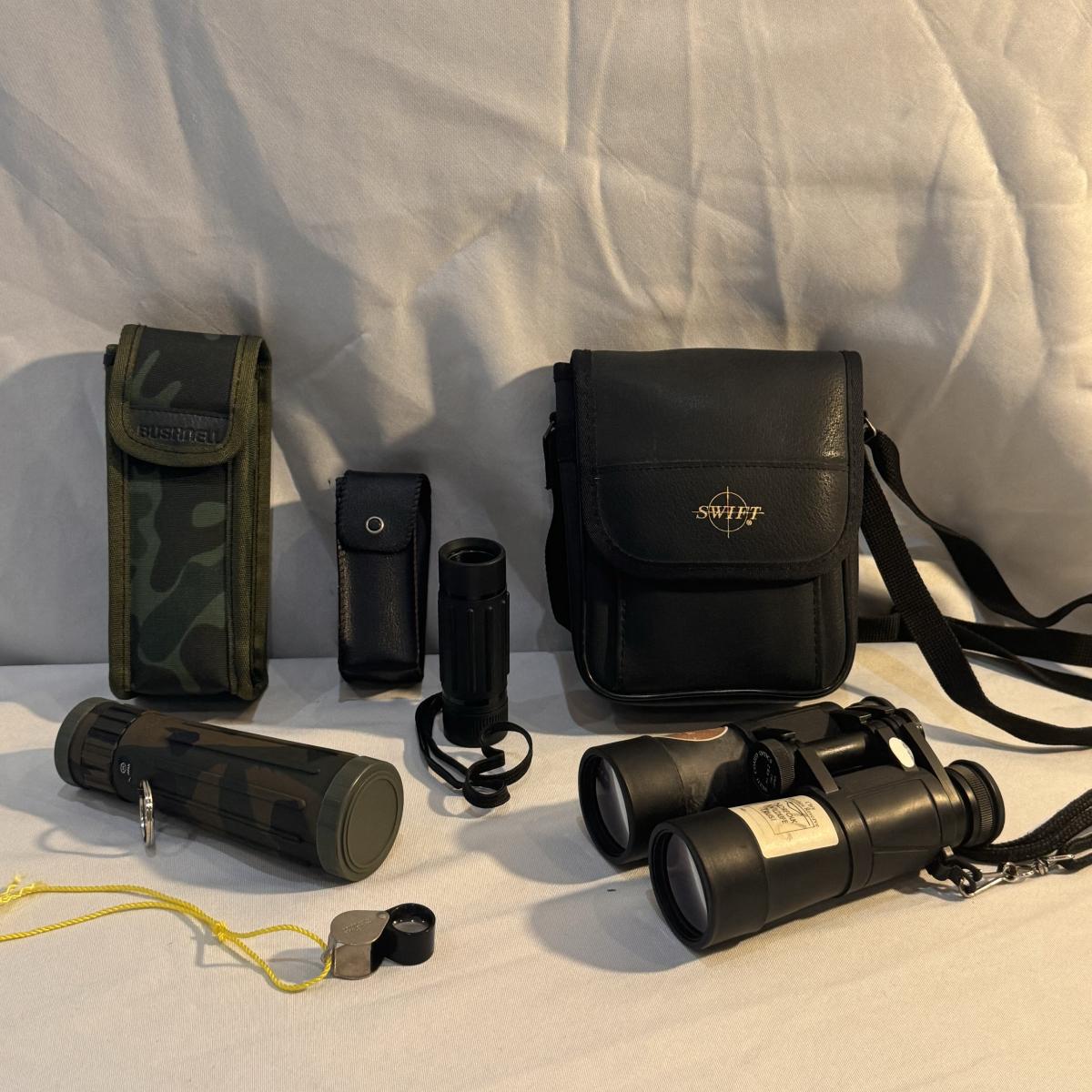This lot includes Swift “Hawk” Binoculars in their own bag, one Bushnell camouflage monocular in its own case, one Carton monocular, and one Bausch and Lomb quarter-size magnifier. The Bushnell monocular measures 2” x 6.5”H. Shipping available.