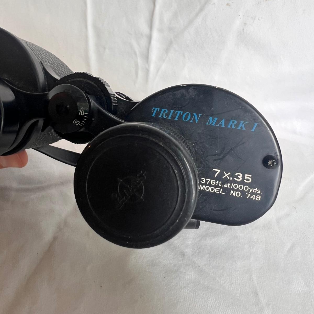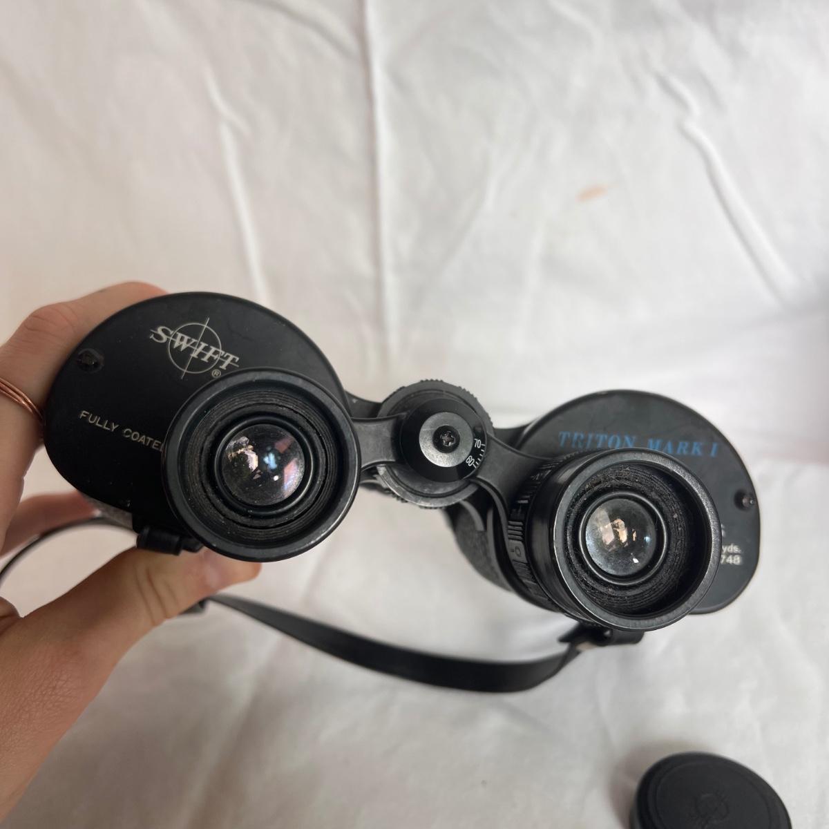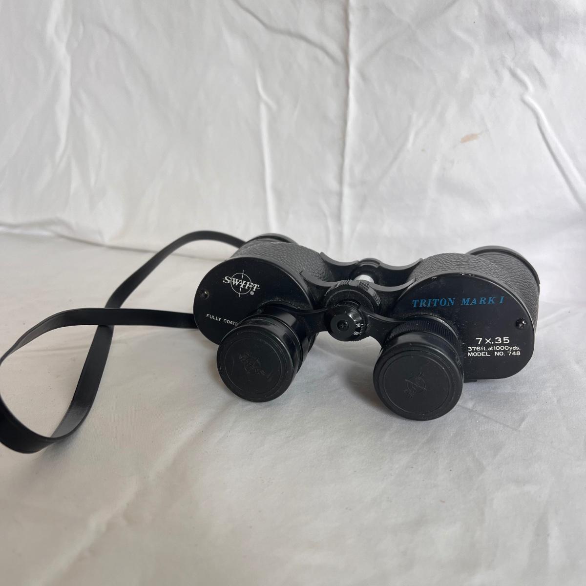 This lot includes three binoculars from the brands Swift, Mayflower, and Triton Mark I Binoculars. The Mayflower binoculars are pocket sized and measure 2” x 2” x 1”H. Those binoculars appear to be 6 x 15 with a coated lens. The Swift binoculars come in their own case and are fully coated, 7 x, 35. The last binoculars shown are Hanimex 7 x 21. All in working condition. Shipping available.