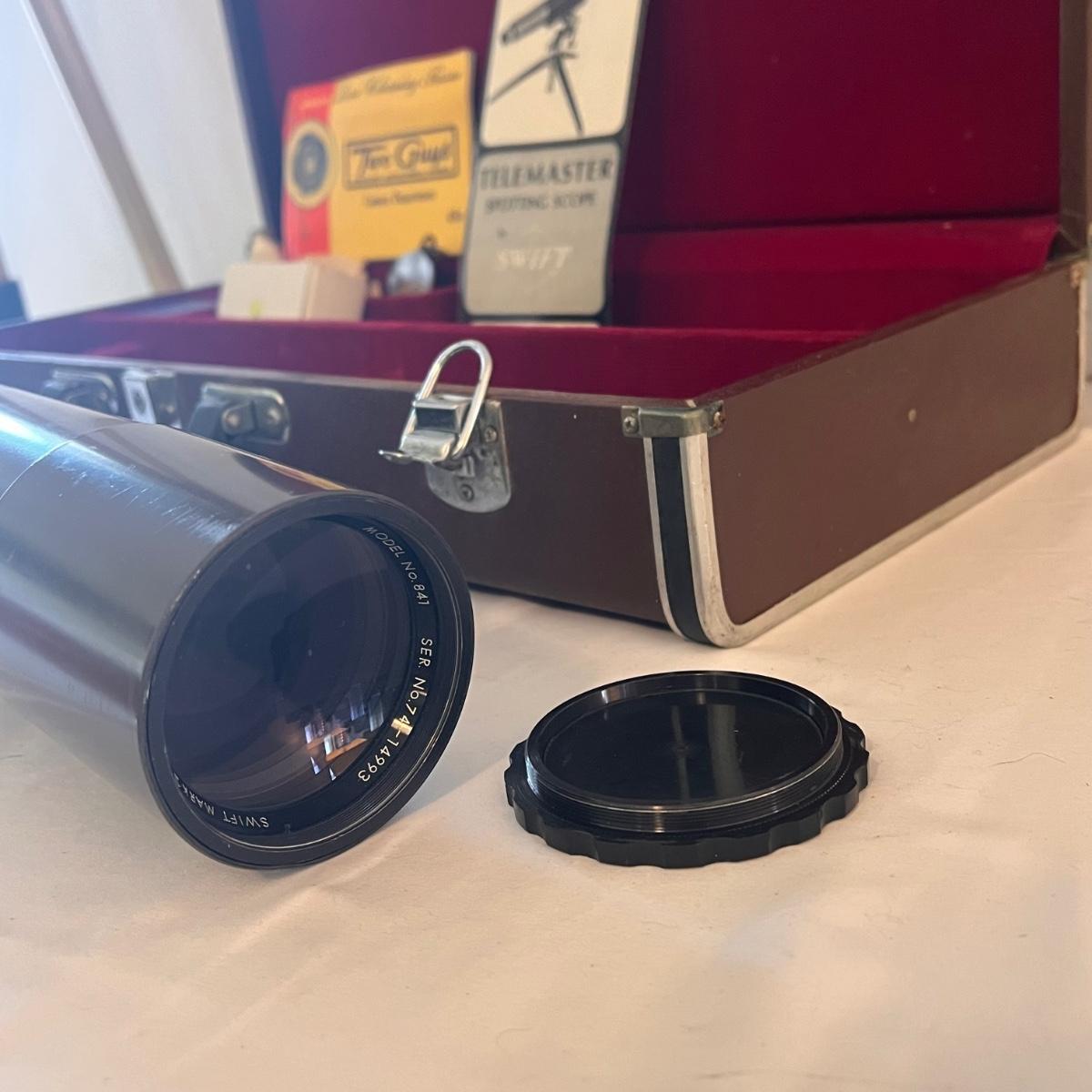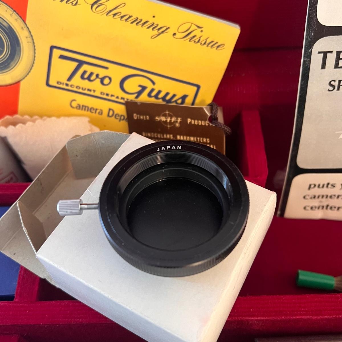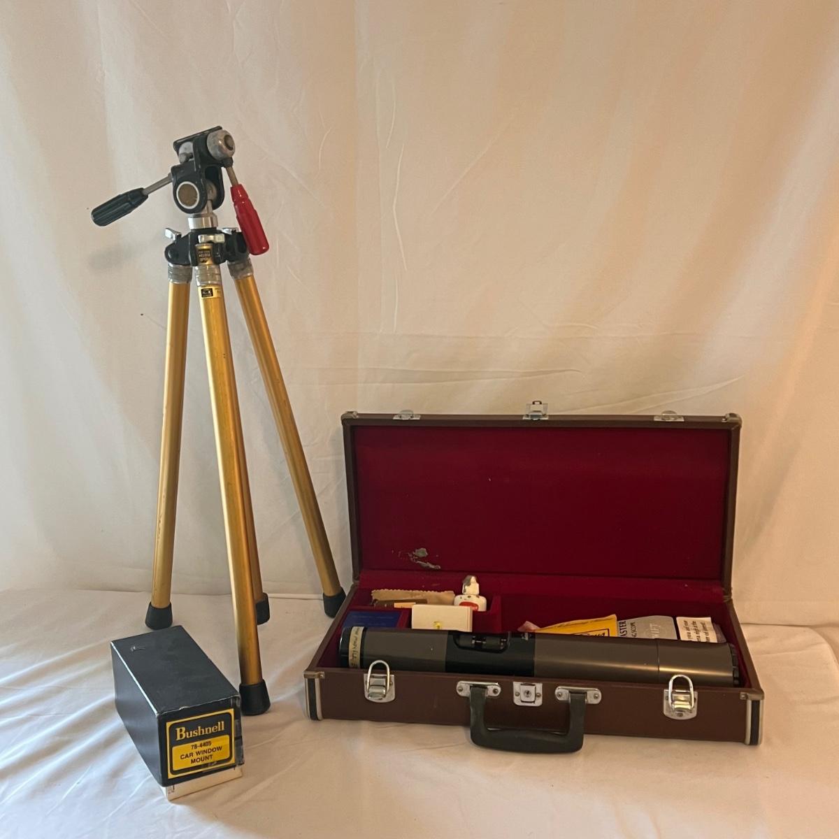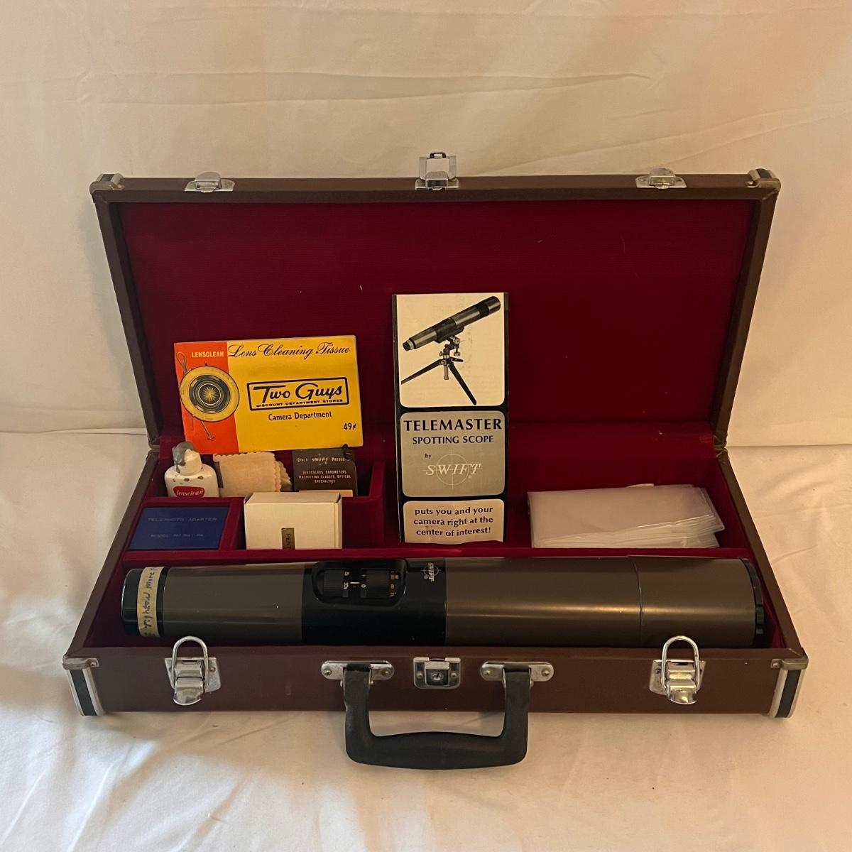 This set includes a 19.75” x 9.5”H carrying case with a Swift telescope, telephoto adapter, Pentax lens, and cleaning materials. A spotting scope stand with a welt/safe-lock and Bushnell car window mount are included as well. Shipping available.