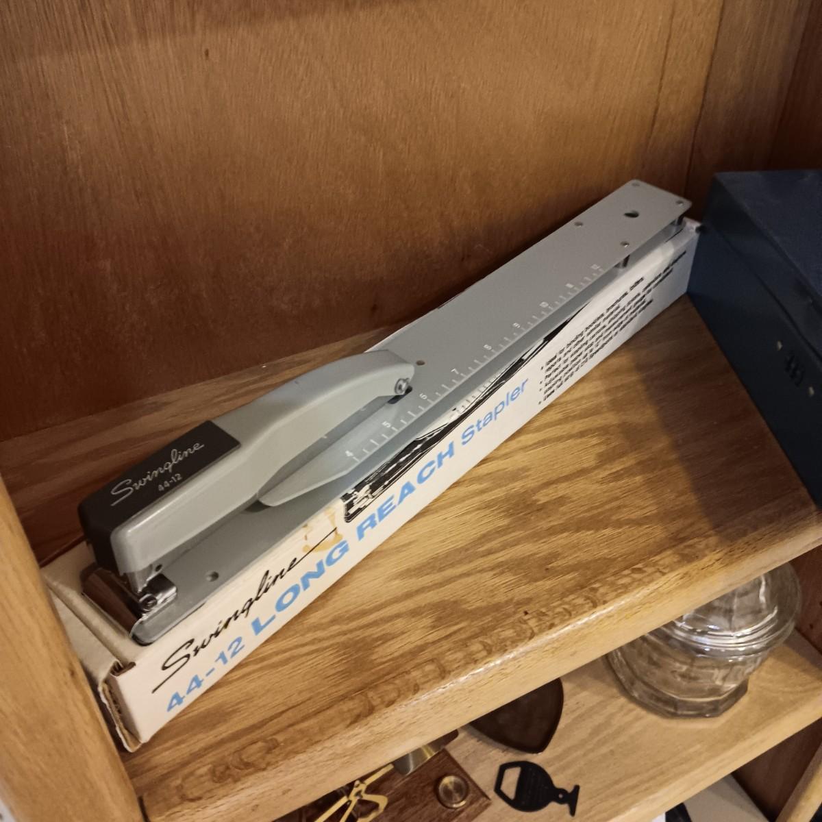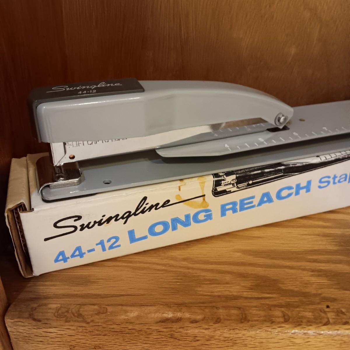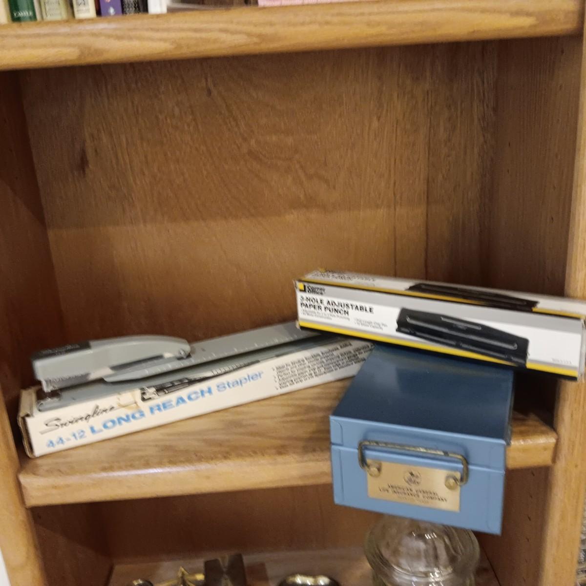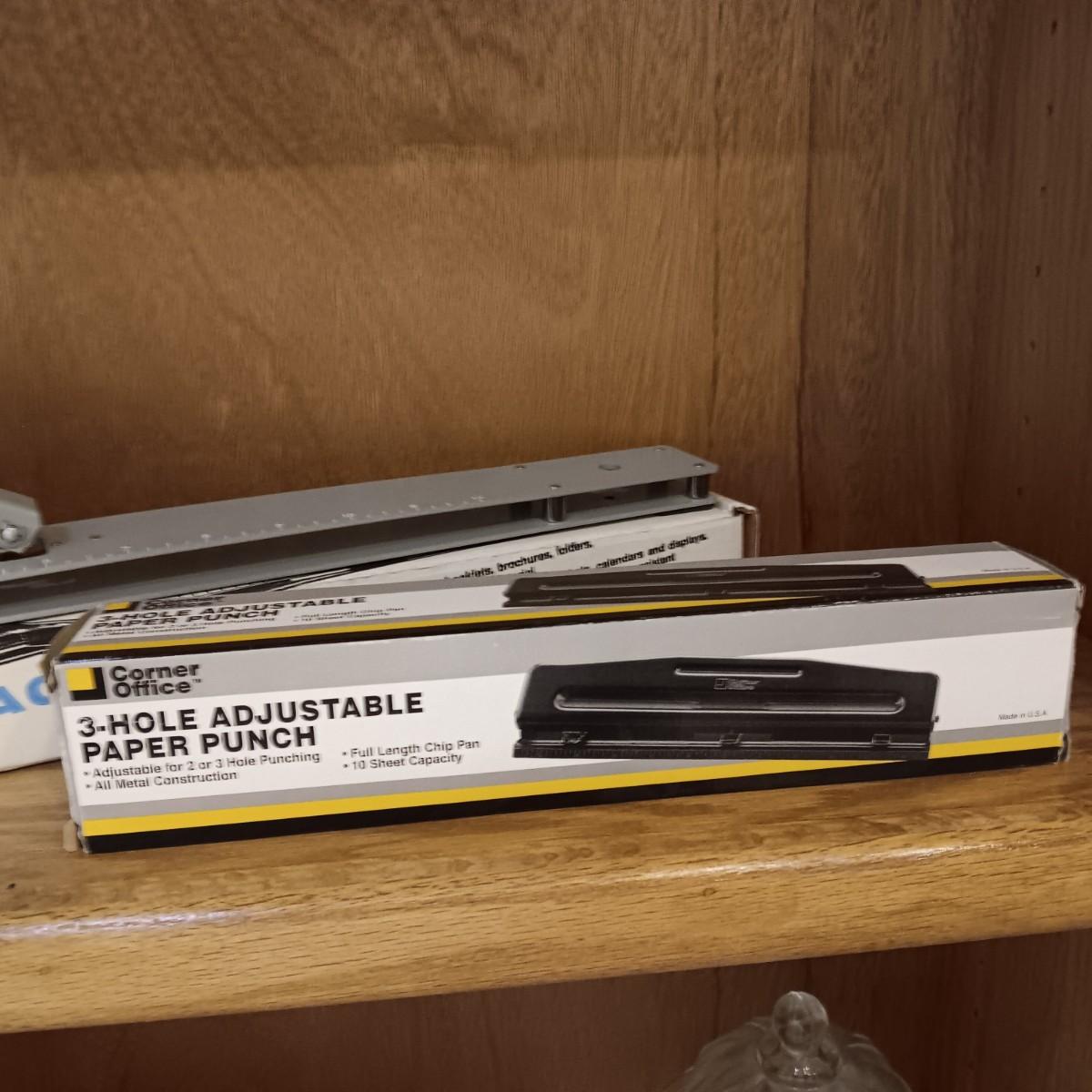 SWINGLINE LONG REACH STAPLER, 3 HOLE PUNCH AND A COMBINATION METAL BOX