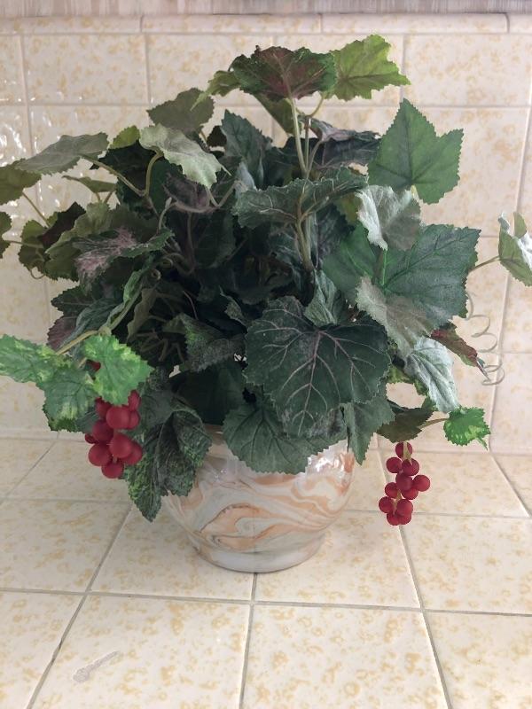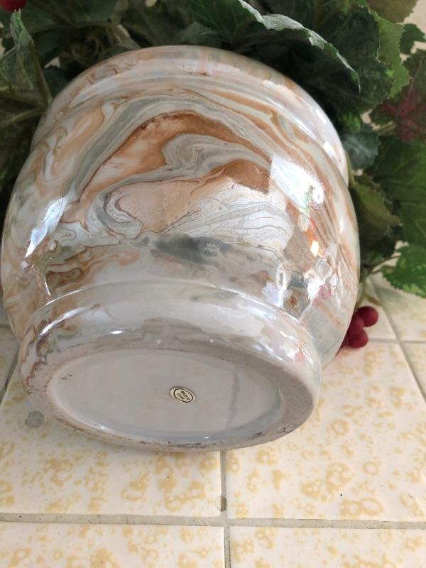 Small round planter with artificial greenry. Plater has a metallic pearlized effect to it.