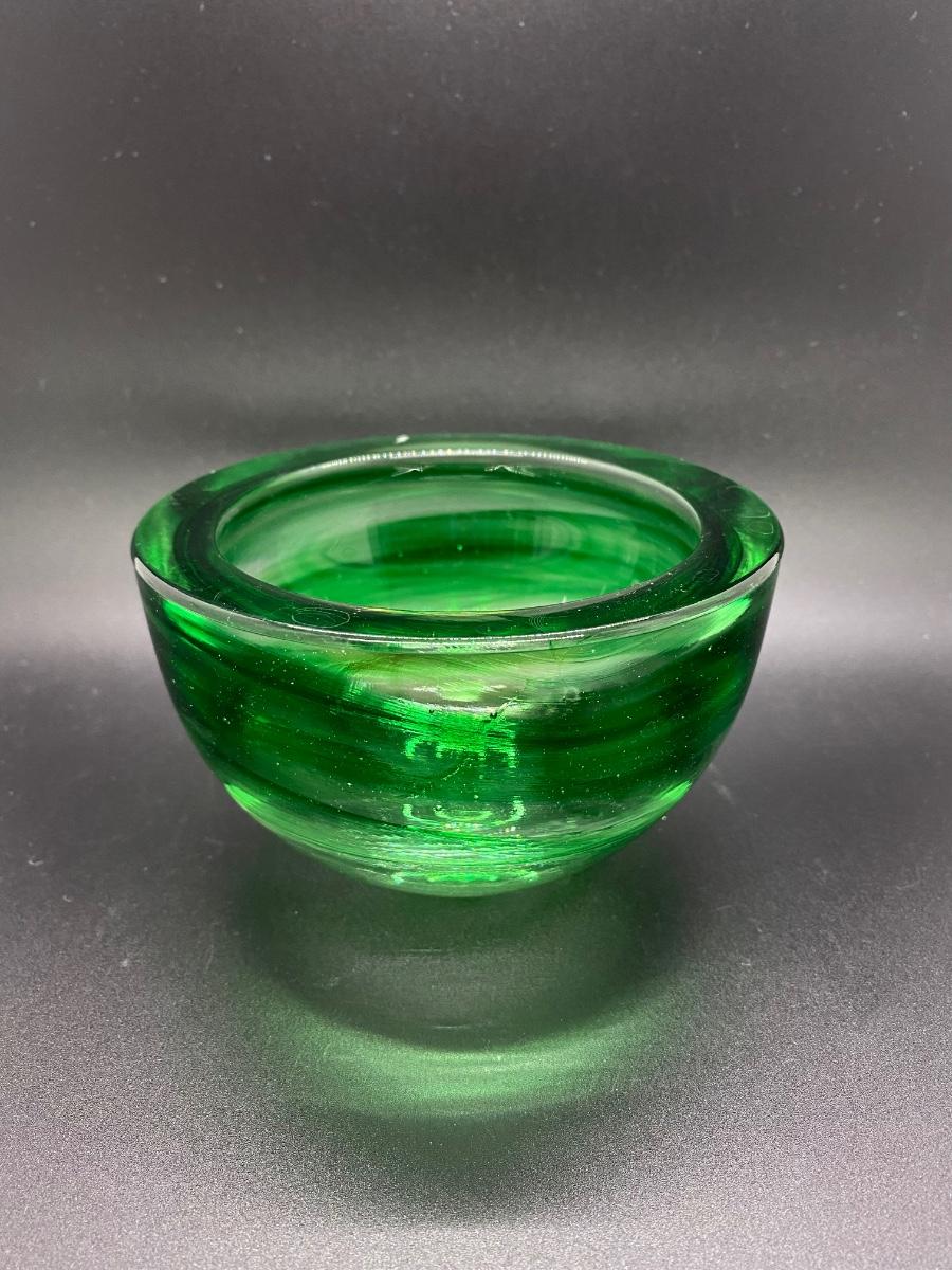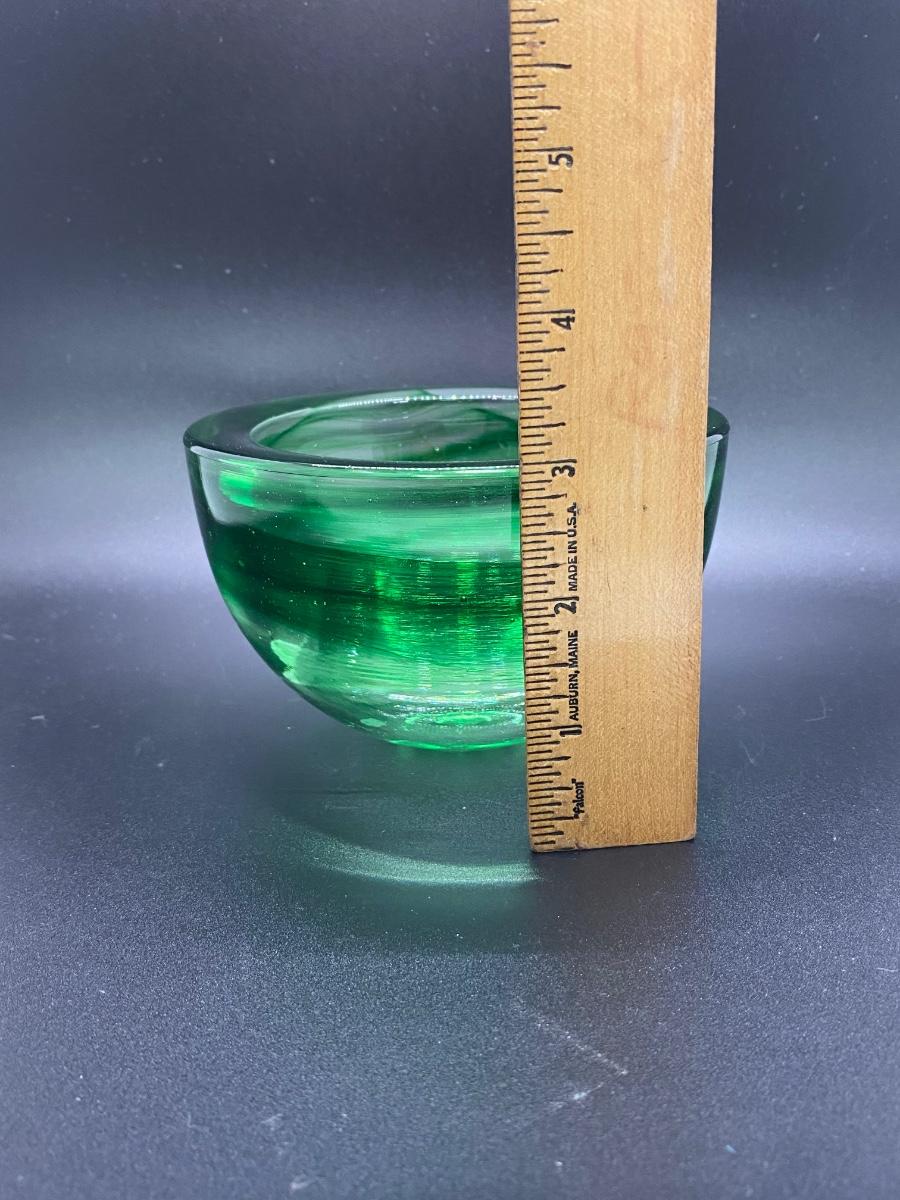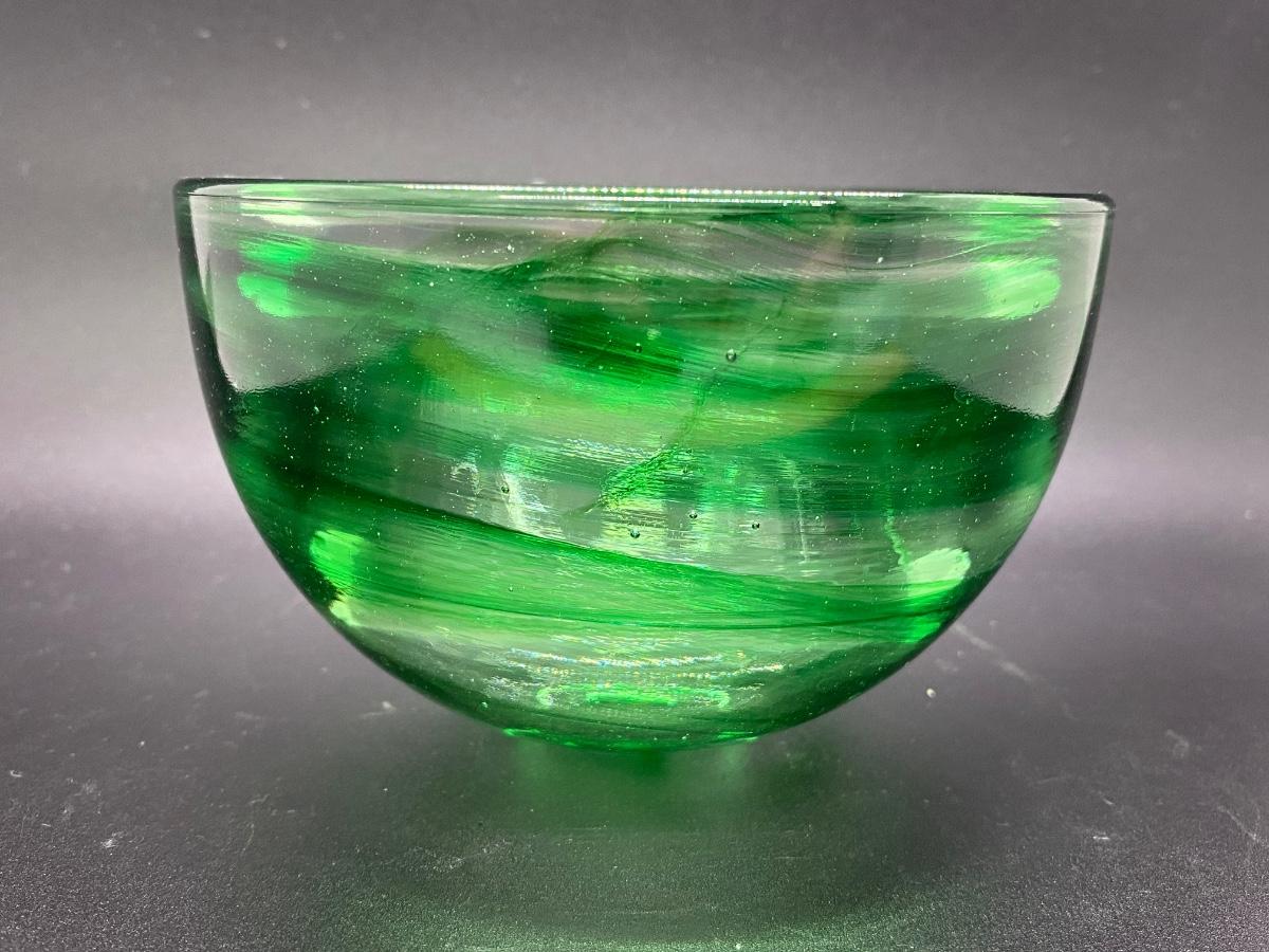 Swirled green & clear art glass bowl. Thick, heavy glass. looks it may be pressed by the impression on bottom. In good condition, no chips. There are small air bubbles in the glass. About 3" tall and under 5" wide.