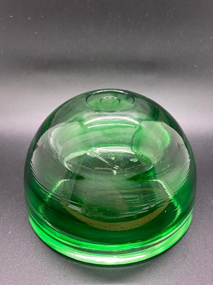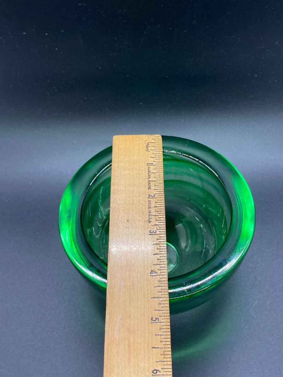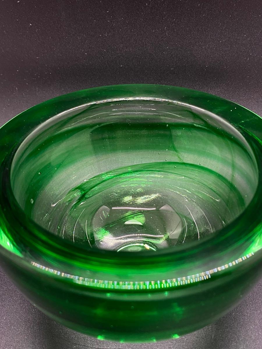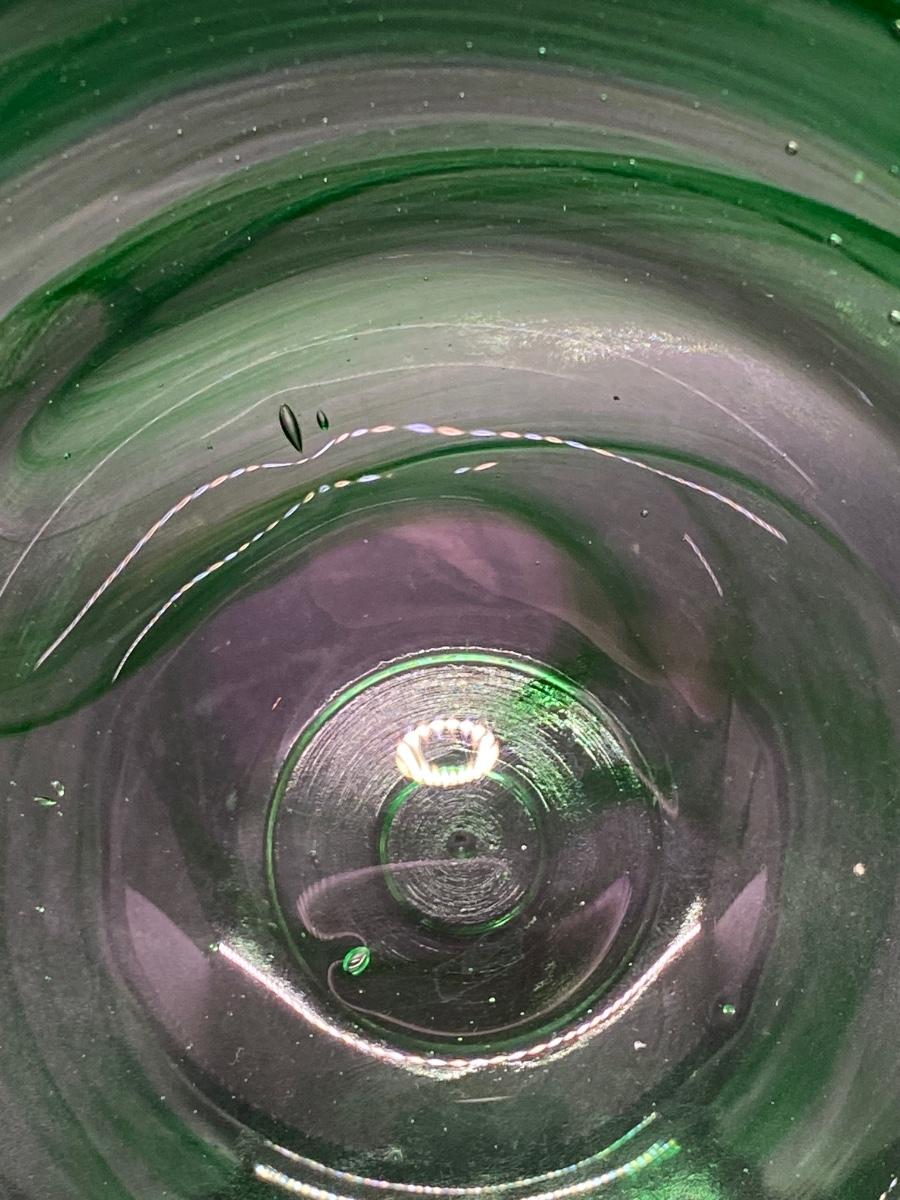 Swirled green & clear art glass bowl. Thick, heavy glass. looks it may be pressed by the impression on bottom. In good condition, no chips. There are small air bubbles in the glass. About 3" tall and under 5" wide.
