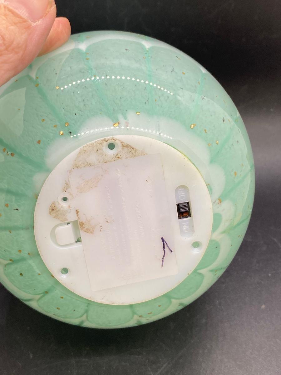 Swirled green glass battery operated light. Green and white "Dragons Egg" looks good day or night. Great on the shelf or outside in the garden. Works. In good condition, about 8" size.