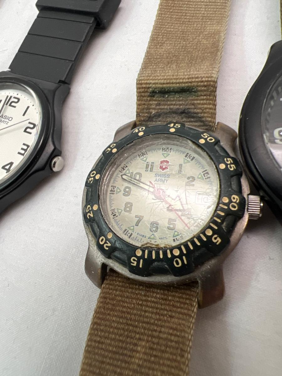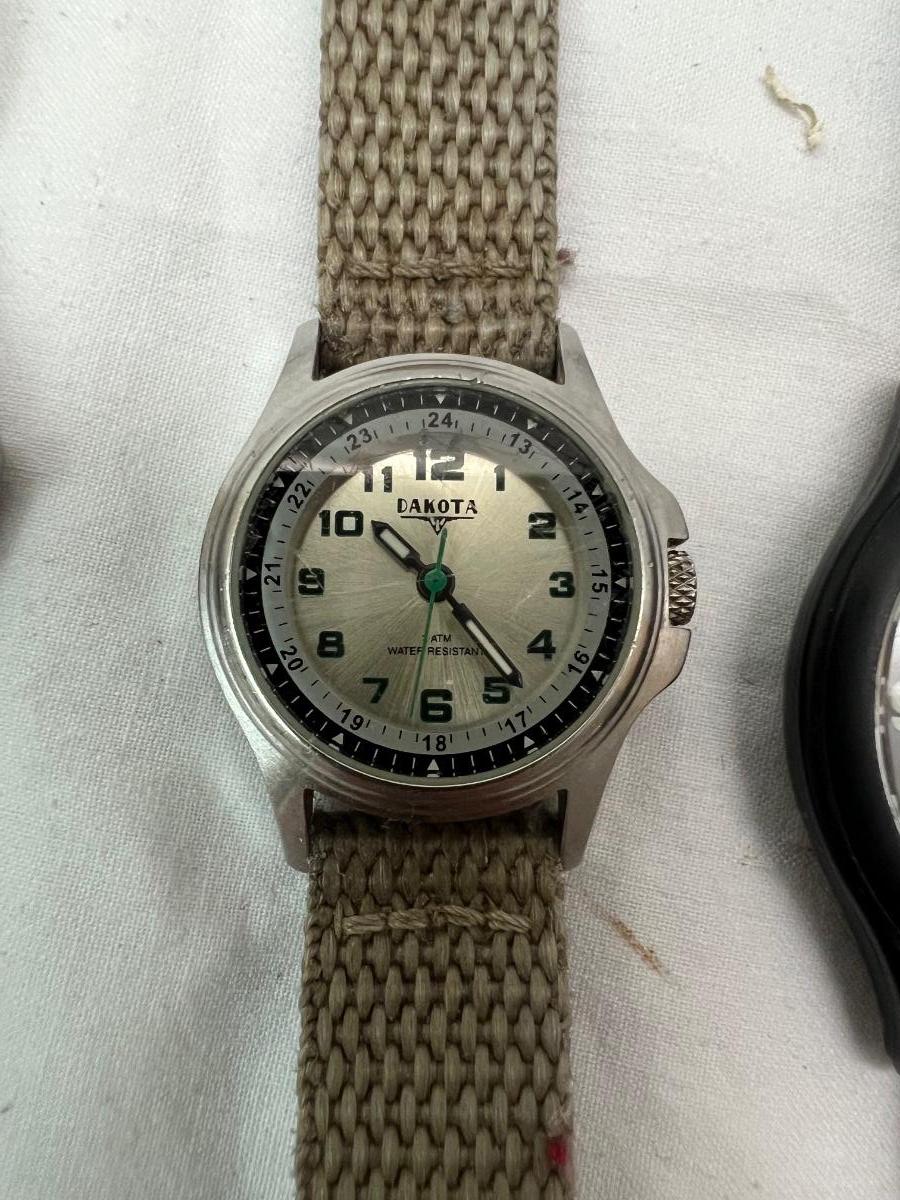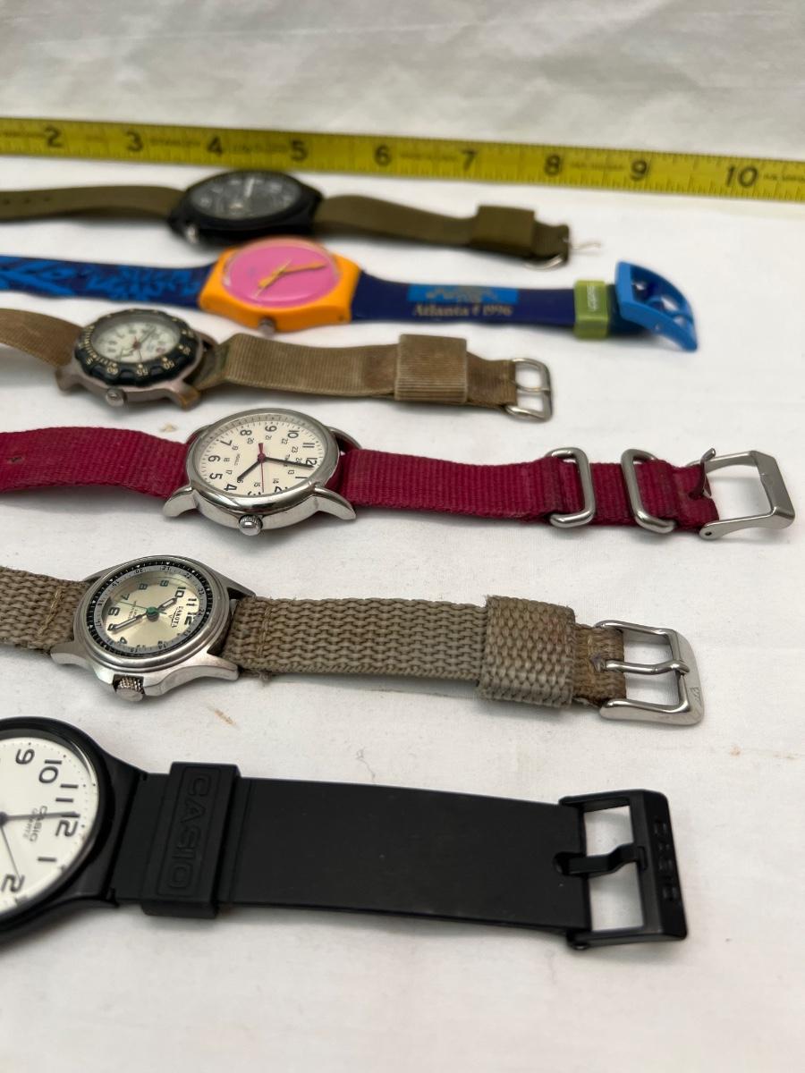 Six watches altogether that includes Swiss Army, Timex, Swatch and more. The Swatch commemorates the 1996 Atlanta Olympic Games. No watches are currently running and likely need new batteries. Some minor scratches on watch faces.