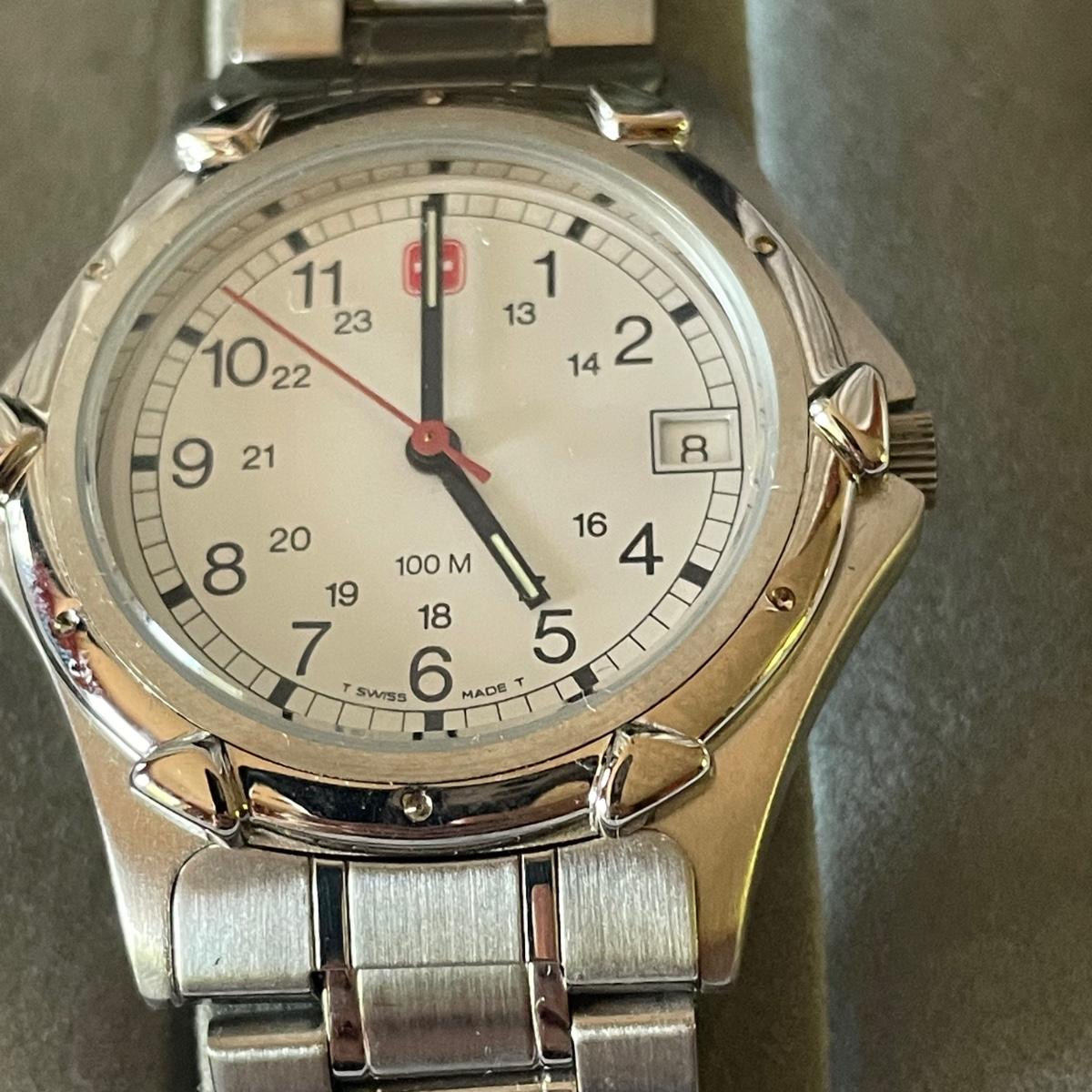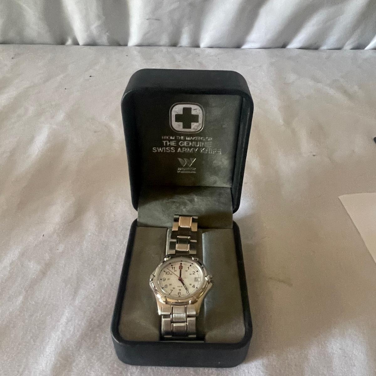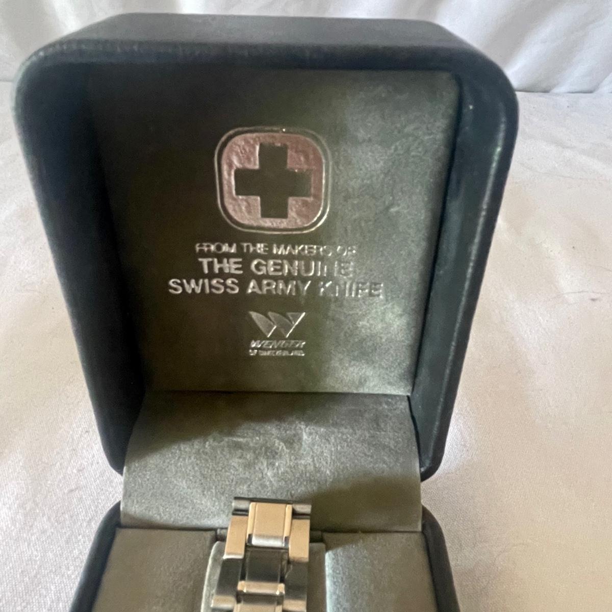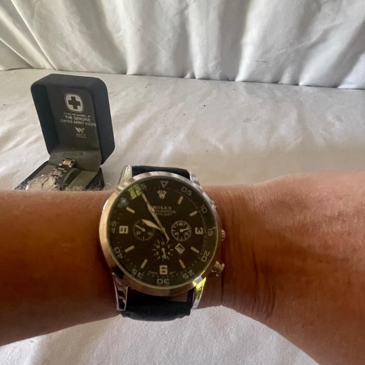 This Swiss Army watch comes with its original box and is in excellent condition but does need a new battery and was therefore not tested. The other watch says Rolex but appears to be an imitation due to its very light weight. Small Swiss Army pocket knife also included.