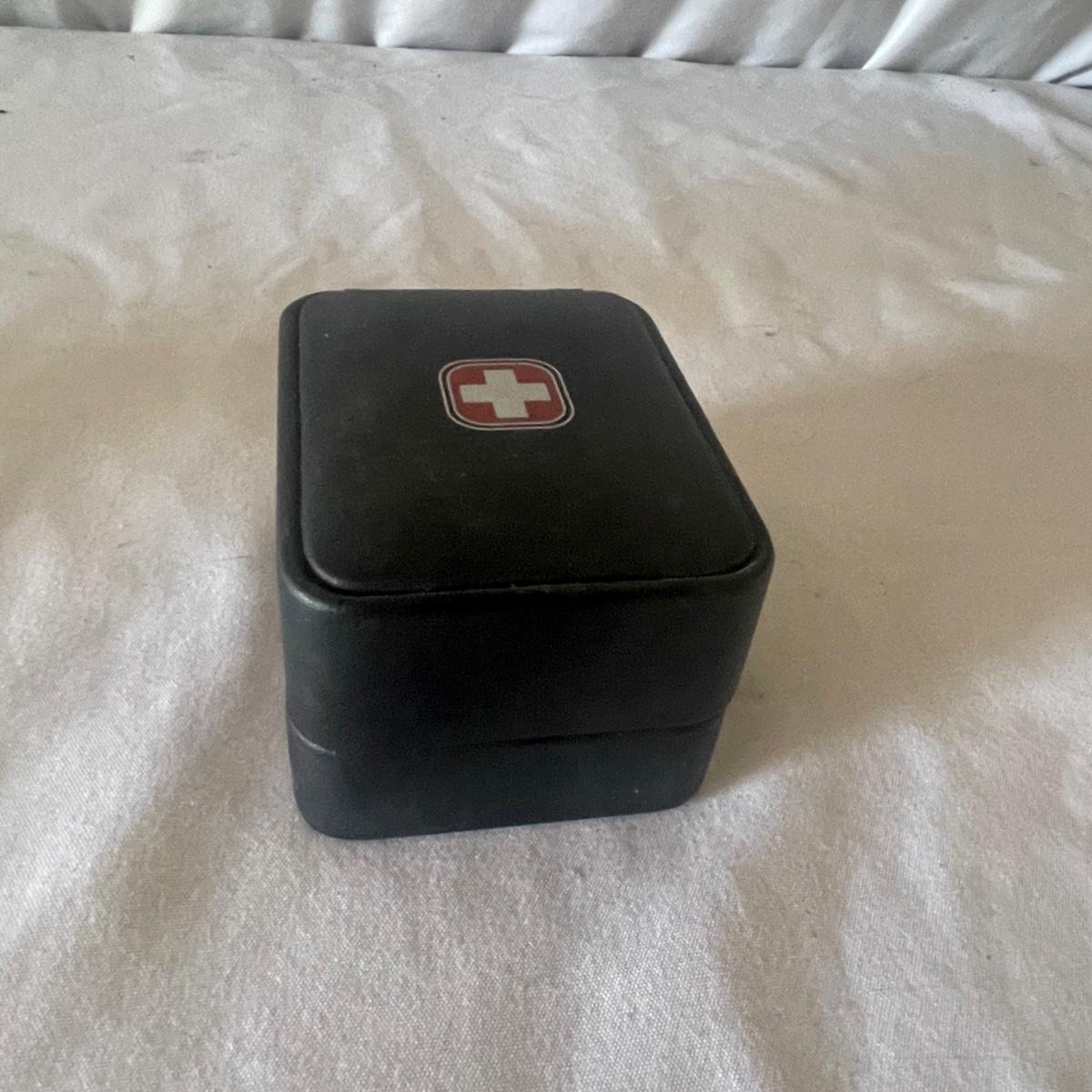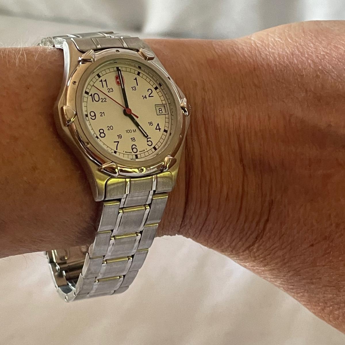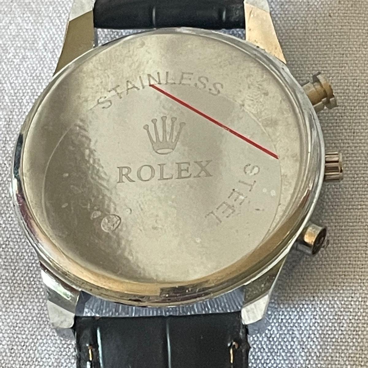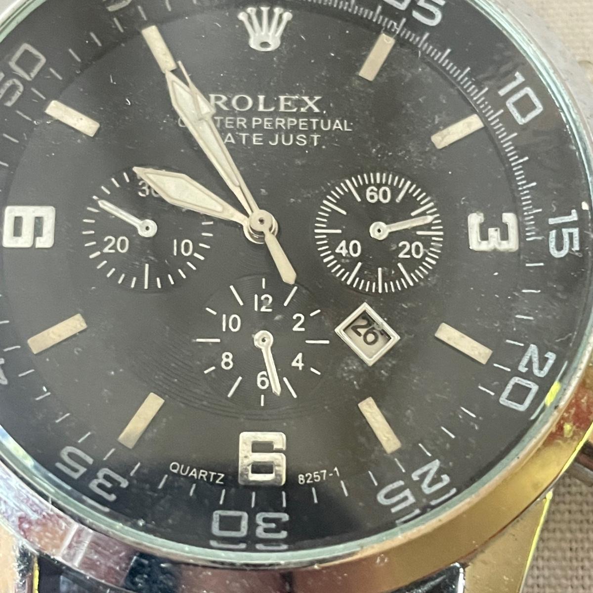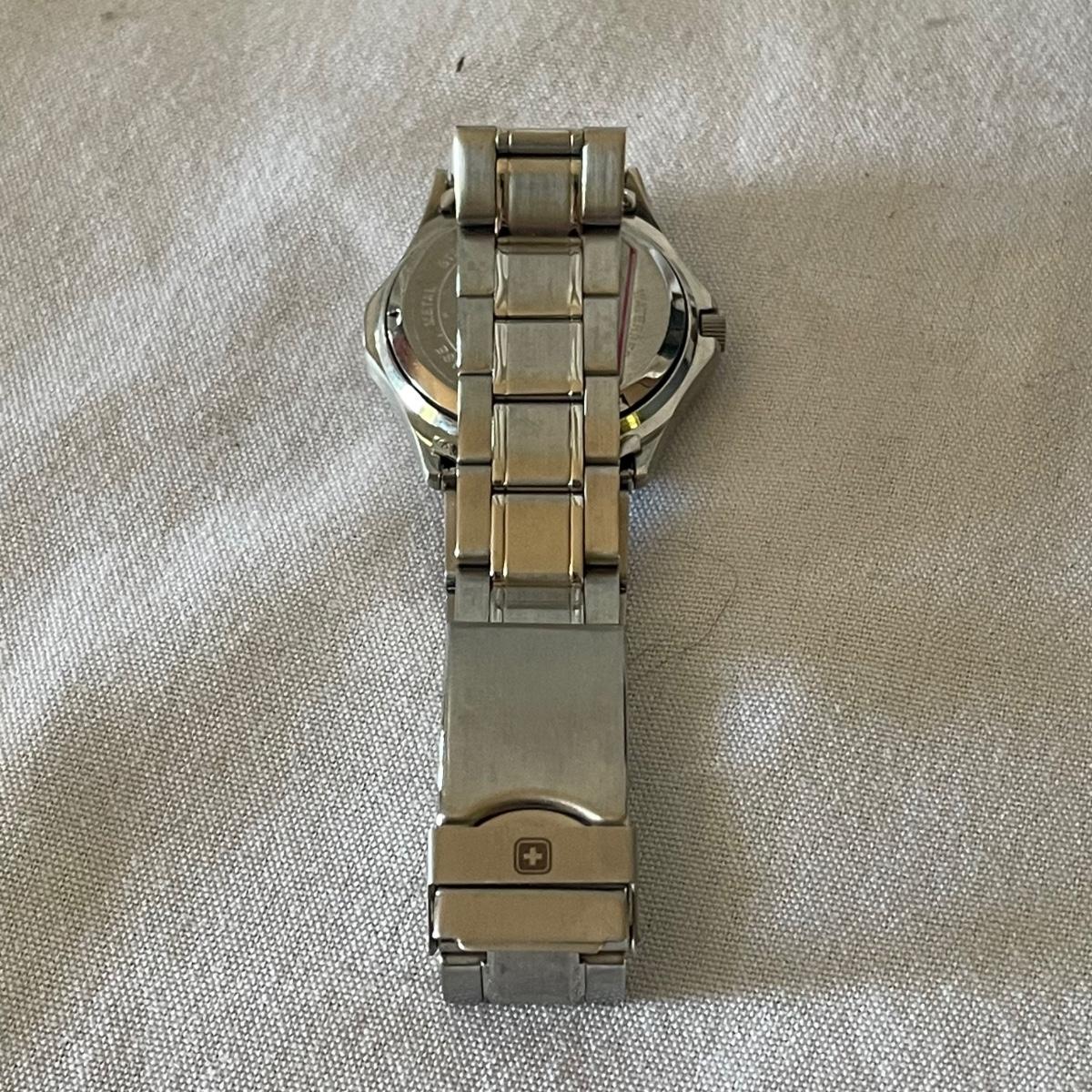 This Swiss Army watch comes with its original box and is in excellent condition but does need a new battery and was therefore not tested. The other watch says Rolex but appears to be an imitation due to its very light weight. Small Swiss Army pocket knife also included.
