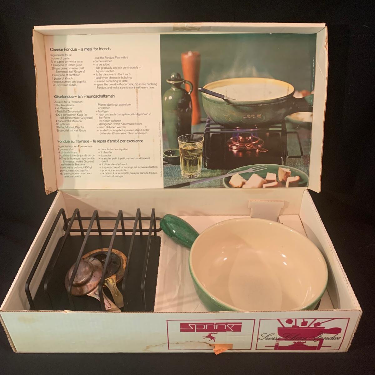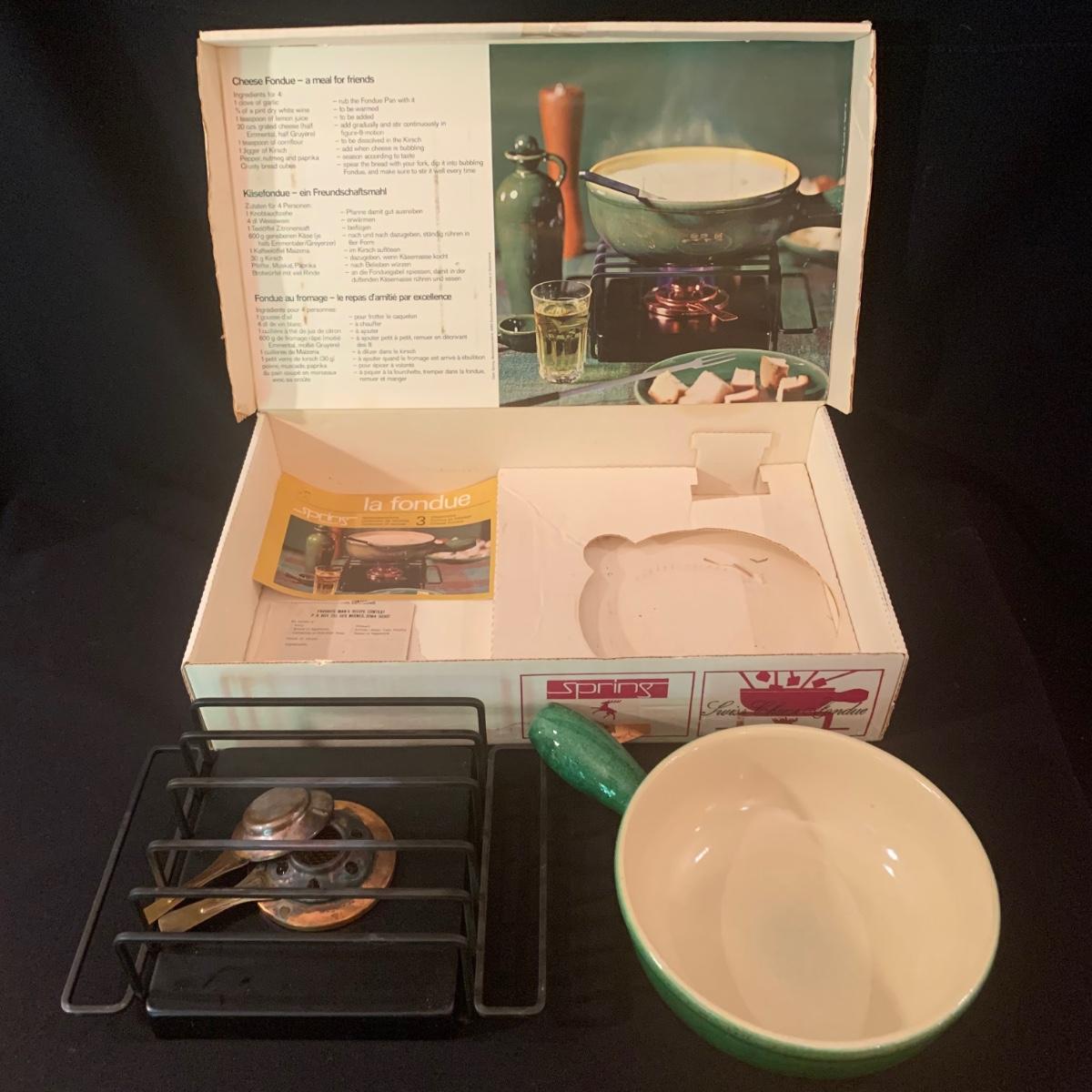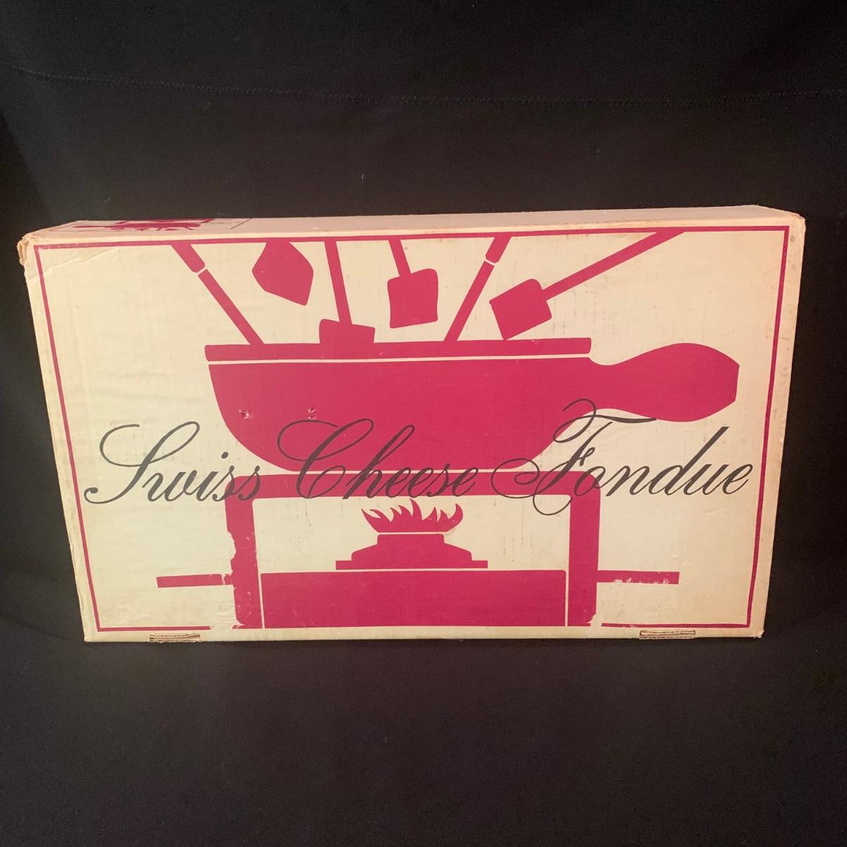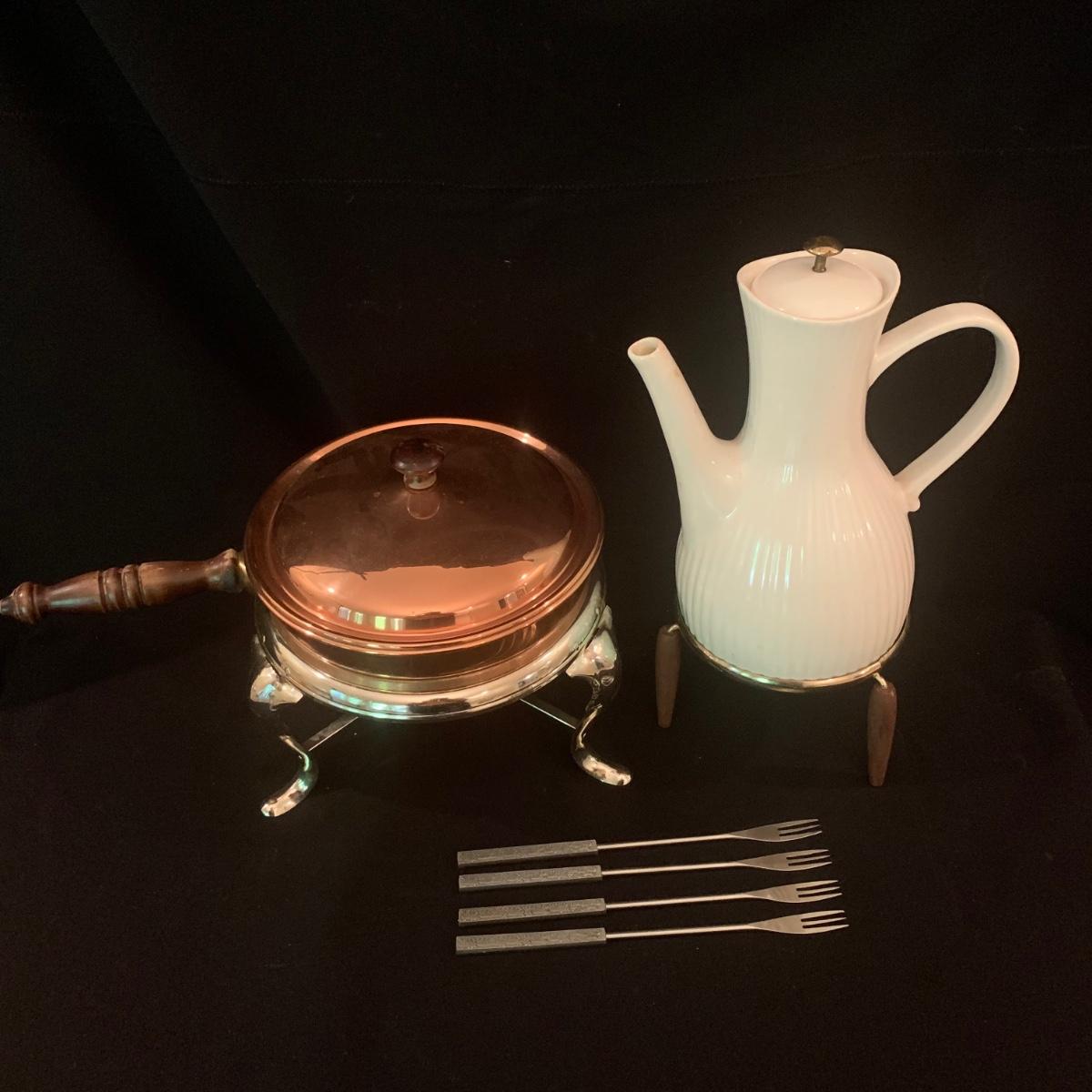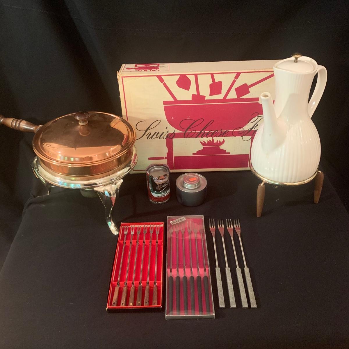This lot contains a boxed Swiss Cheese Fondue Set, four sterno chafing fuels, three sets of fondue forks, a ceramic kettle with burner, and chafing dish with burner and copper-like wood handled pot. All items have been used, please see photos for more details. Copper pot and burner measure, 10.5”D x 10.5”H. Local pickup only.