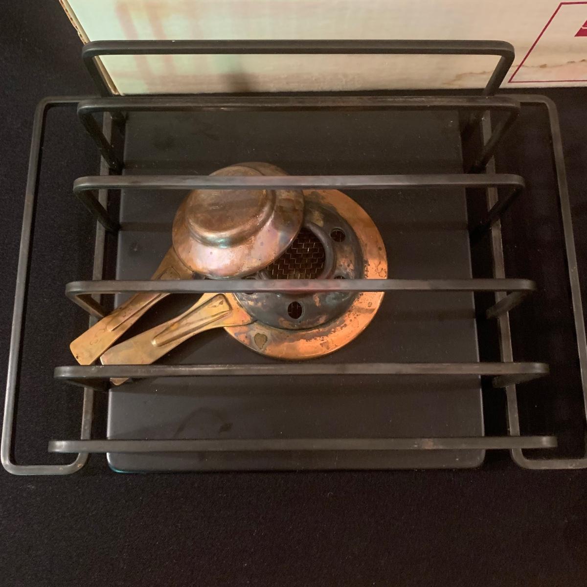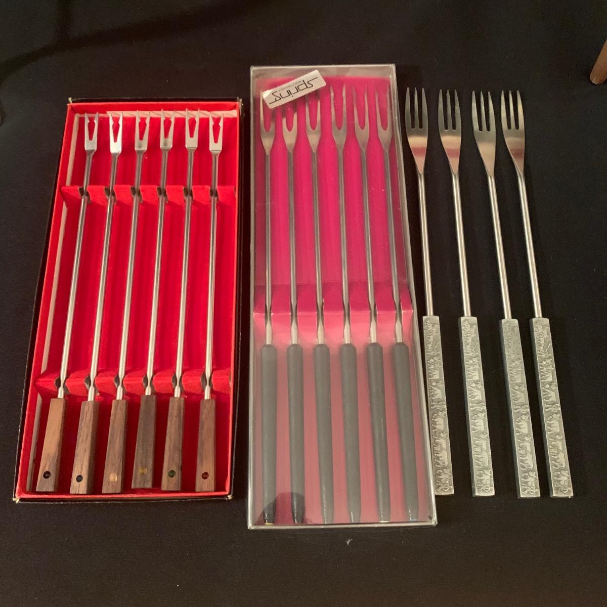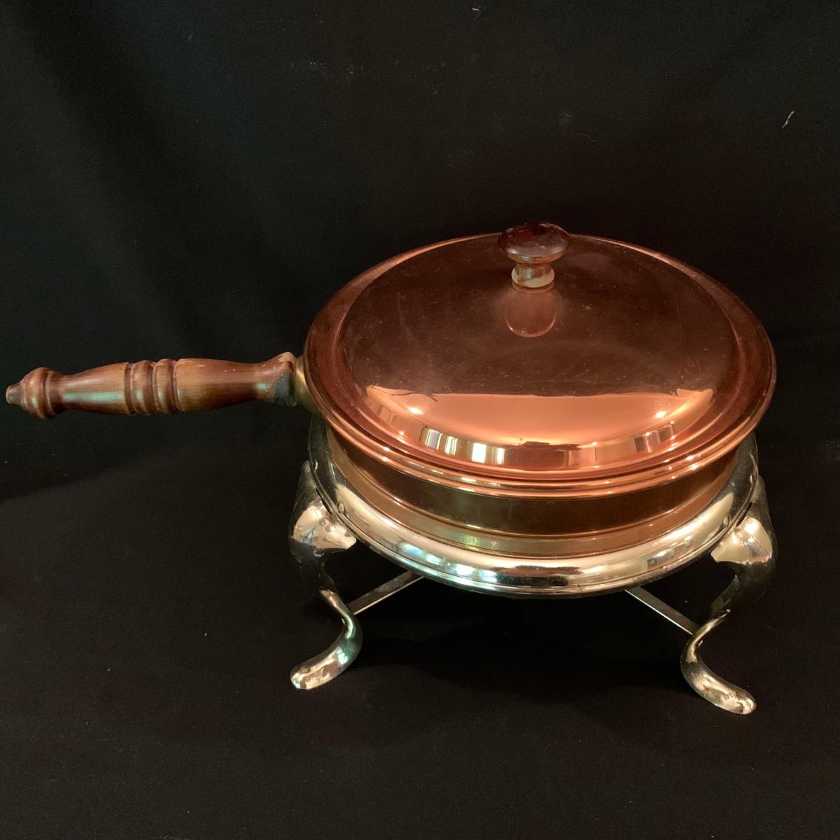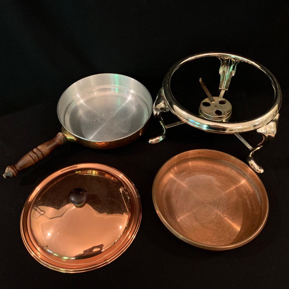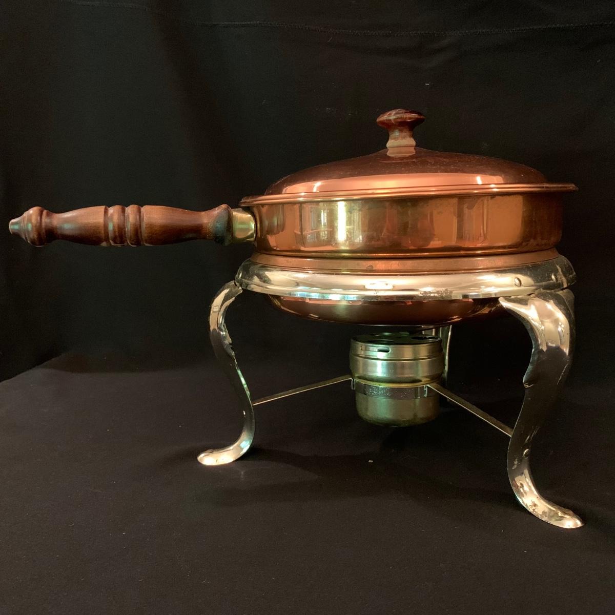 This lot contains a boxed Swiss Cheese Fondue Set, four sterno chafing fuels, three sets of fondue forks, a ceramic kettle with burner, and chafing dish with burner and copper-like wood handled pot. All items have been used, please see photos for more details. Copper pot and burner measure, 10.5”D x 10.5”H. Local pickup only.