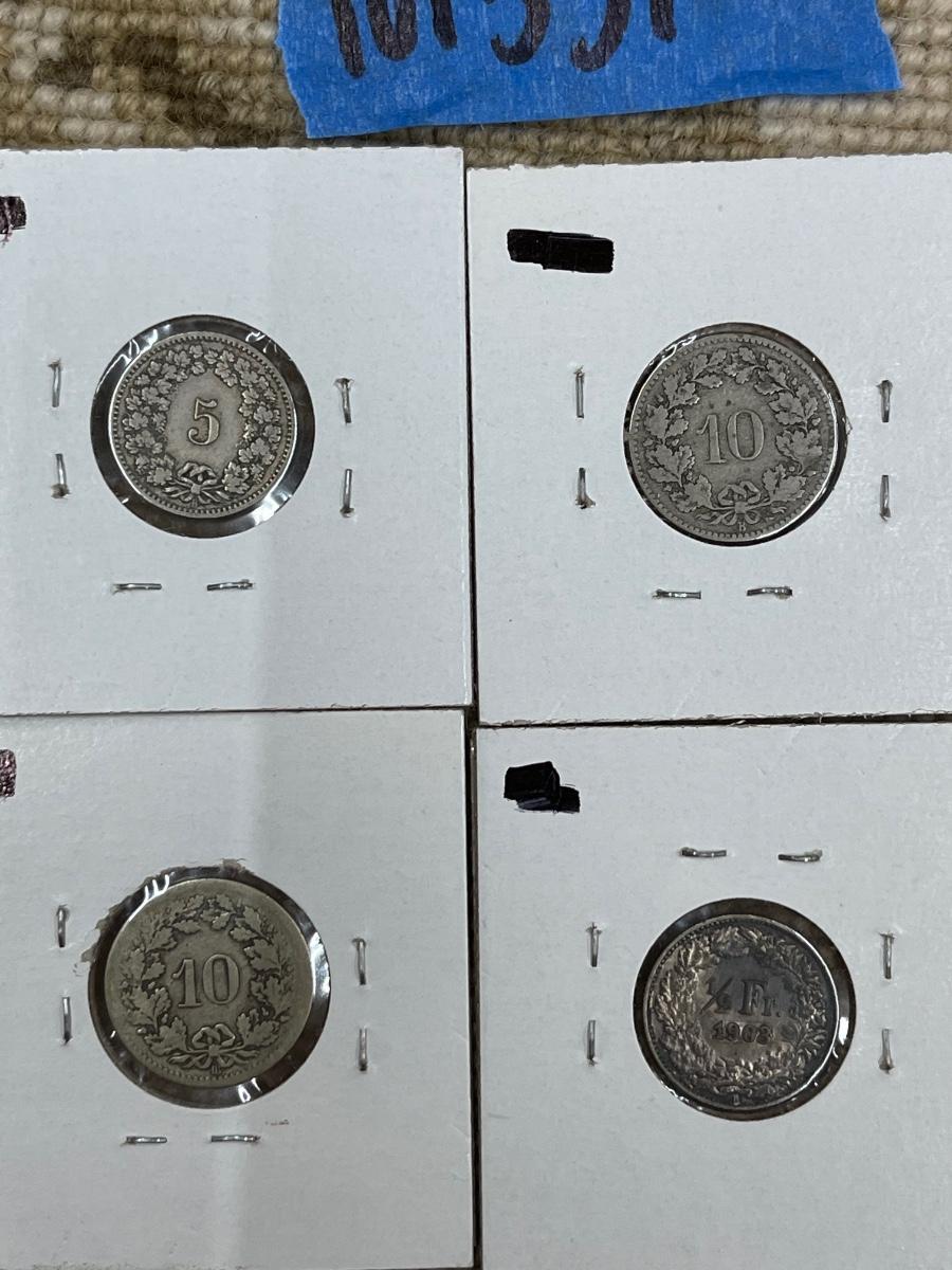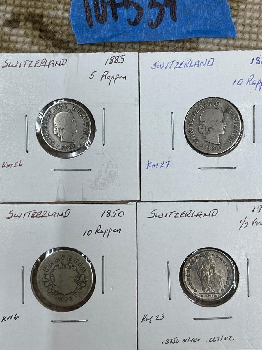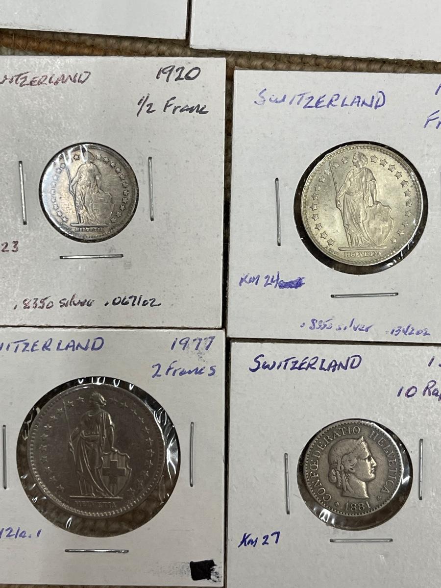 (8) vintage Switzerland coins - 1885 5 Rappen, 1880 10 rappen, 1850 10 rappen, 1903 1/2 franc, 1920 1/2 franc, 1964 franc, 1977 2 francs, 1881B 10 rappen.