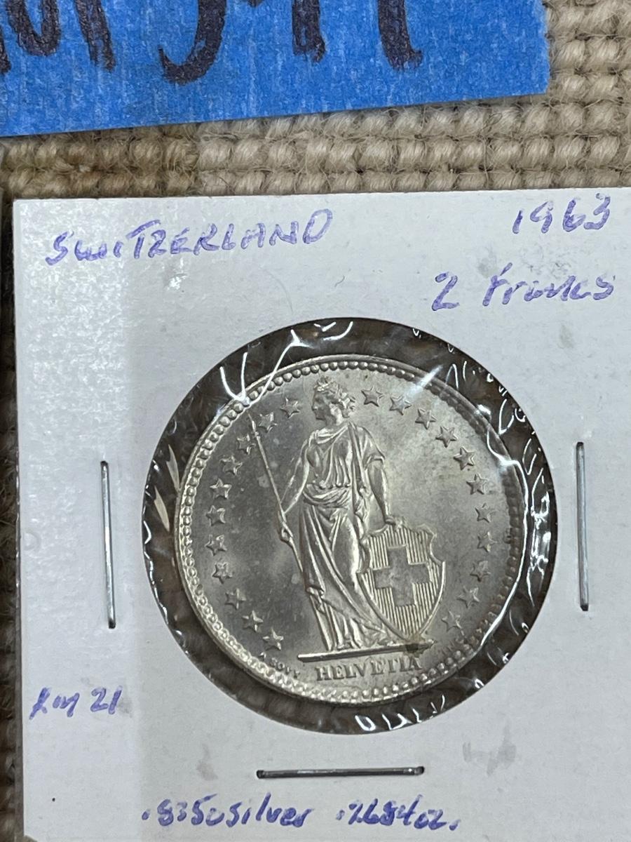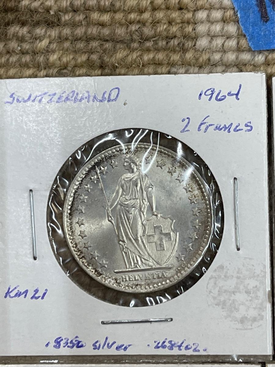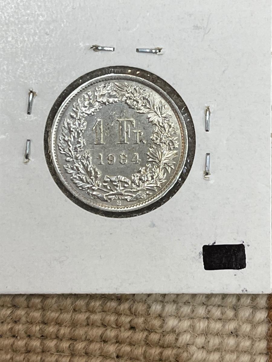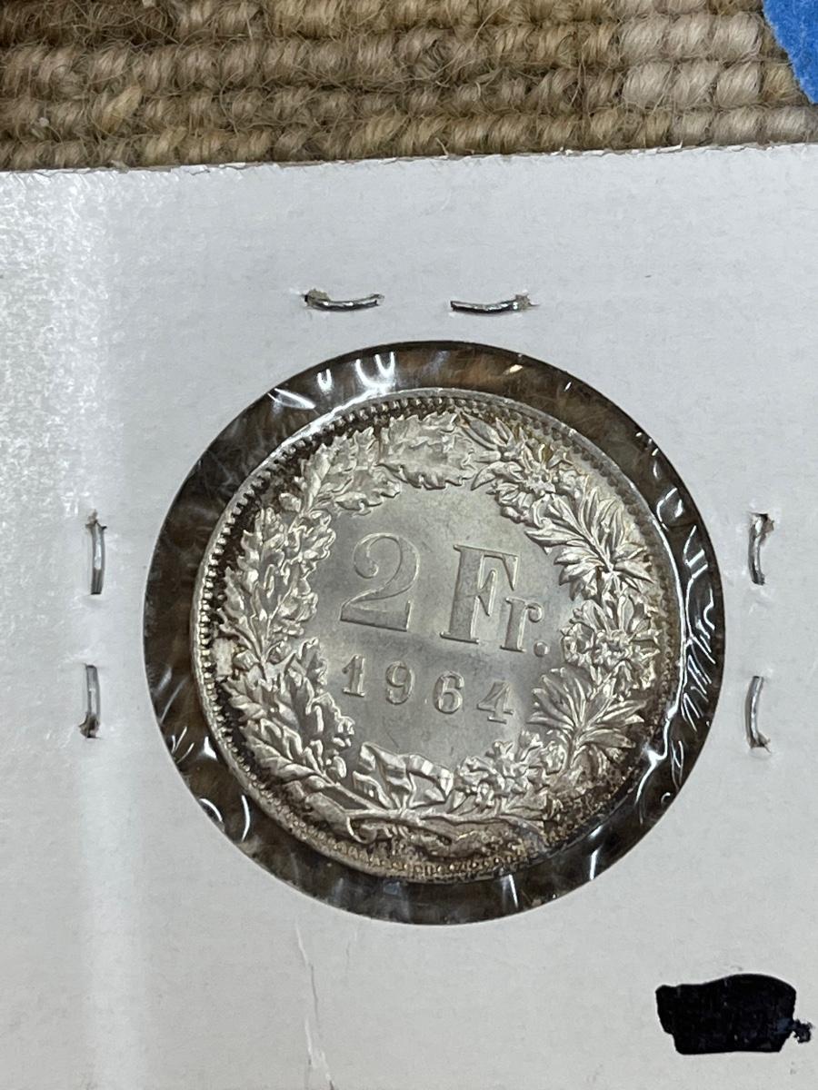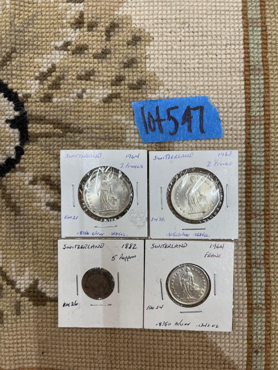 (4) vintage Switzerland coins - 1964 2 francs, 1963 2 francs, 1882 5 rappen, 1964 franc.