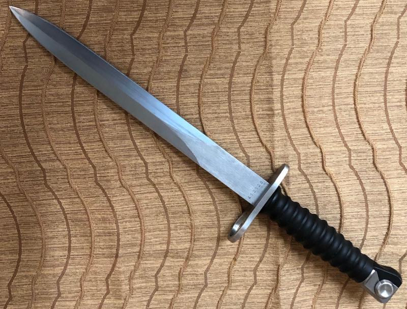 Old Swiss Military bayonet made by Sig Sauer, 9 1/2" blade 14 1/2" blade. This is very high quality steel these were made either by Solingen or Victorinox. Fits the Swiss rifle The SIG SG 510 or Sturmgewehr 57. Can ship anywhere in the US for $9.95 Buy 2 and get $10 off, same price to ship.