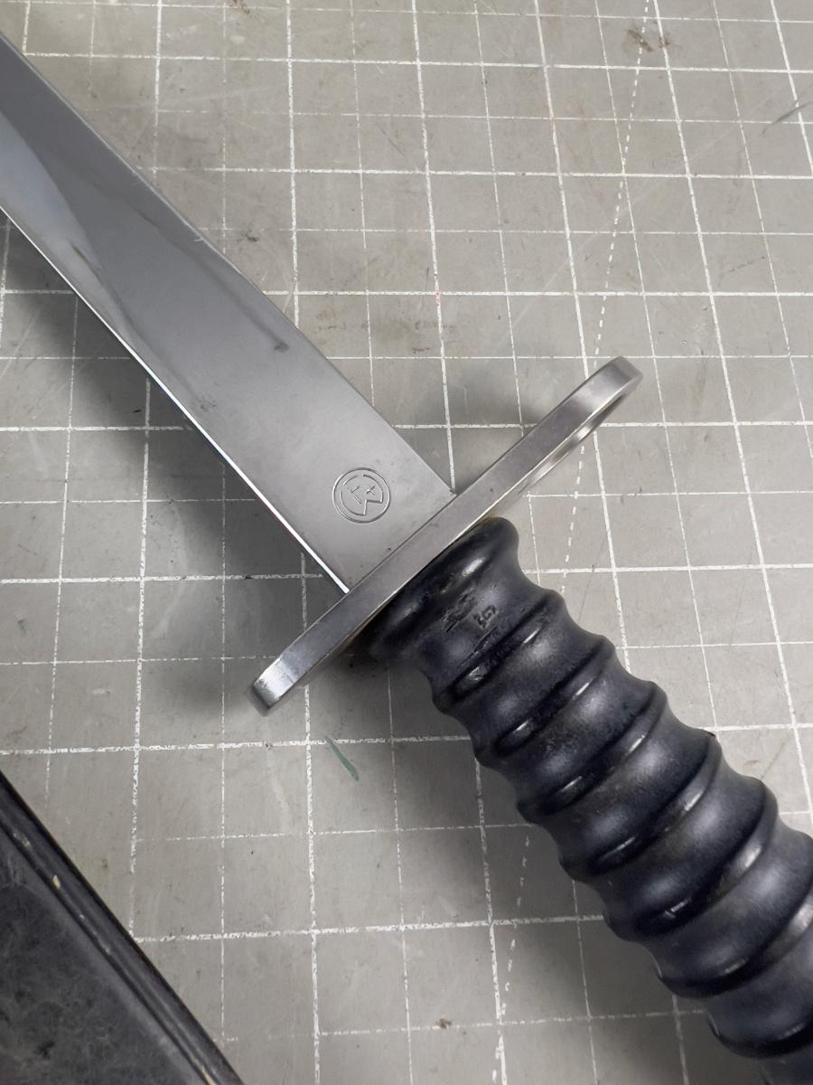 Minor scuffs on scabbard, no impact on functionality. Blade length = 9.5 inches, Handle length = 5 inches.