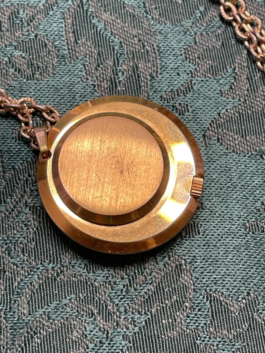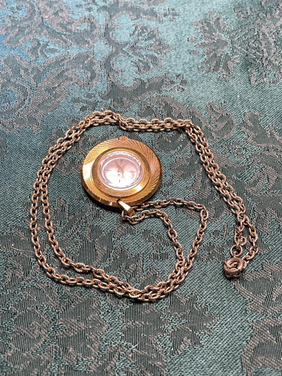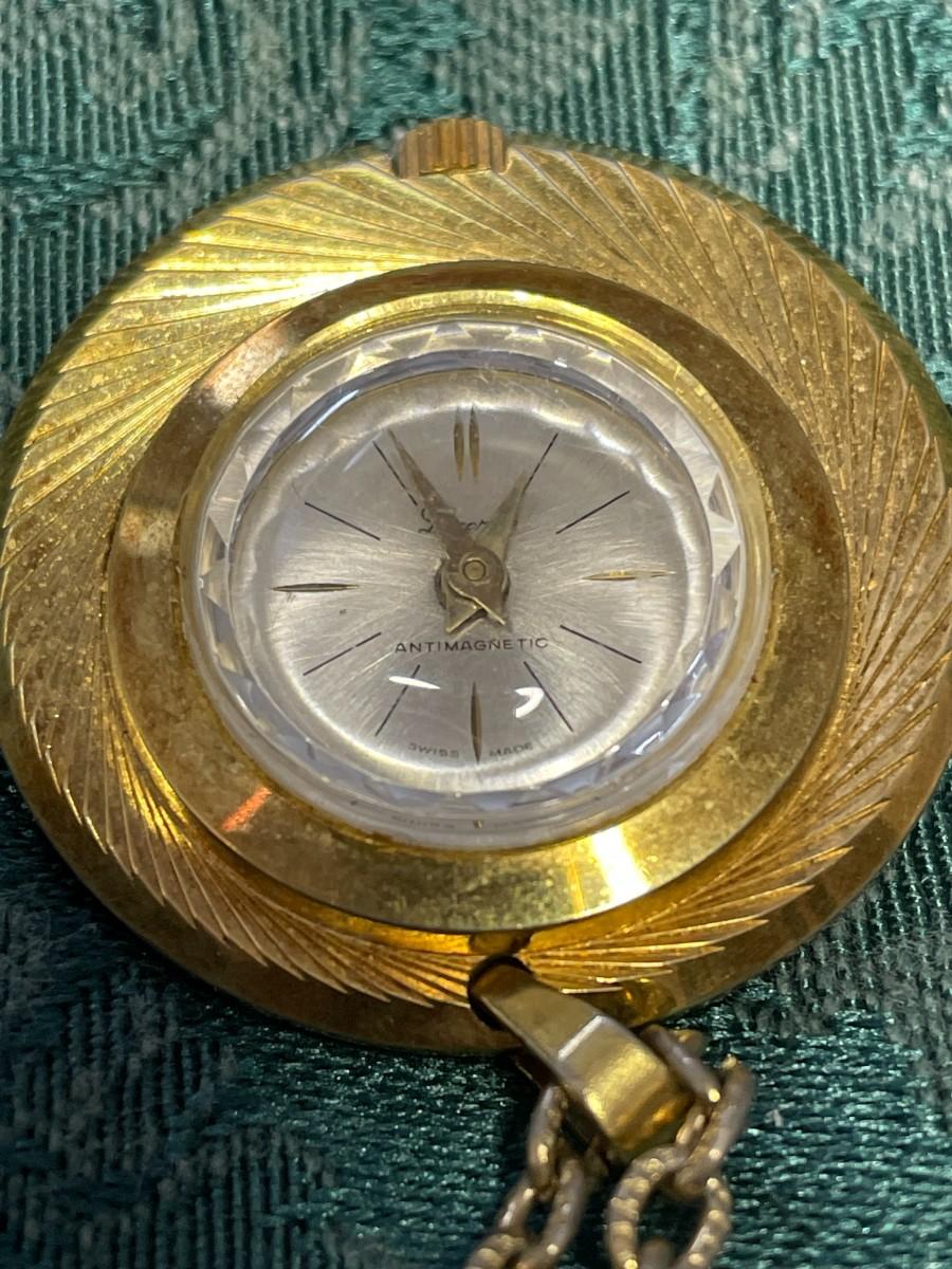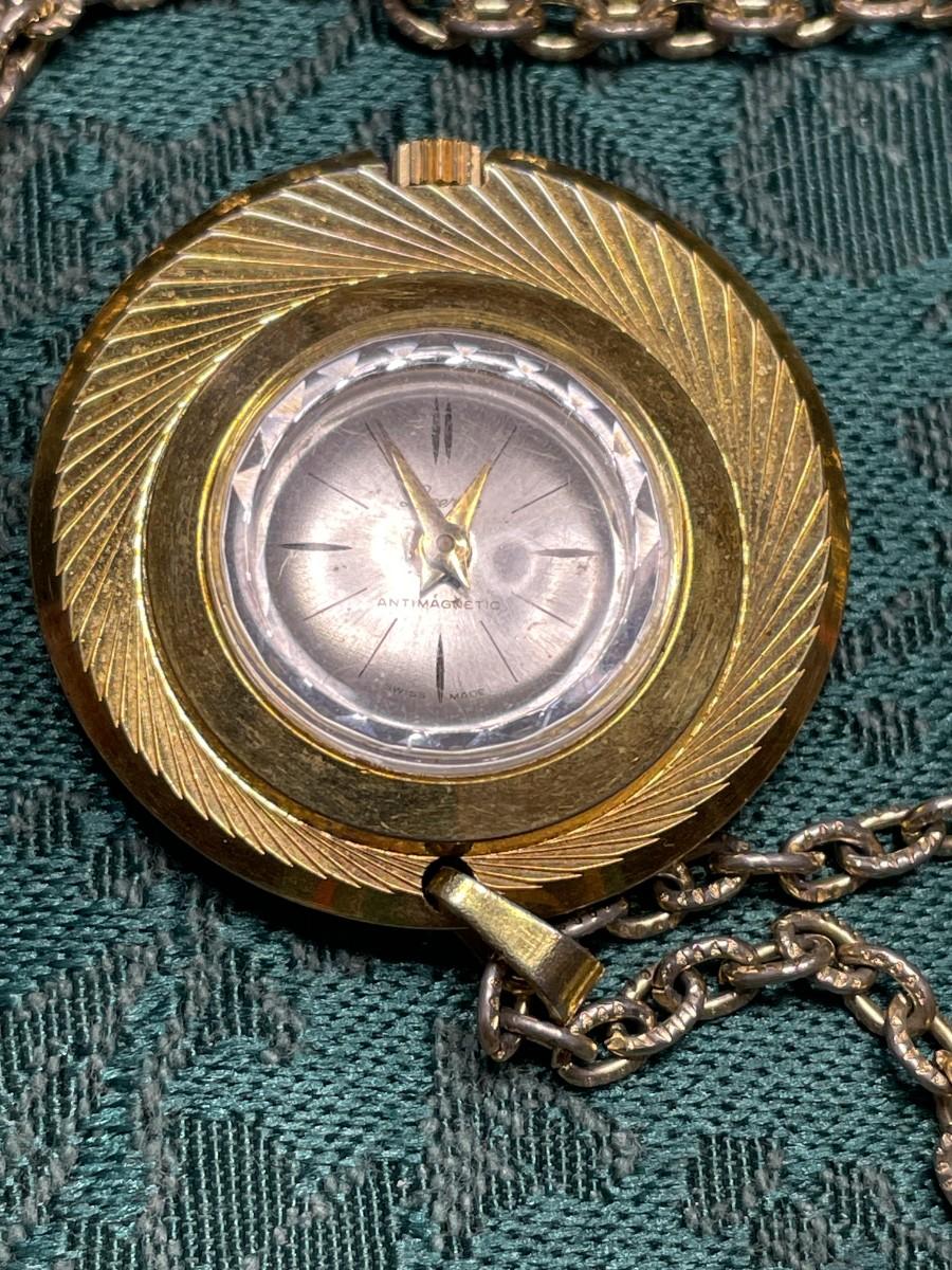 I did wind this up and it did seem to work, but I am not going to guarantee how well. It is marked Lucerne Antimagnetic Swiss Made on the face and is a gold tone metal. The chain is about 24" long.