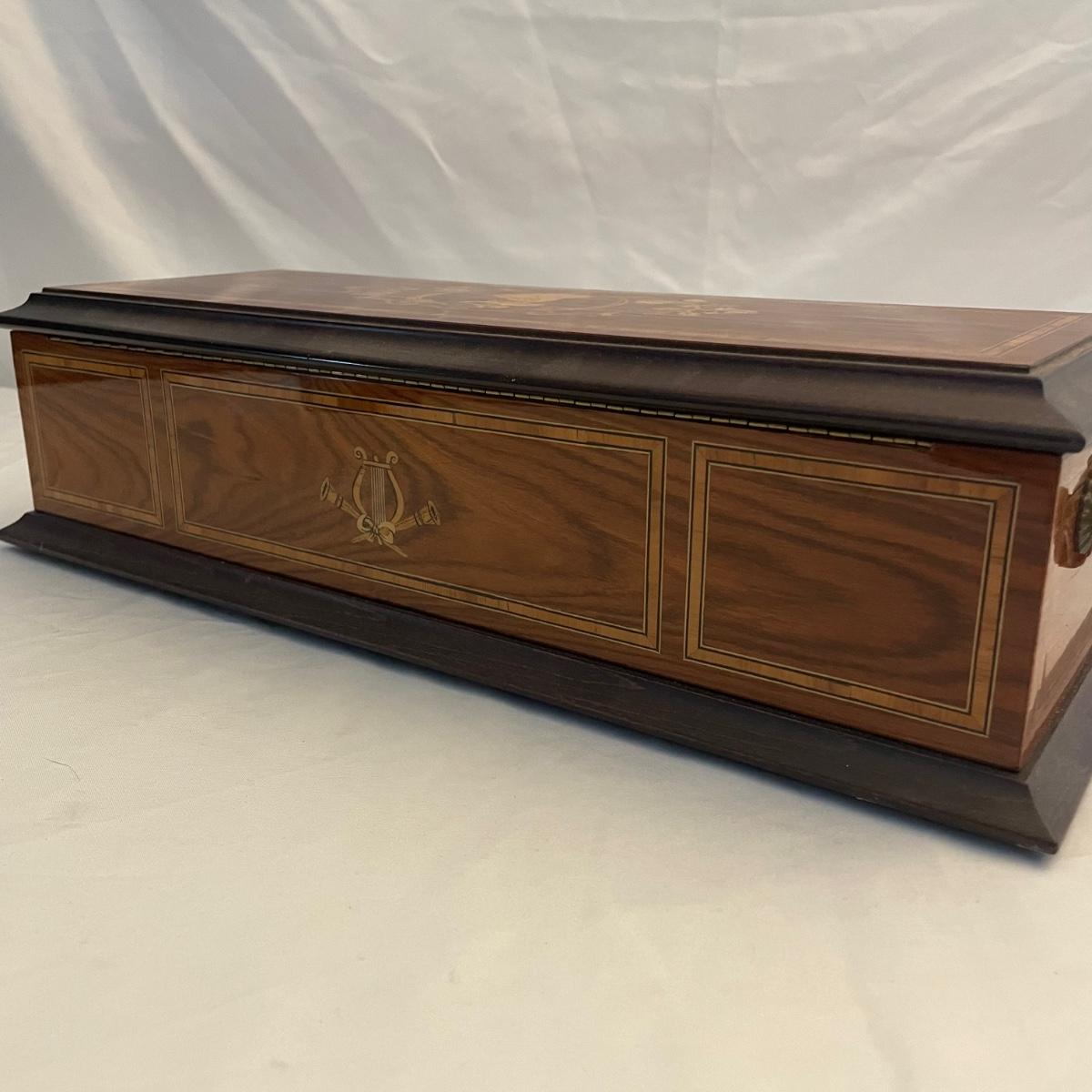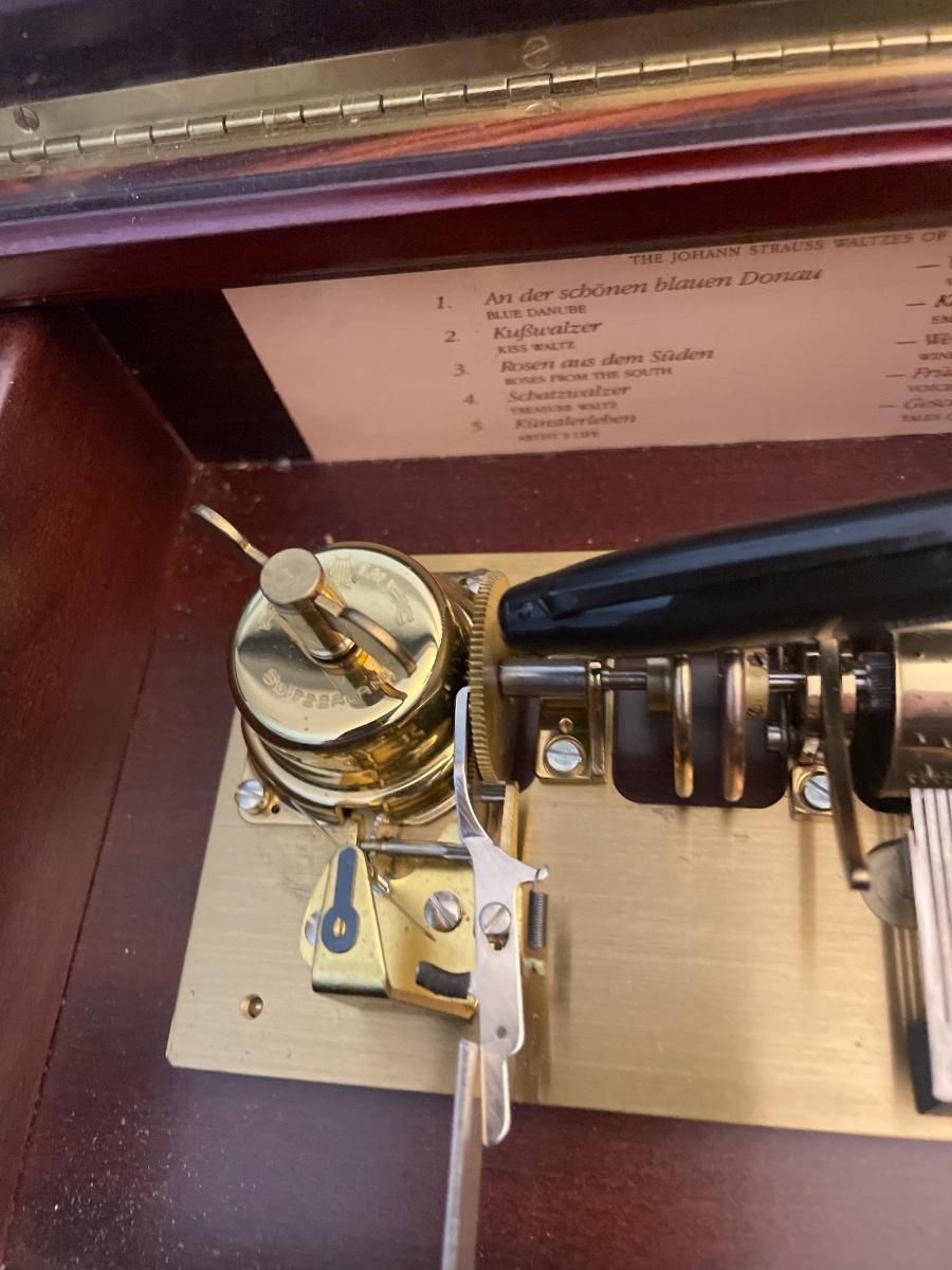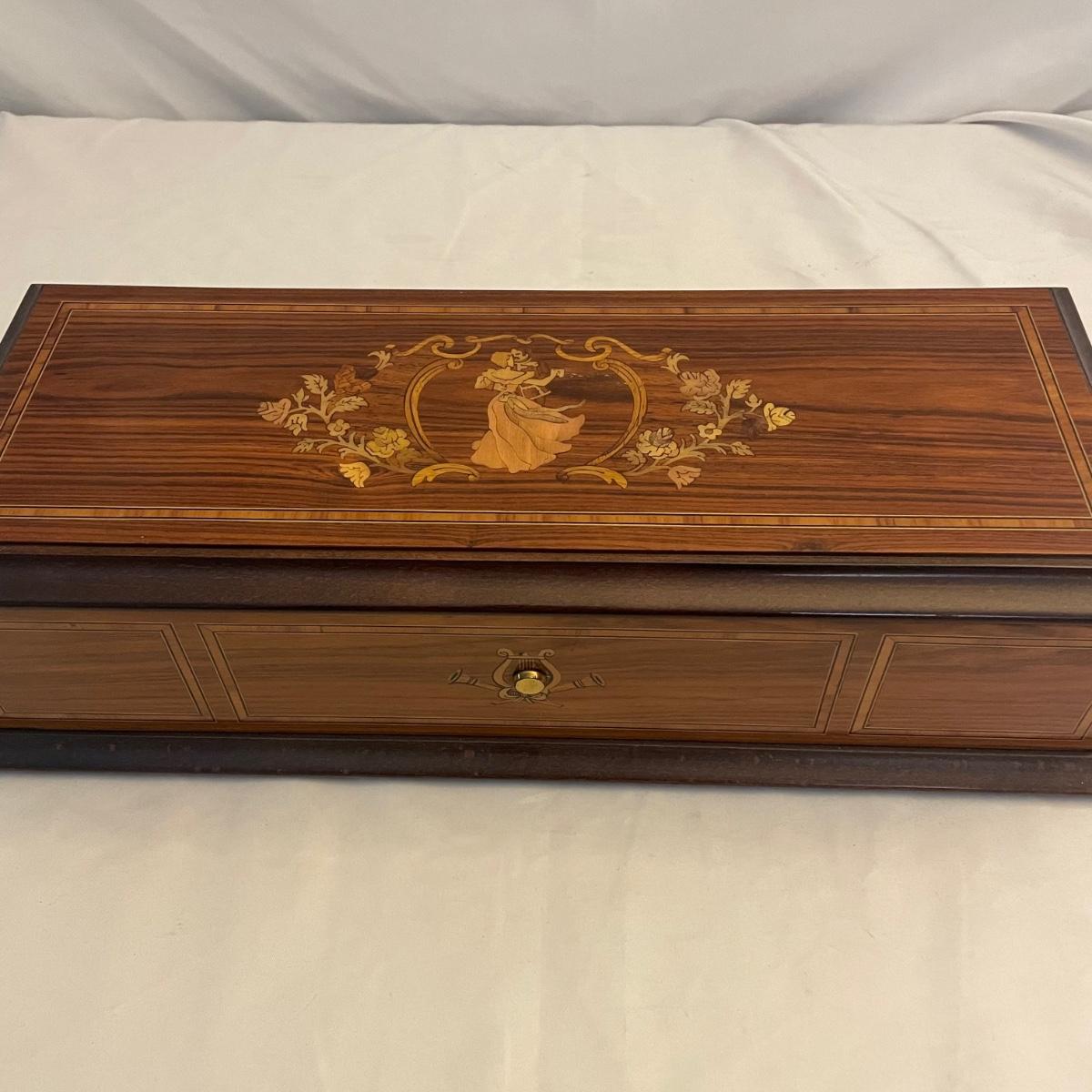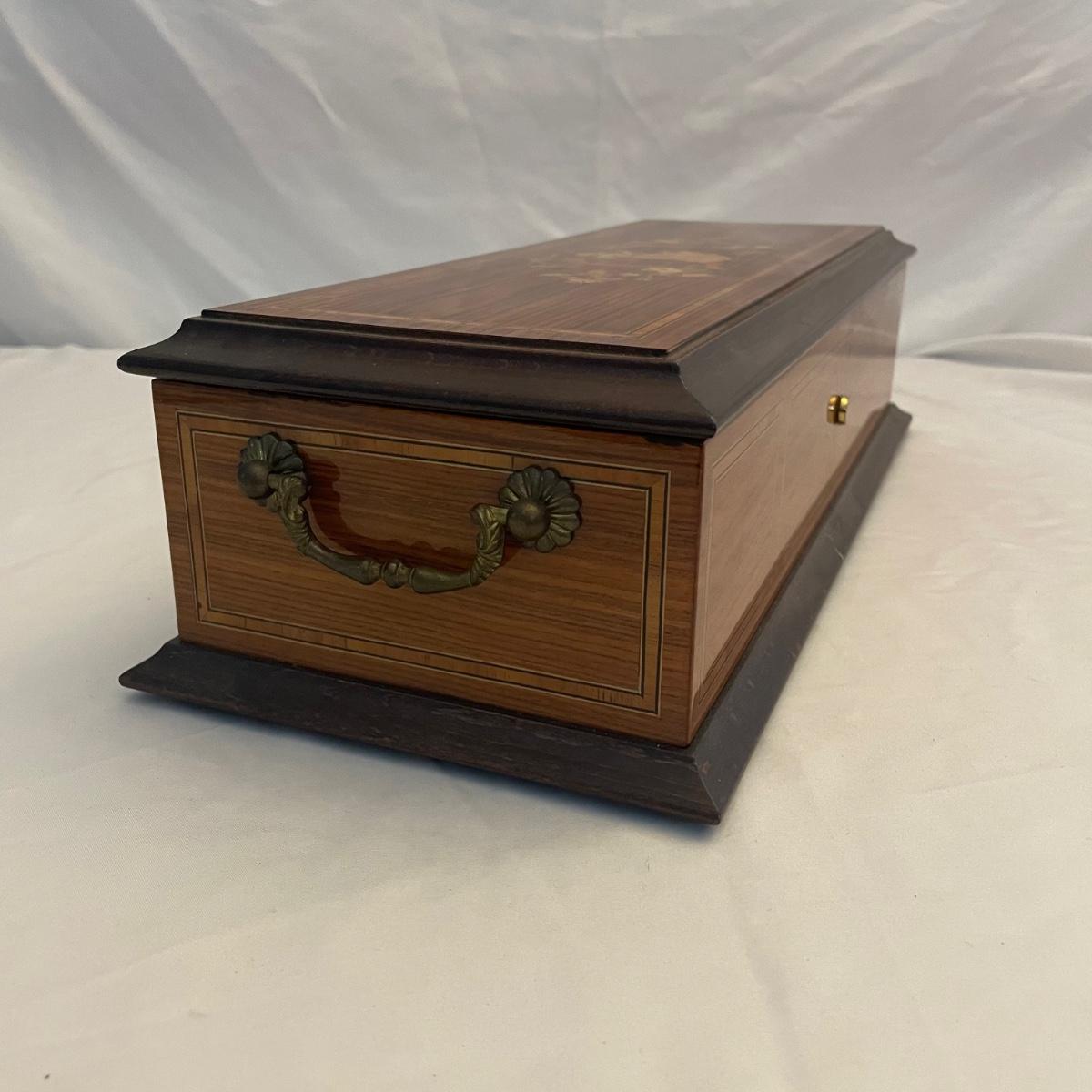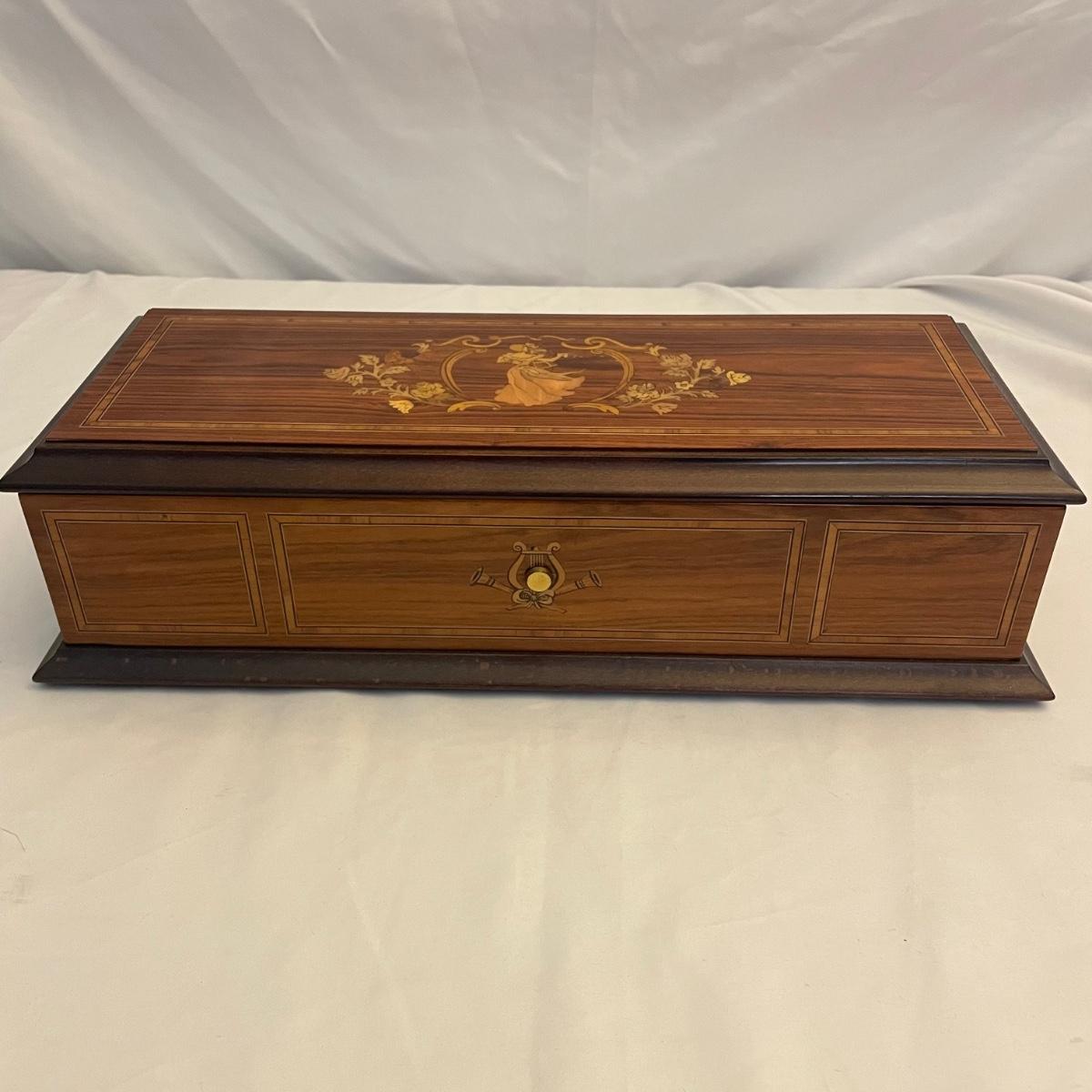 This beautifully crafted Franklin Mint music box has inlaid wood and brass handles. The music box interior contains five brass drums and a mirrored inside lid. It does need work to get it back to fully functioning; if you look at the image with the pen, it’s pointing to the wheel that does turn when pushed but should turn automatically when wound and currently does not.This piece is well worth the effort to get fixed, the notes are crystal clear and beautiful.
