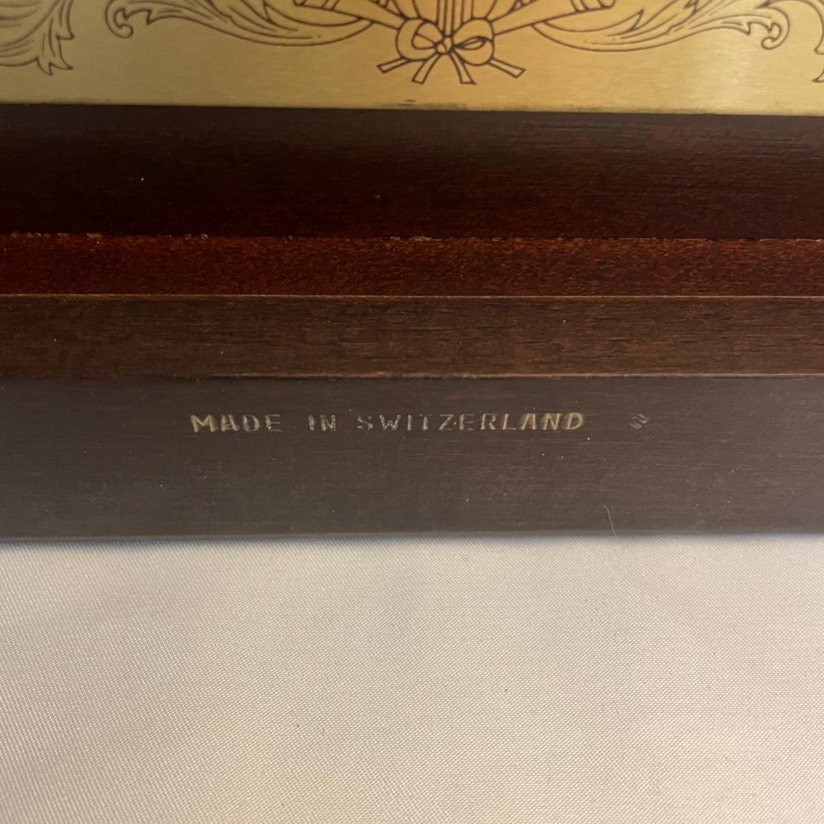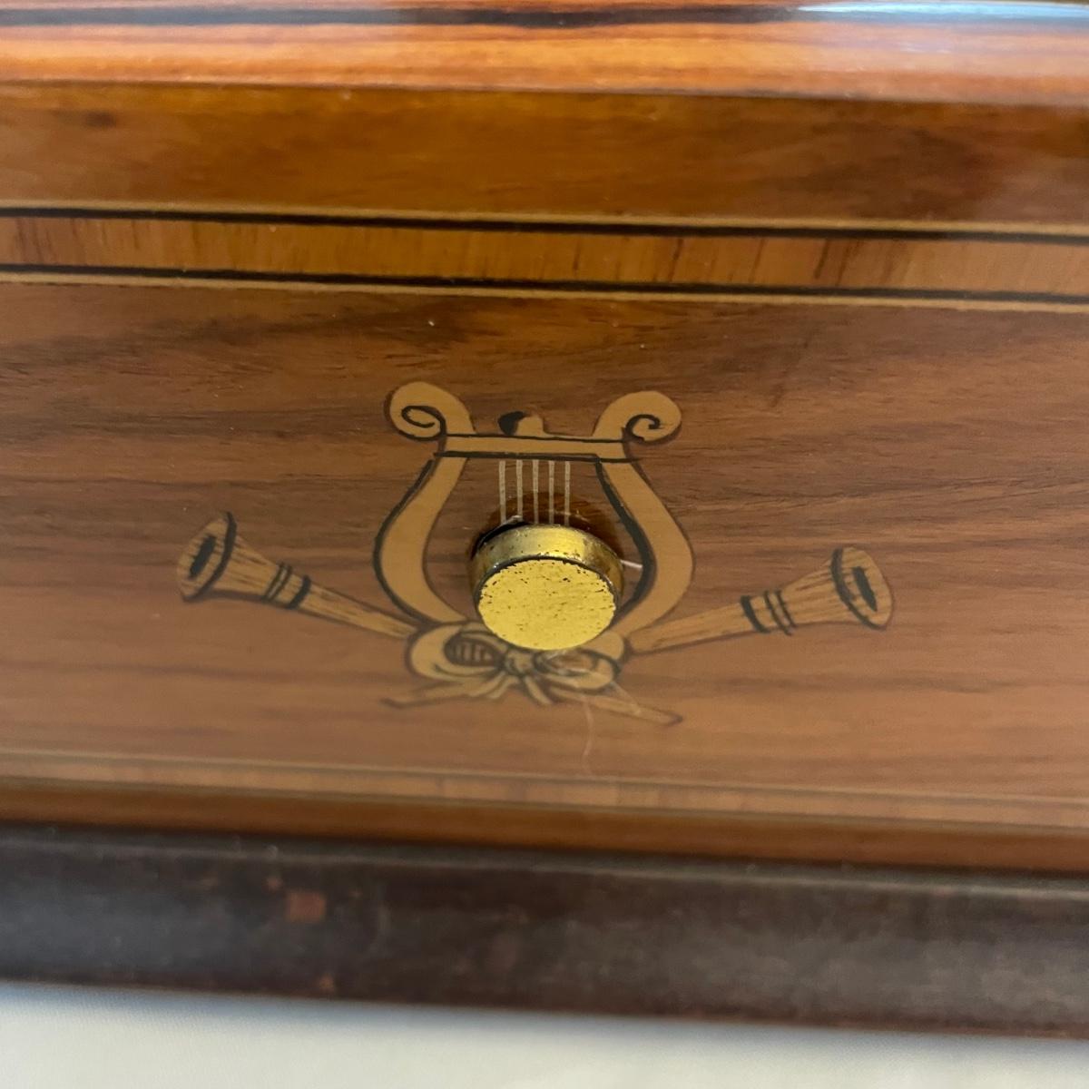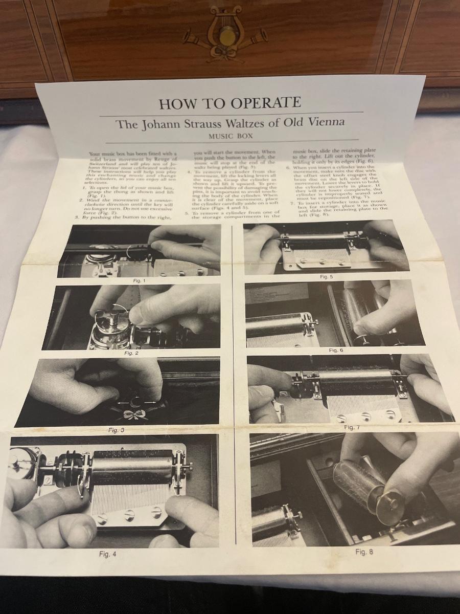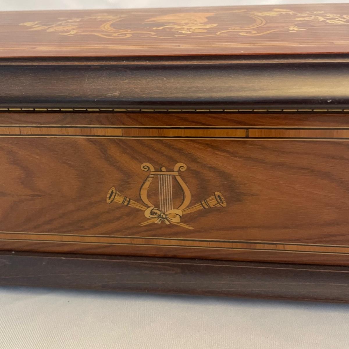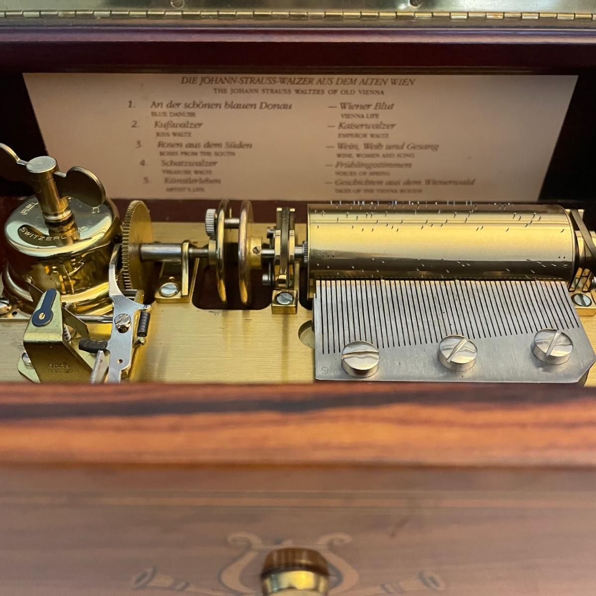 This beautifully crafted Franklin Mint music box has inlaid wood and brass handles. The music box interior contains five brass drums and a mirrored inside lid. It does need work to get it back to fully functioning; if you look at the image with the pen, it’s pointing to the wheel that does turn when pushed but should turn automatically when wound and currently does not.This piece is well worth the effort to get fixed, the notes are crystal clear and beautiful.