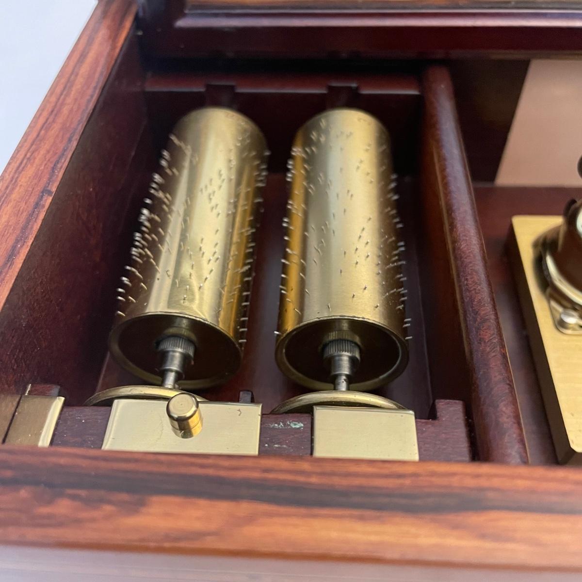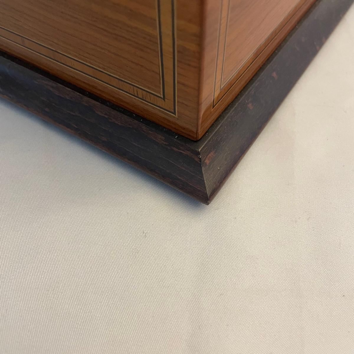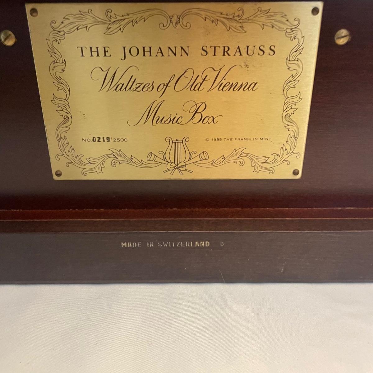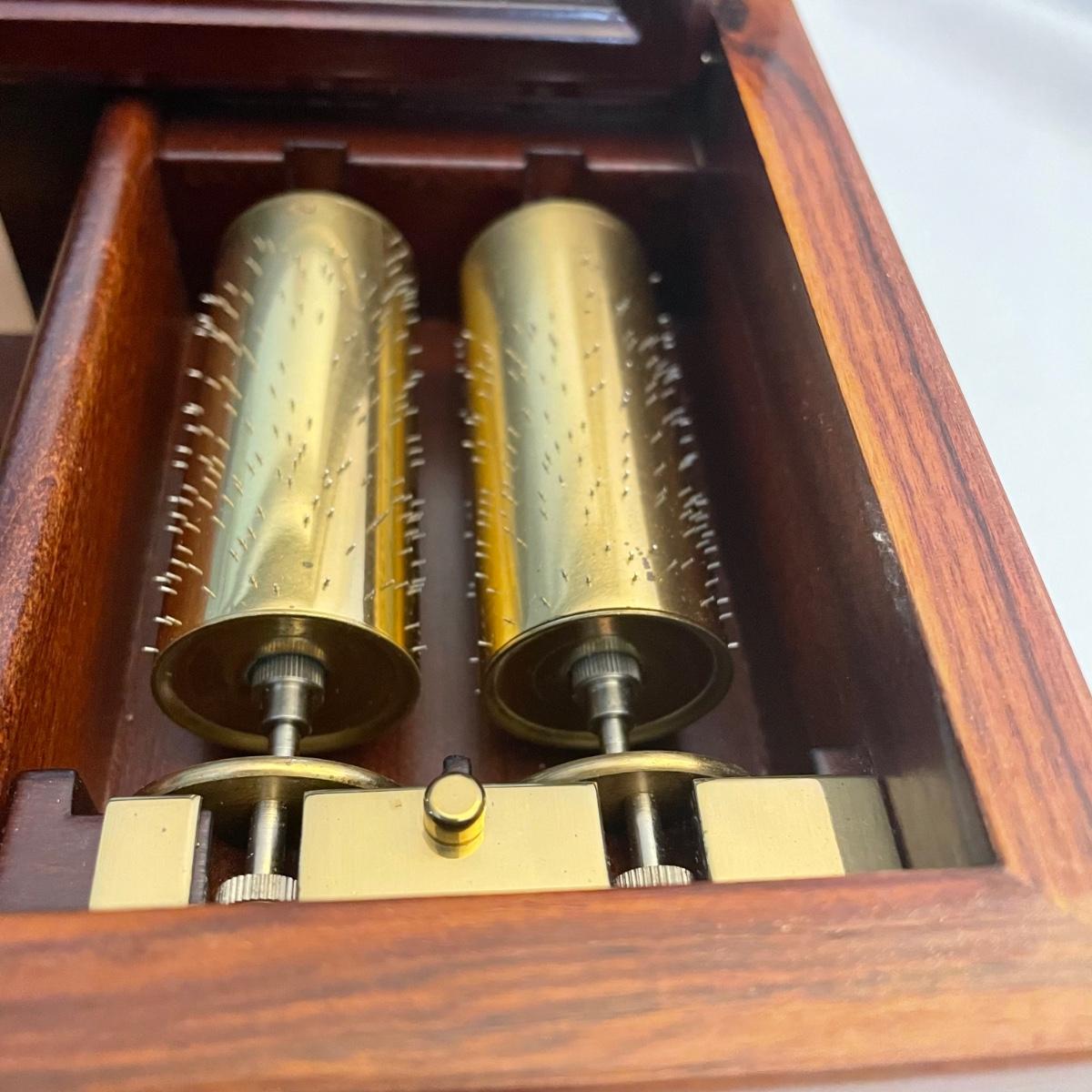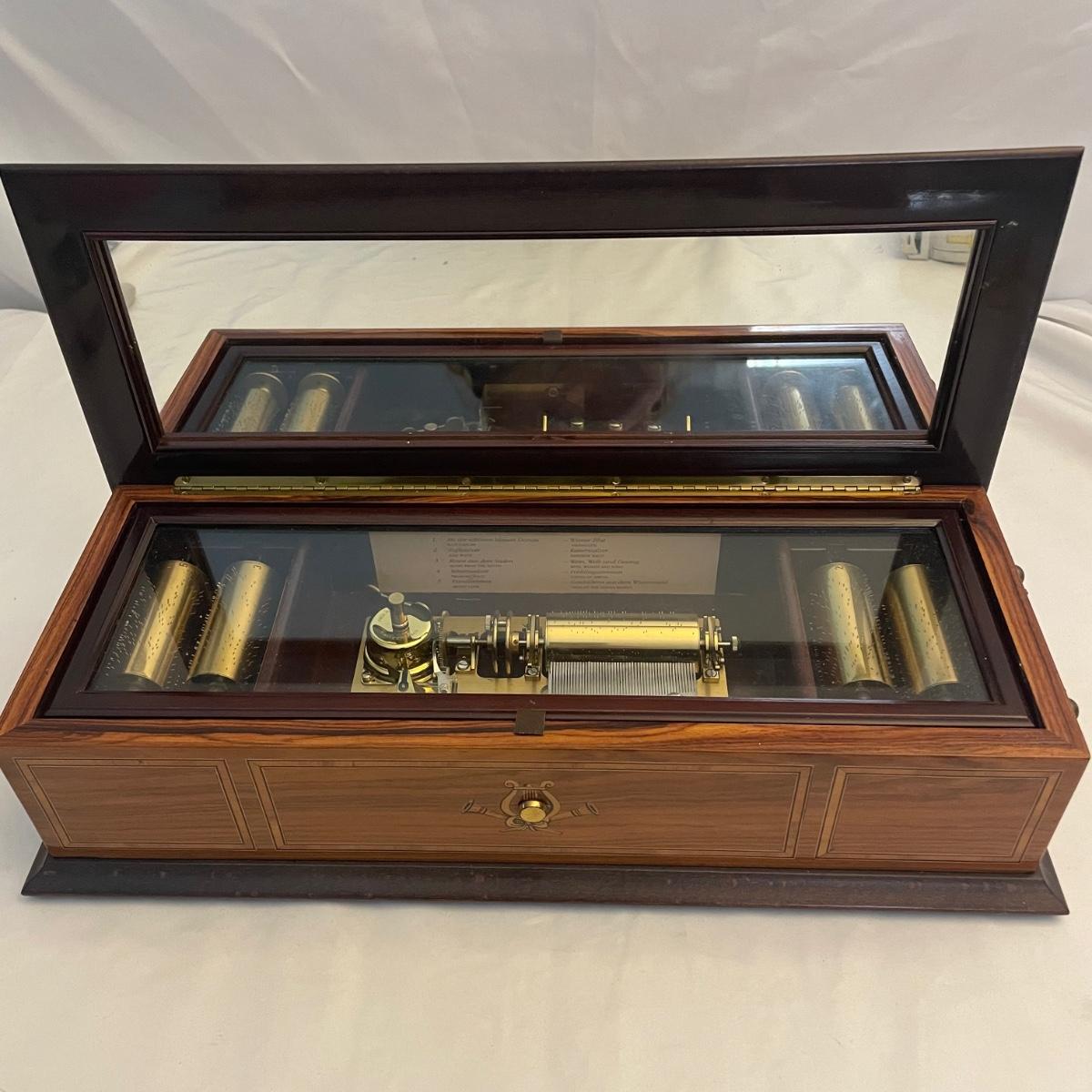 This beautifully crafted Franklin Mint music box has inlaid wood and brass handles. The music box interior contains five brass drums and a mirrored inside lid. It does need work to get it back to fully functioning; if you look at the image with the pen, it’s pointing to the wheel that does turn when pushed but should turn automatically when wound and currently does not.This piece is well worth the effort to get fixed, the notes are crystal clear and beautiful.