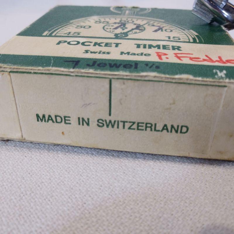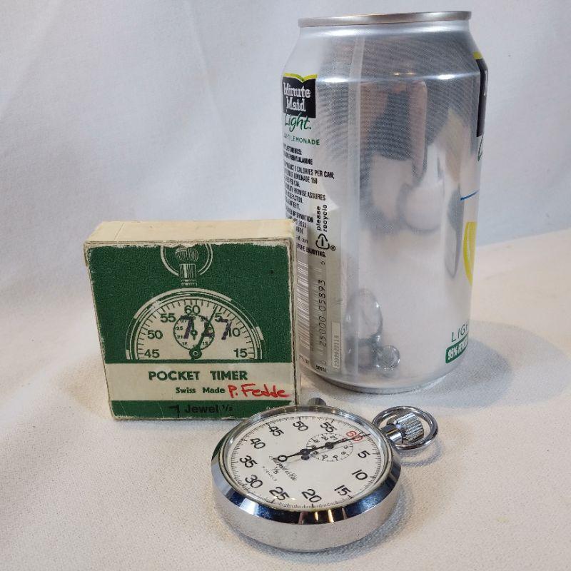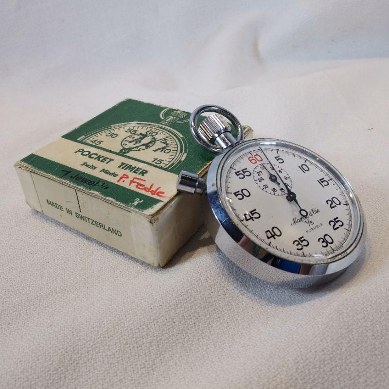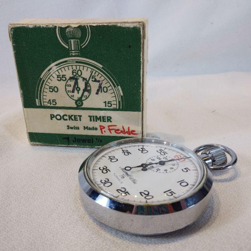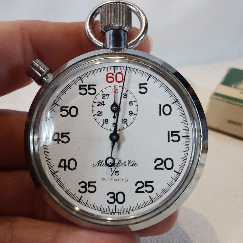 This offering is a wonderful Swiss-made pocket timer in the original box. Face of watch reads Marcel & Cie 1/5 - 7 jewels. Box is 2 1/2-inches square. Works great - appears unused. Excellent gift for sports coach or track athletes.